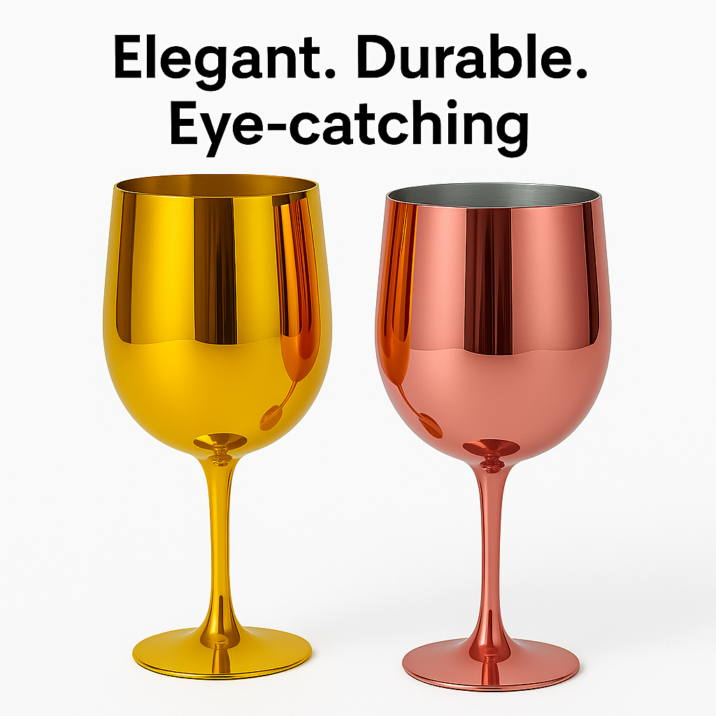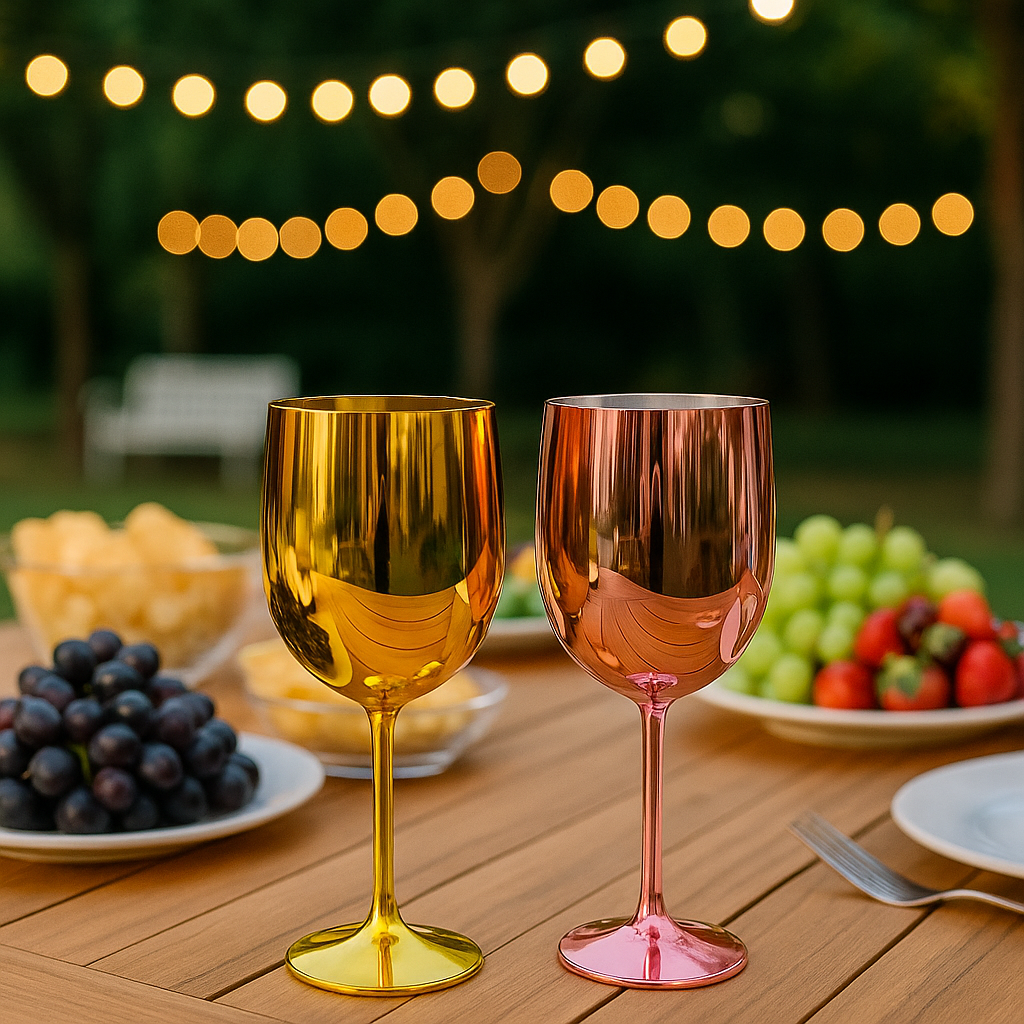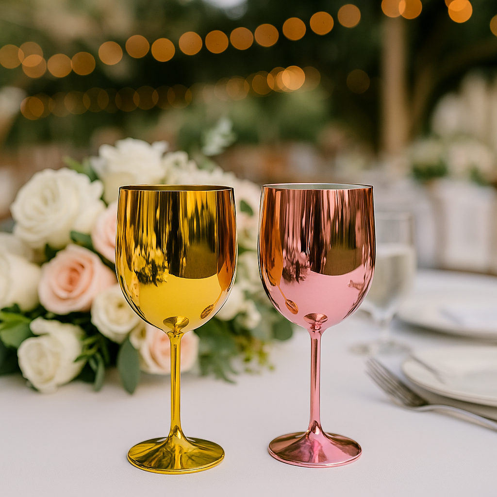 Elegant, durable, and eye-catching wine cups made of food-grade plastic with a reflective metallic coating.
