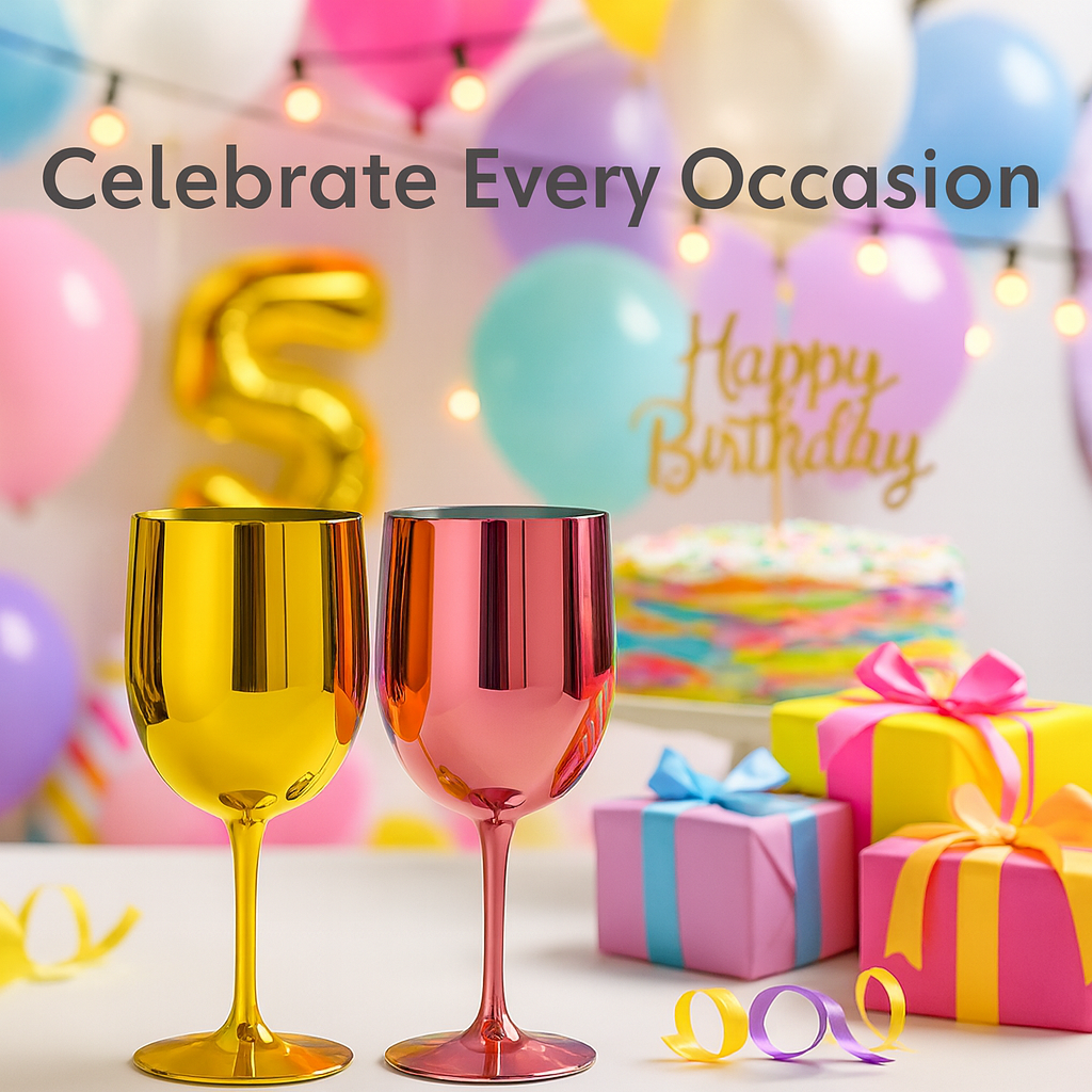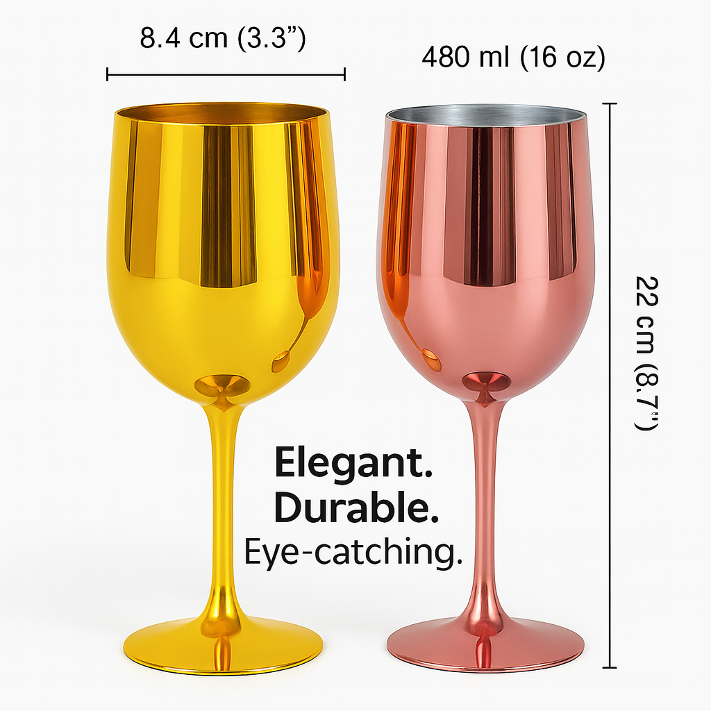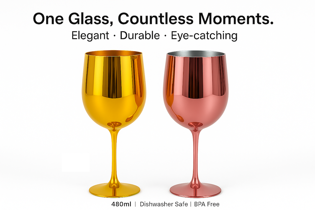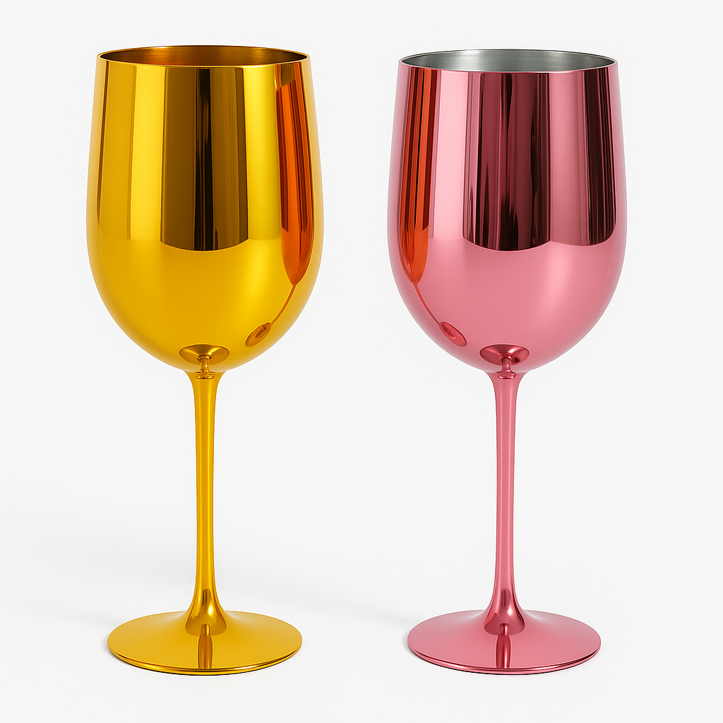 Elegant, durable, and eye-catching wine cups made of food-grade plastic with a reflective metallic coating.