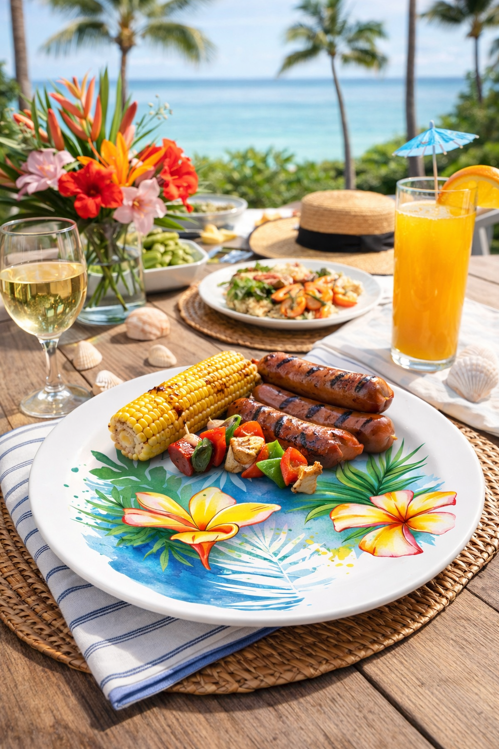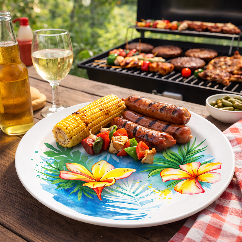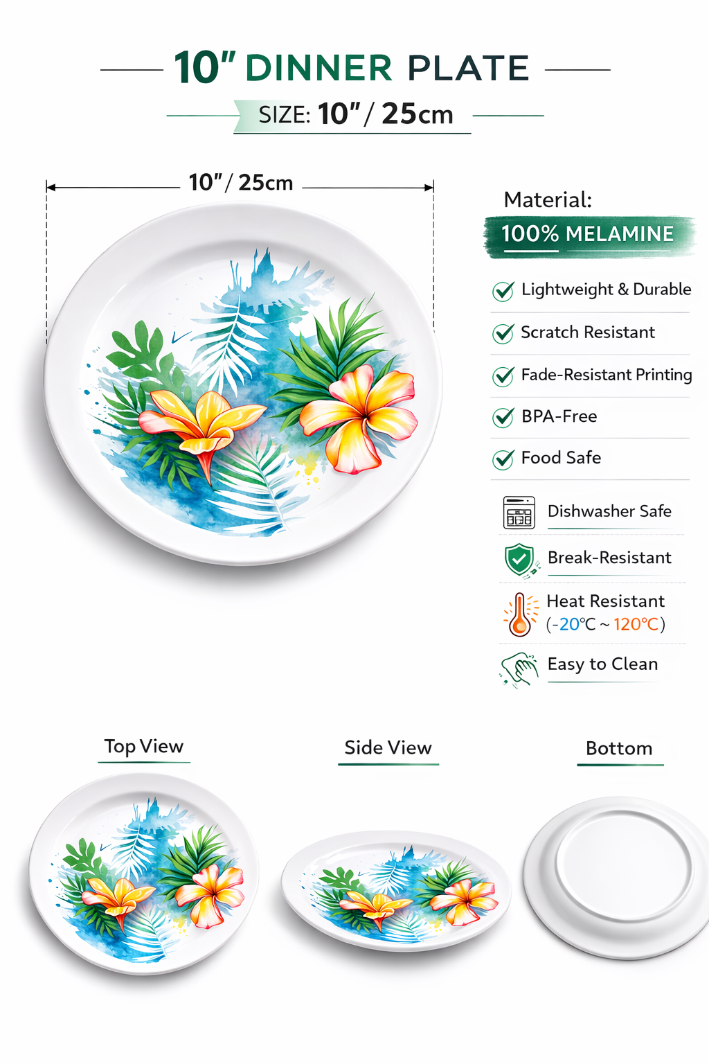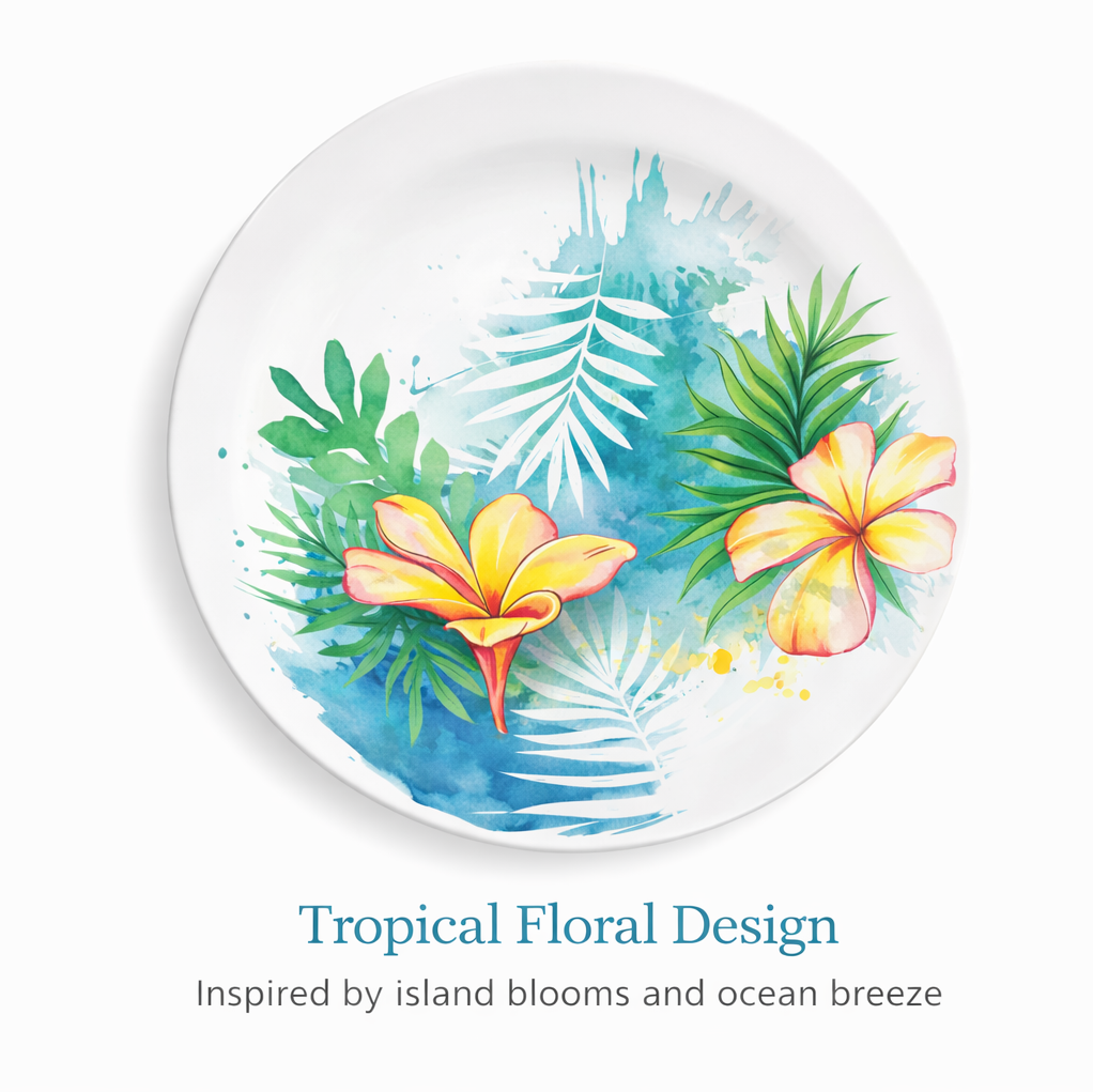 Inspired by tropical island blooms, this 10” melamine dinner plate brings a fresh resort feel to outdoor dining. Durable, lightweight, and commercial-grade — perfect for hospitality use.