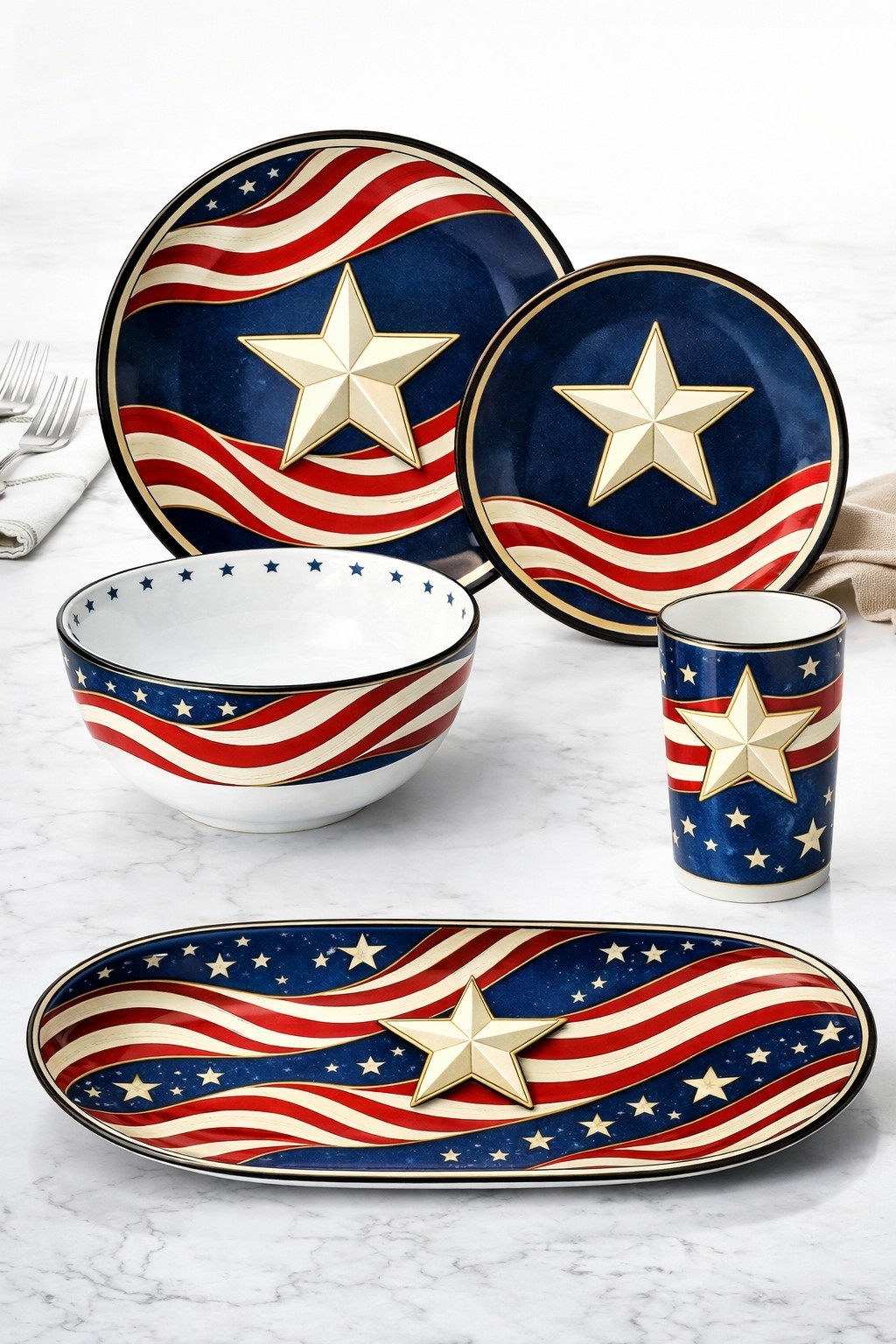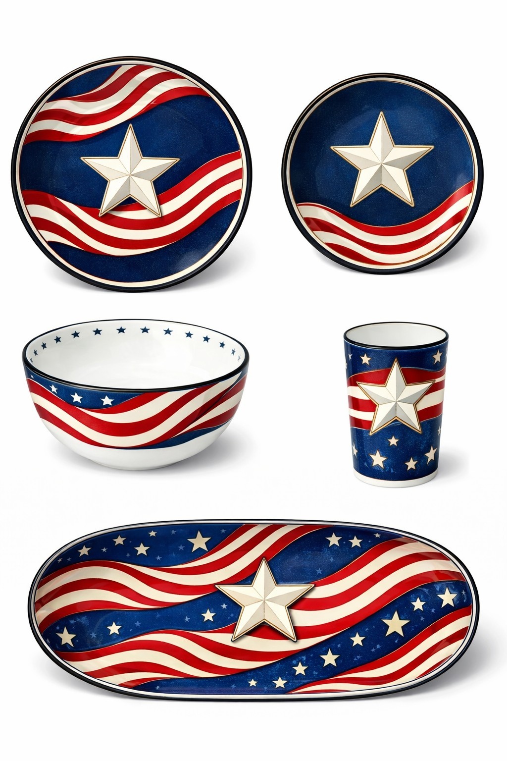 Includes plates, bowl, cup, and serving platter