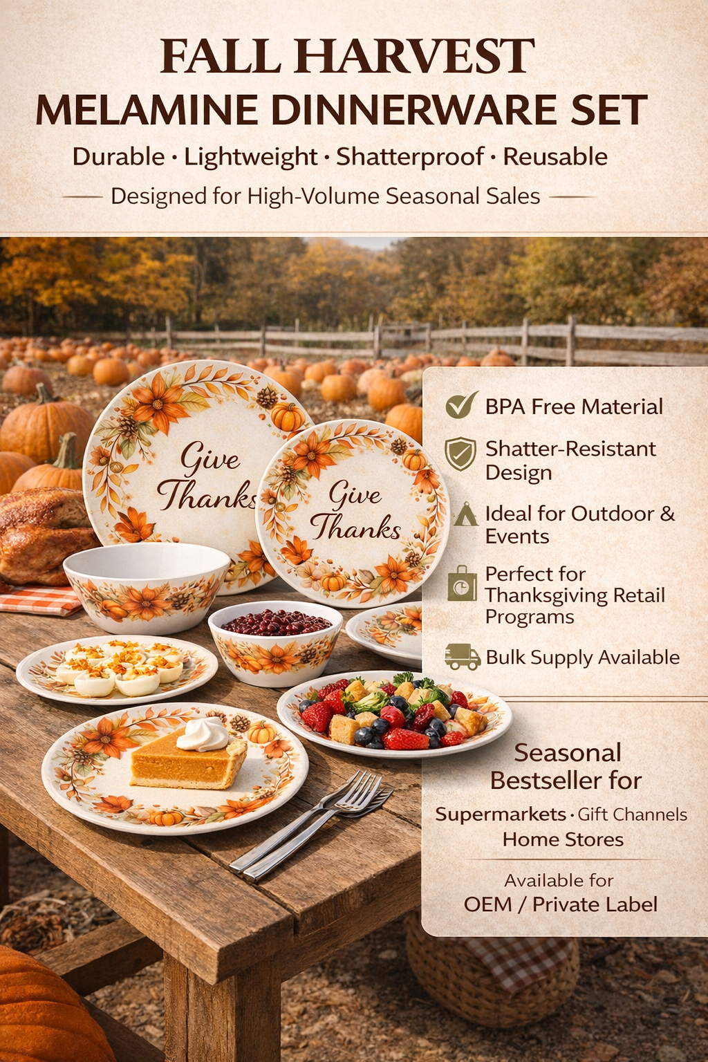 • Perfect for Thanksgiving promotions, fall retail programs, supermarkets, and gift channels
