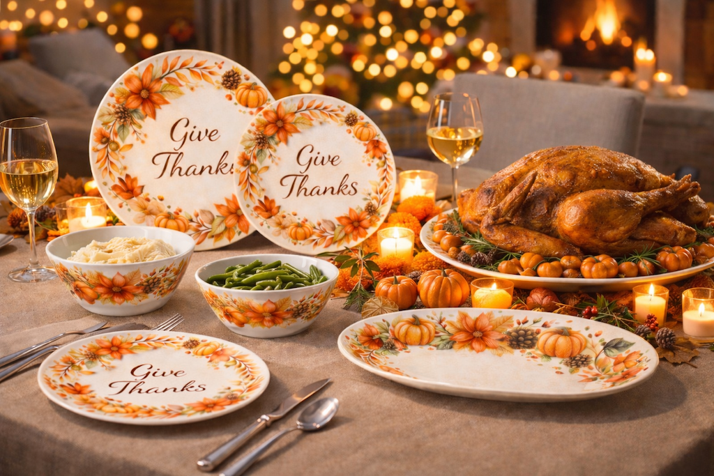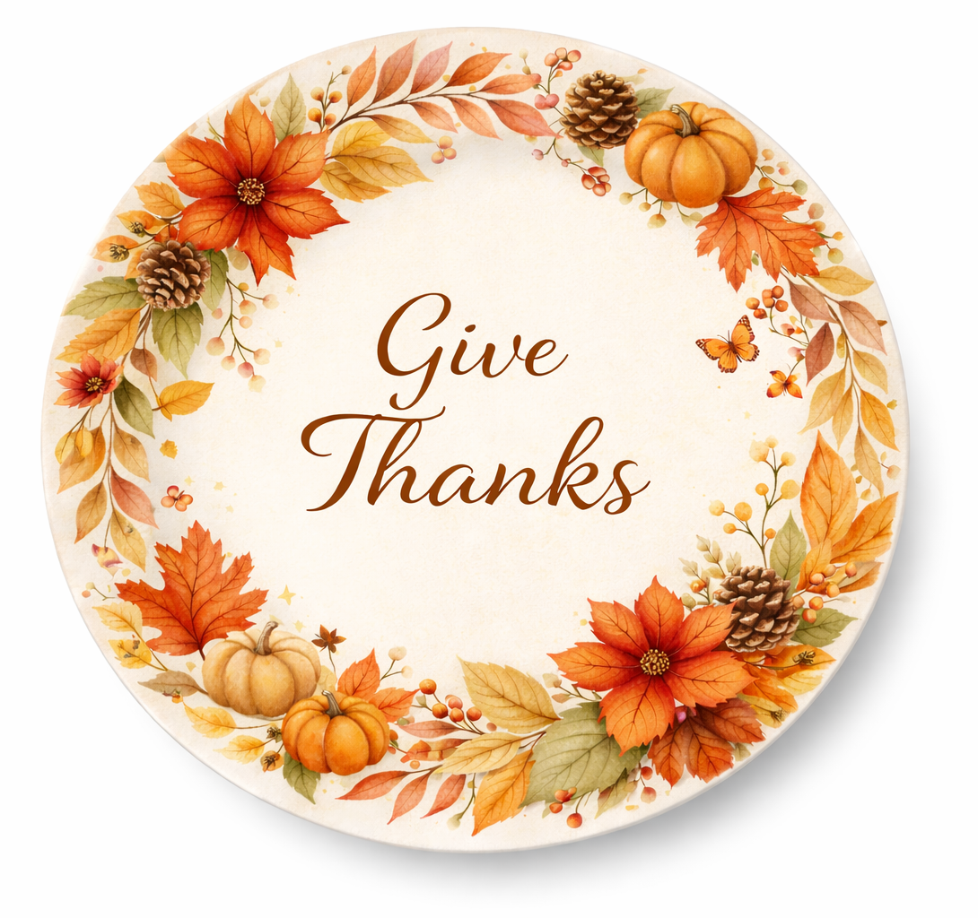 • Inspired by autumn harvest and Thanksgiving gatherings, featuring pumpkin and foliage wreath artwork that symbolizes warmth and togetherness