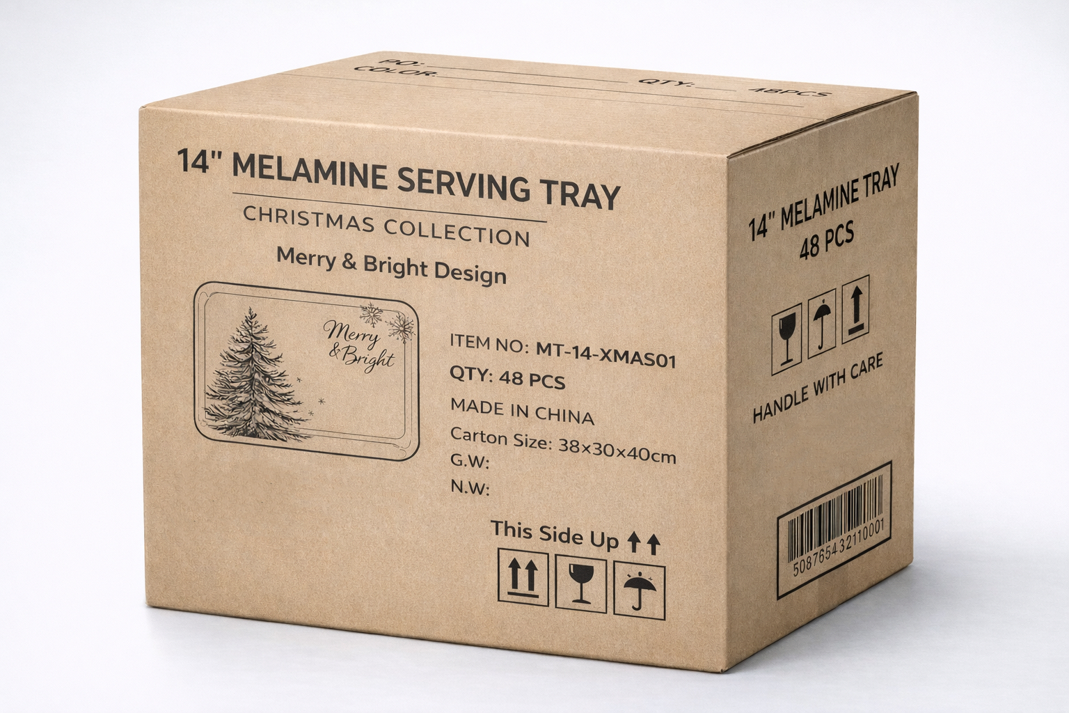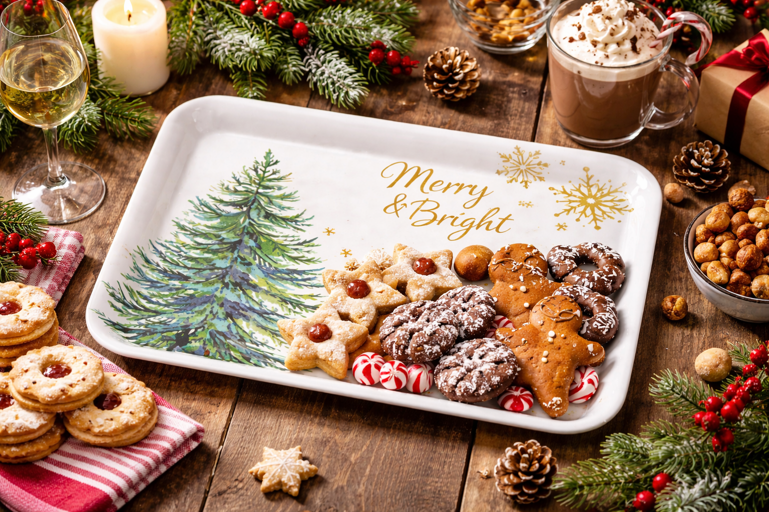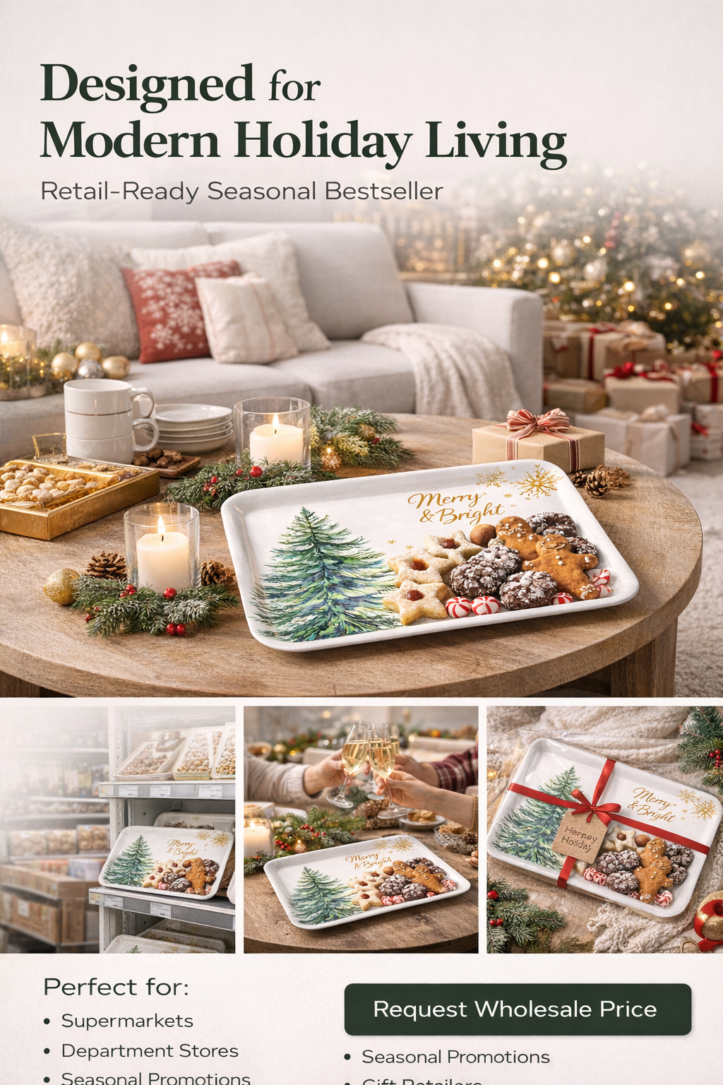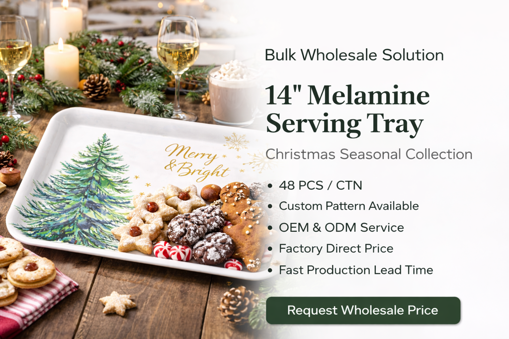 14" Christmas melamine serving tray with festive design, ideal for holiday retail and promotions.