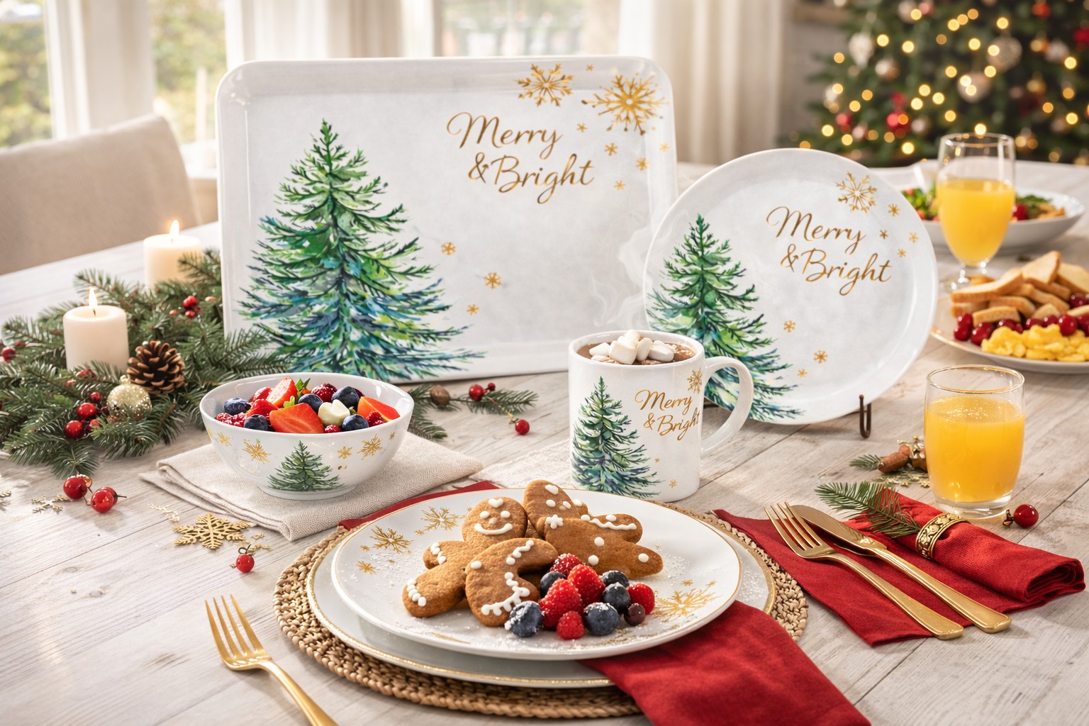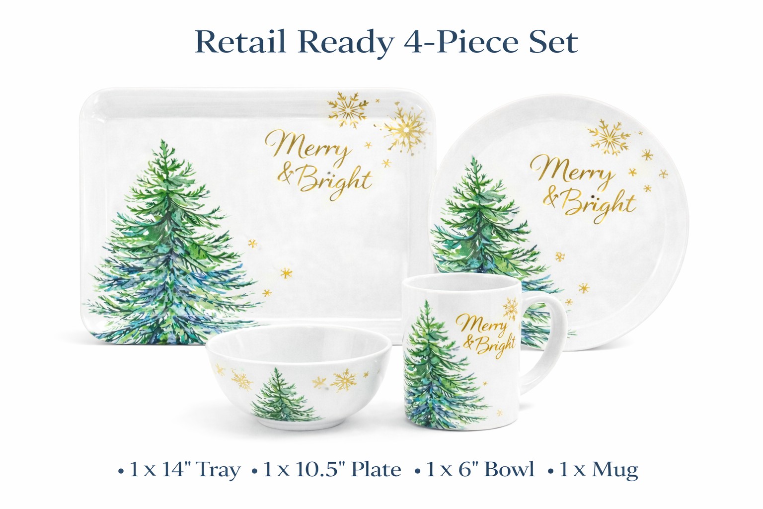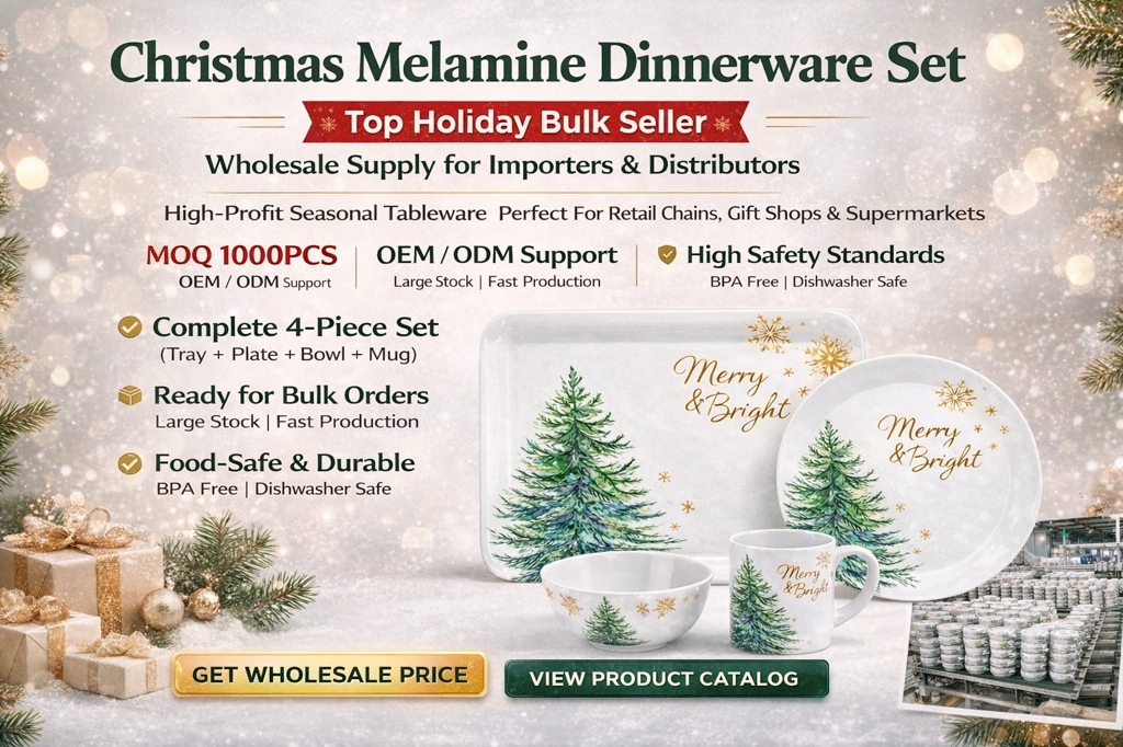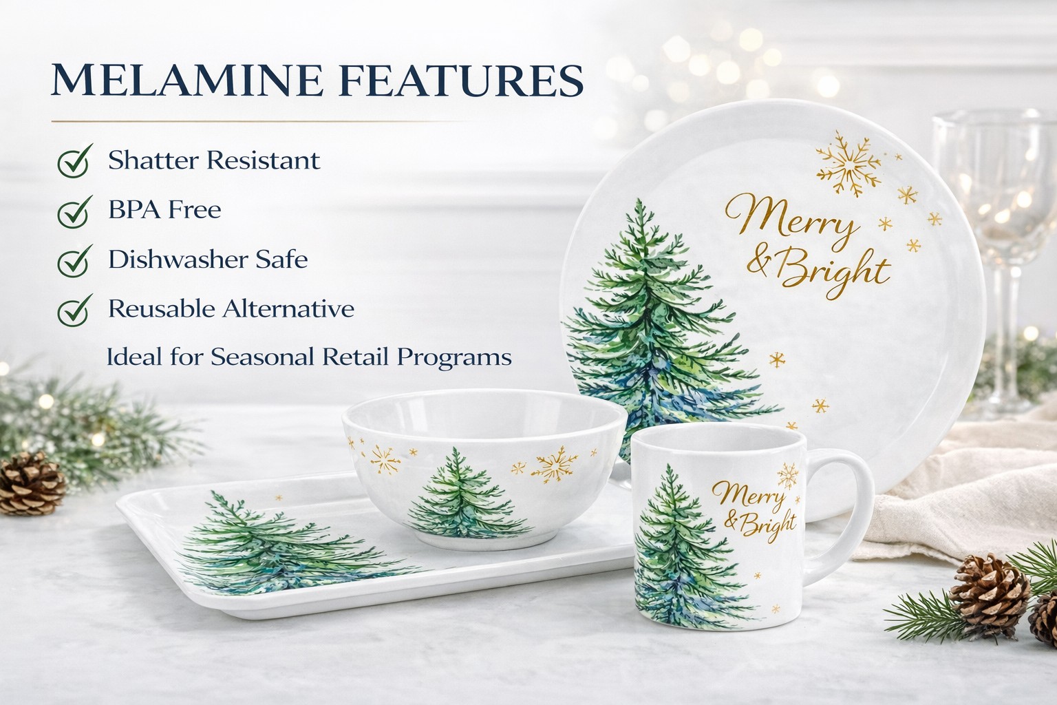 Festive 4-piece Christmas melamine dinnerware set, ideal for holiday retail and gift programs.