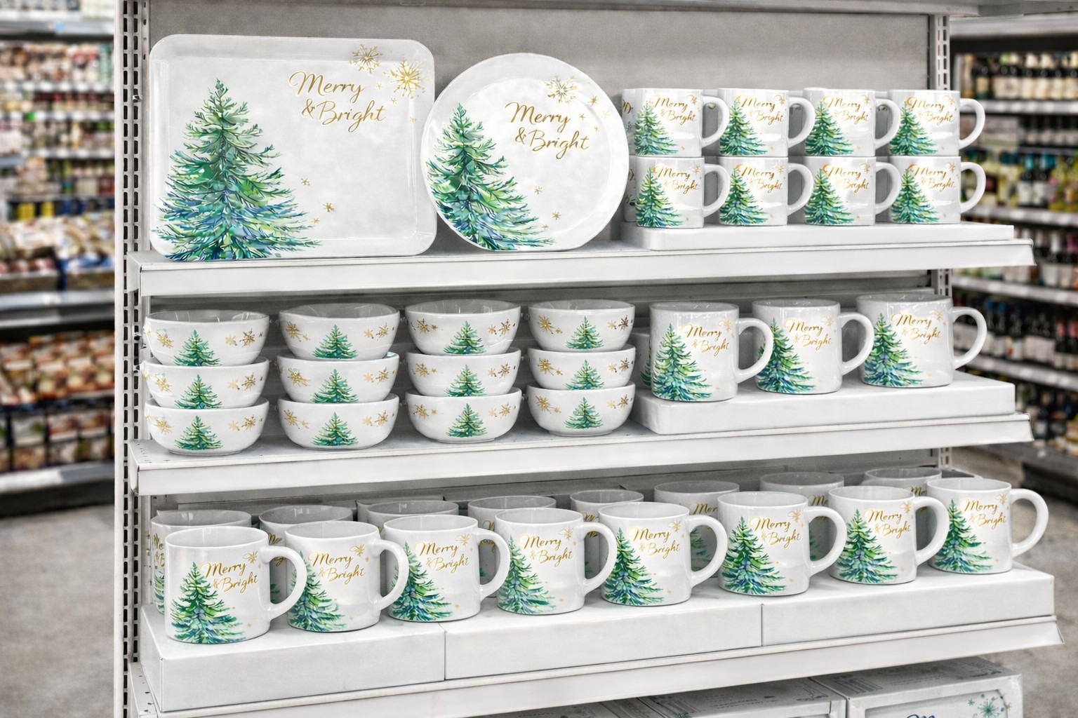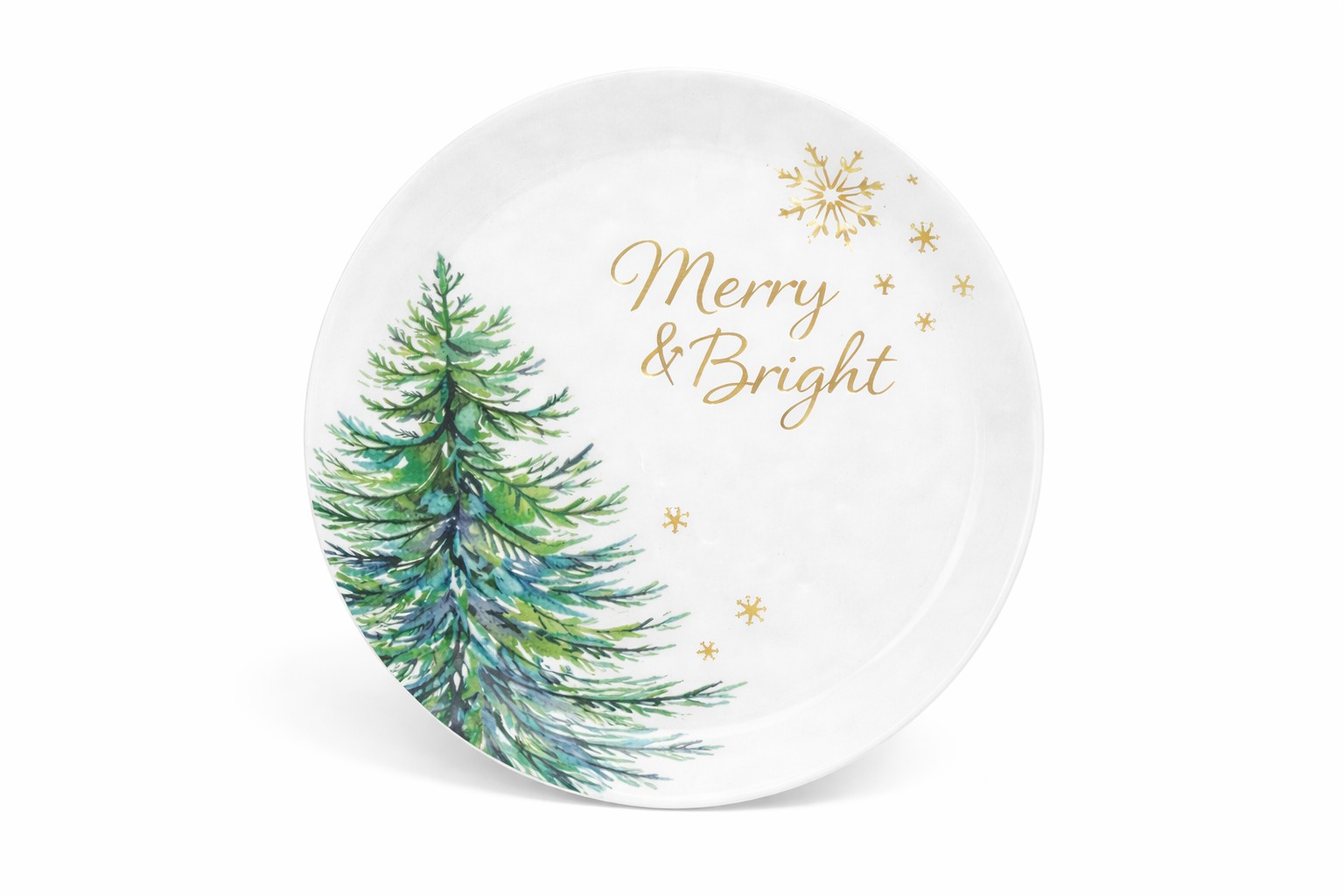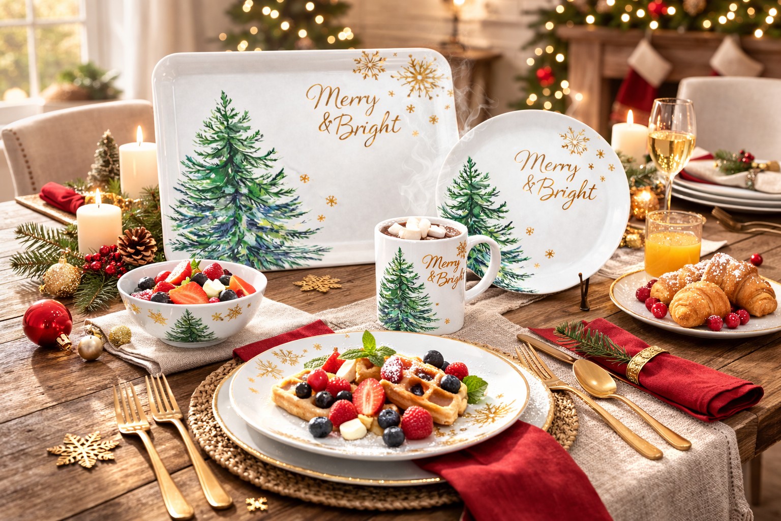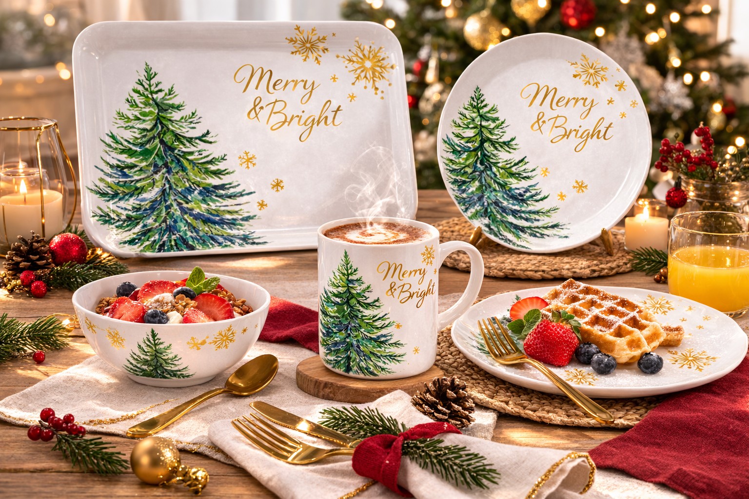 Festive 4-piece Christmas melamine dinnerware set, ideal for holiday retail and gift programs.