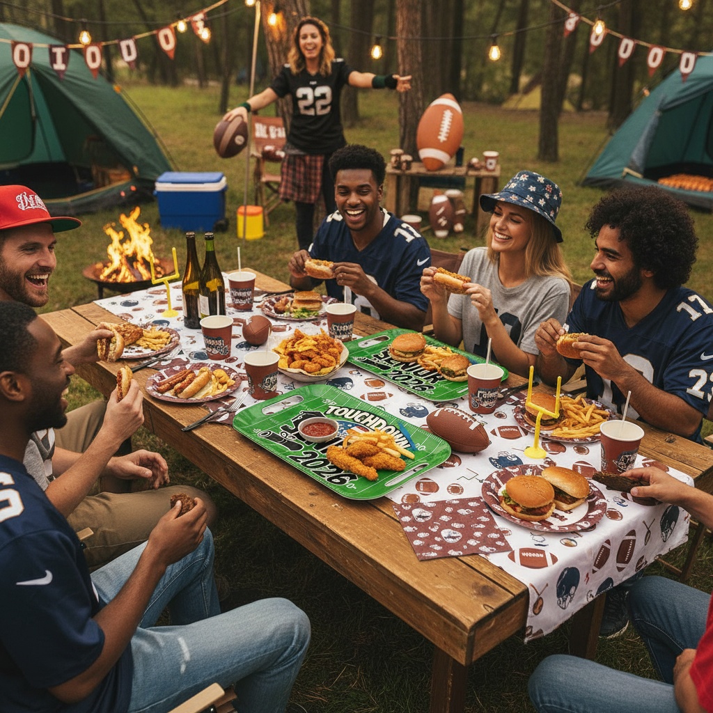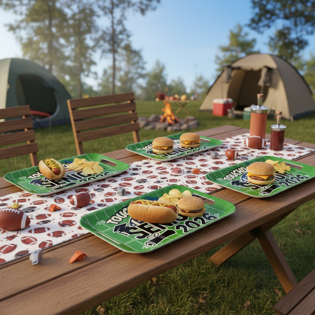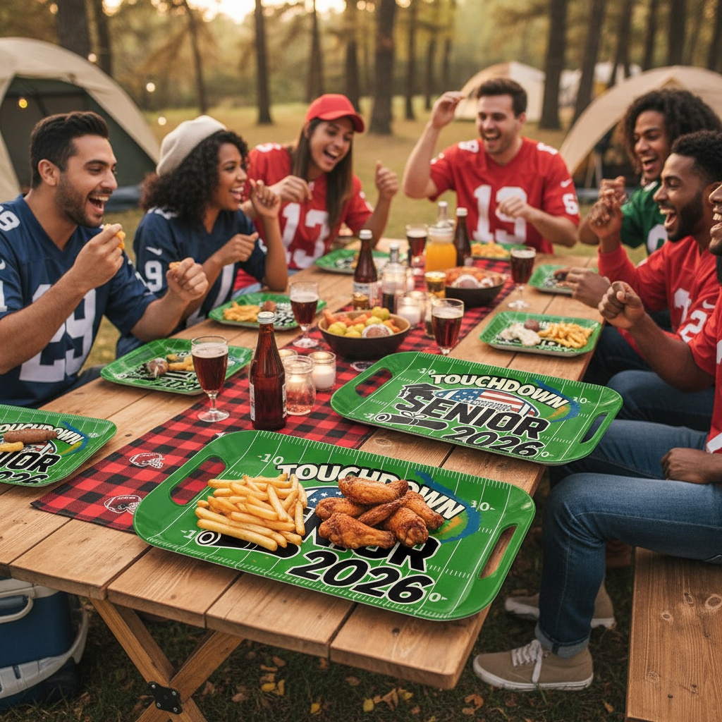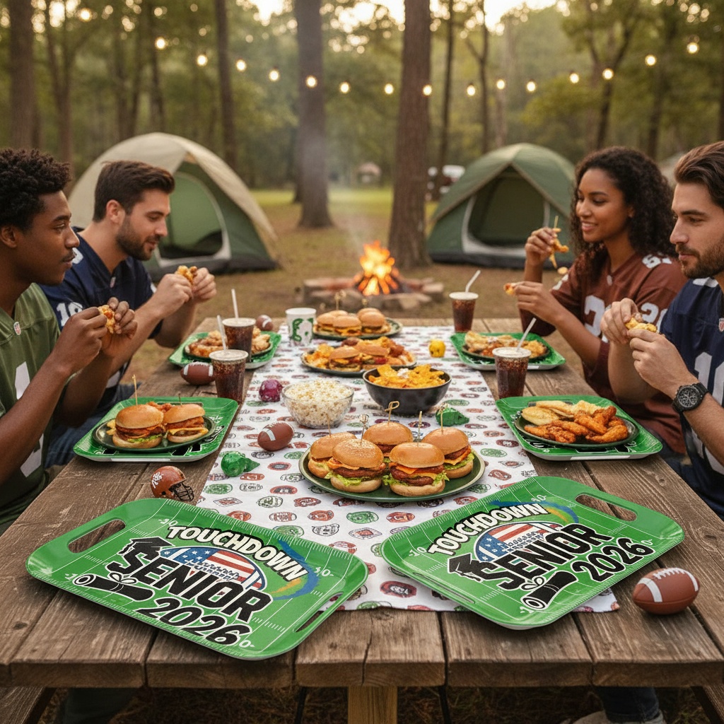 Graphic Elements: American flag football, graduation cap, diploma scroll