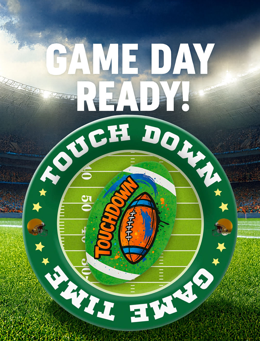 Add a splash of color and energy to your tailgate with this 11-inch game day melamine dinner plate featuring a bold cartoon-style football and touchdown art. Ideal for football-themed parties and outdoor feasts.
