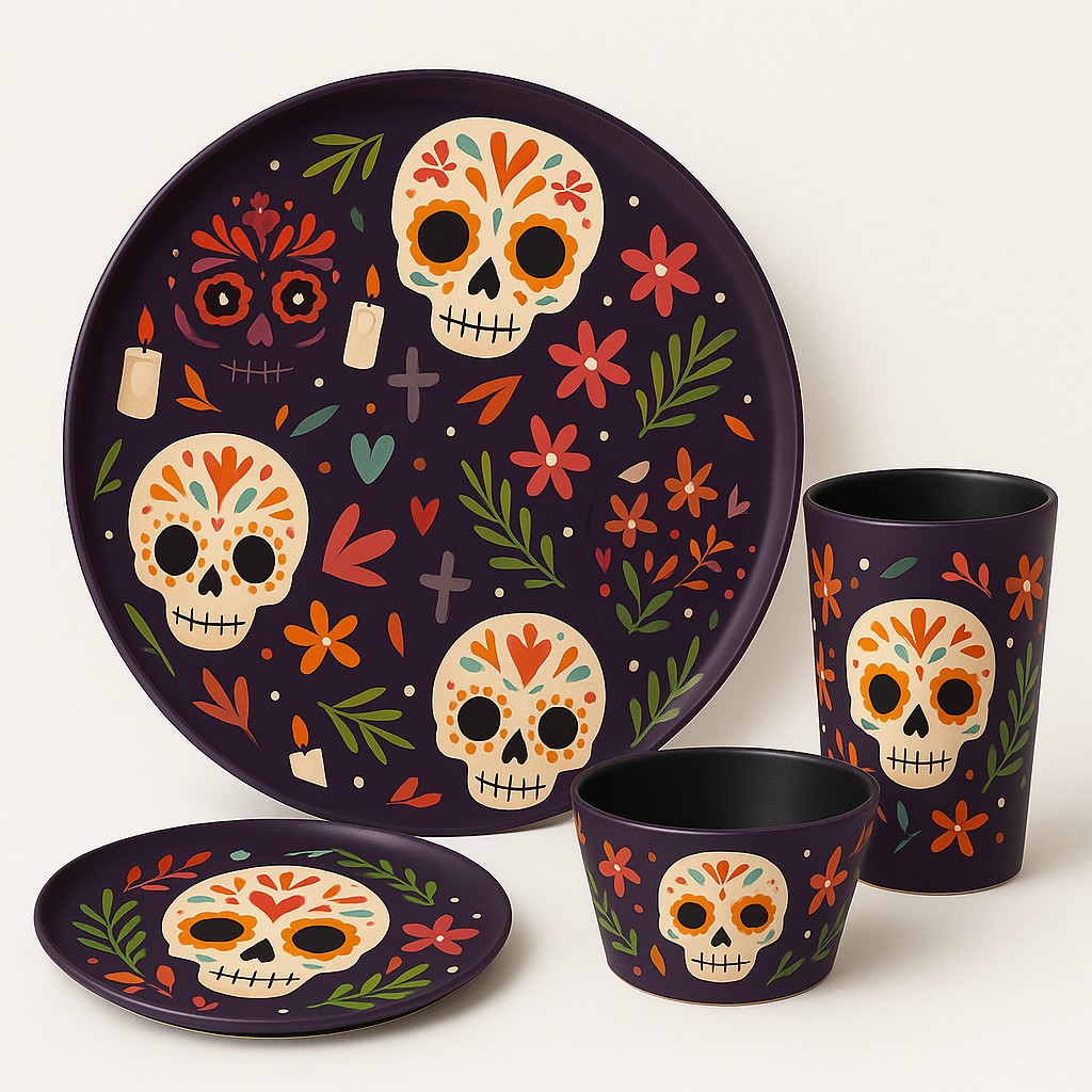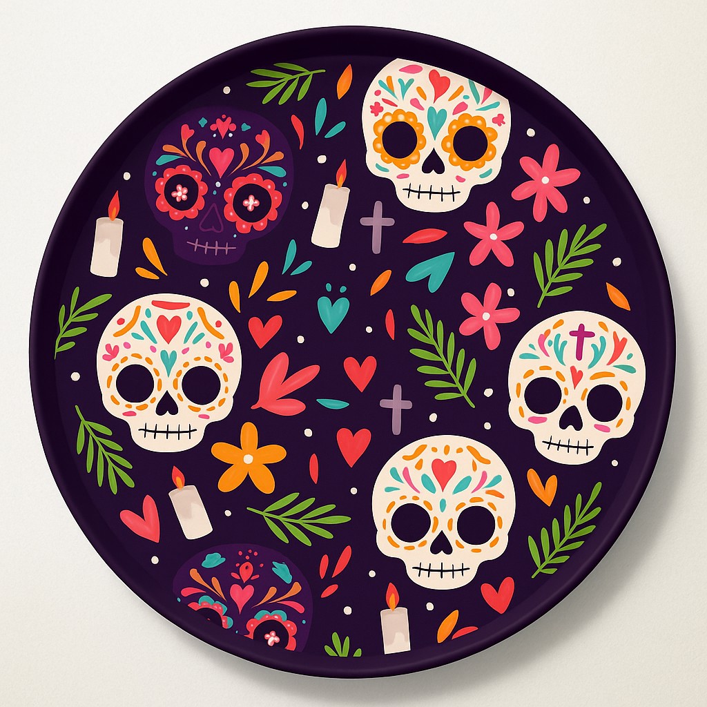 This 12 inch Sugar Skull melamine round plate is inspired by the vibrant art of Day of the Dead, featuring bold floral skull patterns that instantly stand out. Whether you're hosting a party or enjoying a casual family meal, this plate turns every dish into a visual celebration.