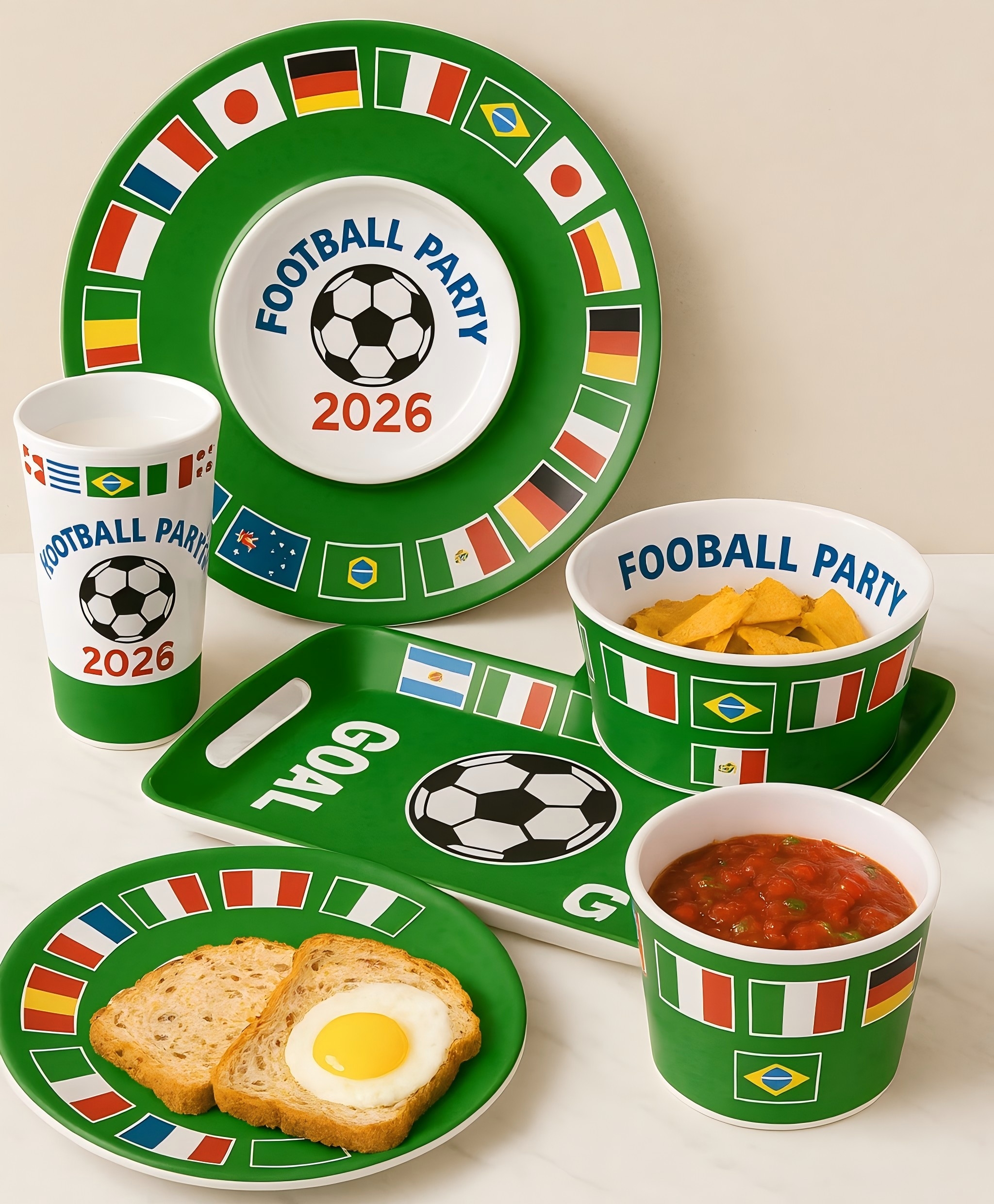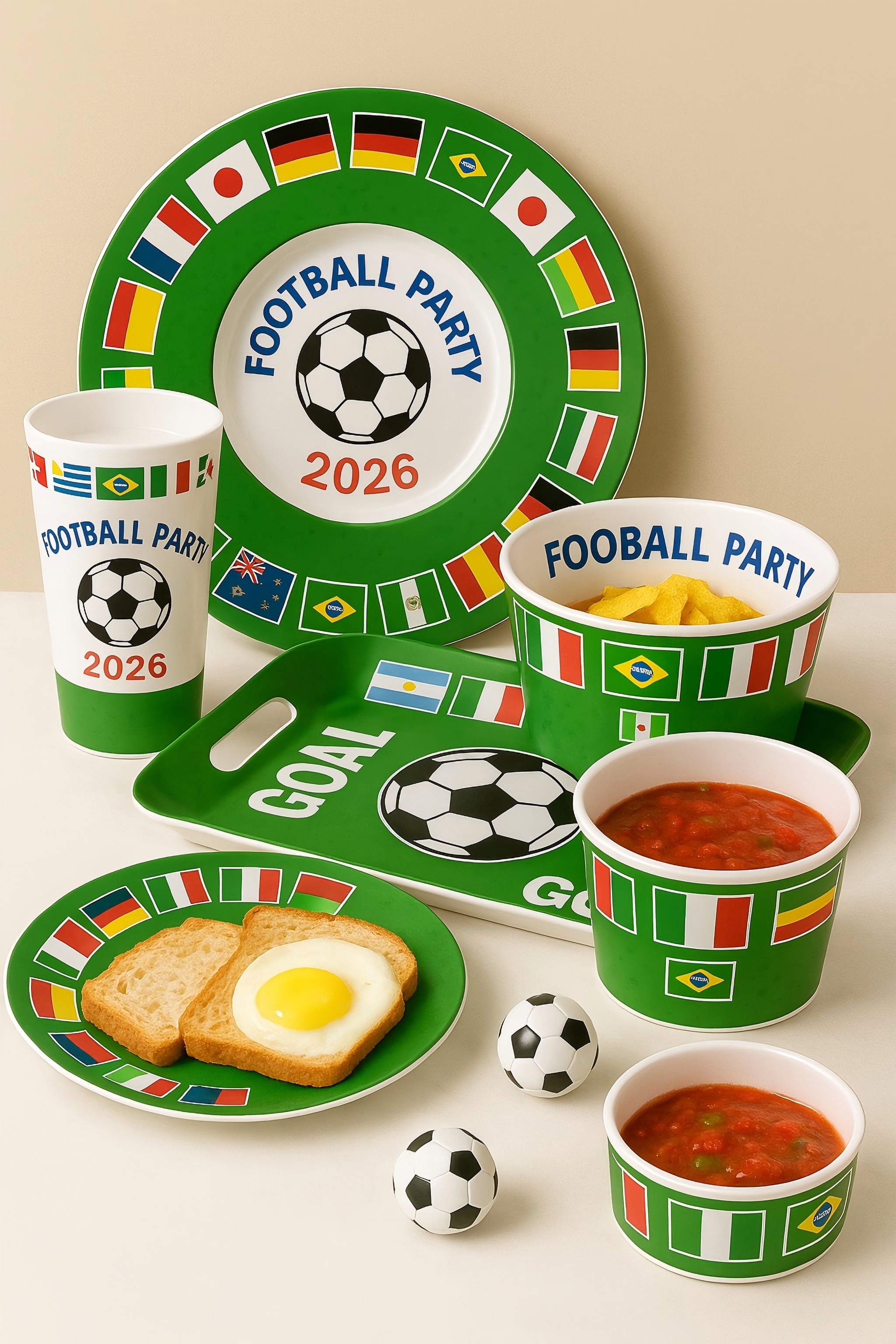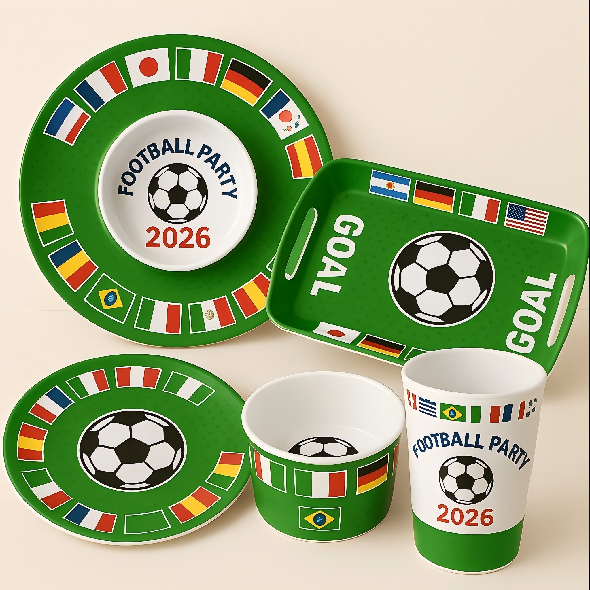 Bring the excitement of the 2026 football season to your table with this all-in-one Football Party melamine tableware set! Featuring international flags, bold soccer graphics, and BPA-free melamine, this set includes plates, bowls, cups, and a tray – perfect for football parties, game nights, BBQs, and festive gatherings.