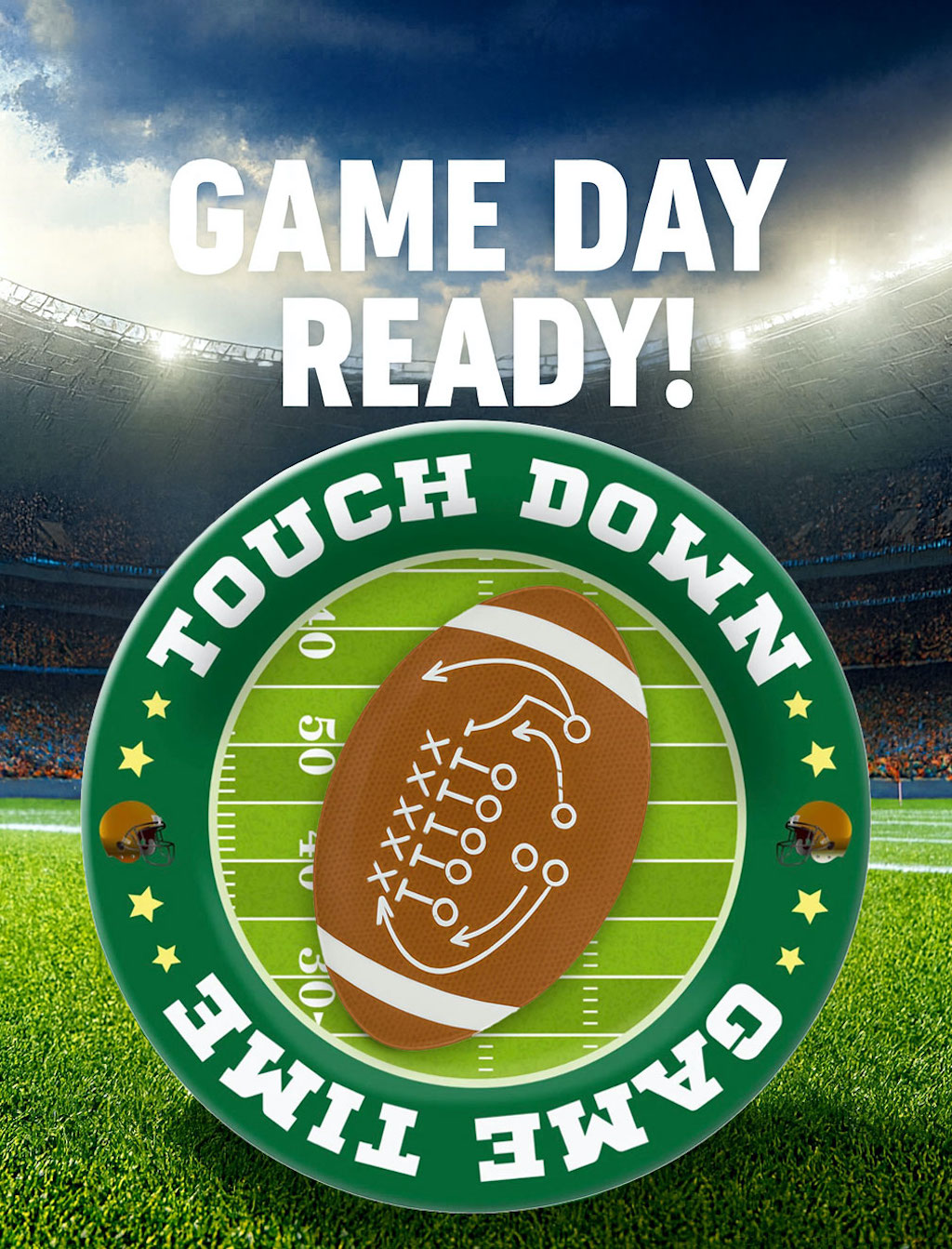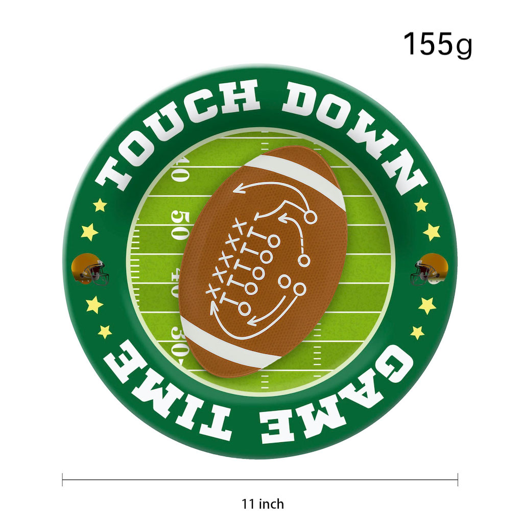 Bring the game-day spirit to your table with this NFL Melamine Dinnerware 11" Touchdown Plate. Designed with a bold football field graphic and “TOUCH DOWN GAME TIME” lettering, it’s perfect for tailgates, Super Bowl parties, and sports fans everywhere. Made from durable, BPA-free melamine, this plate is lightweight, reusable, and resistant to chips and cracks. Ideal for serving wings, snacks, and burgers—indoors or outdoors.