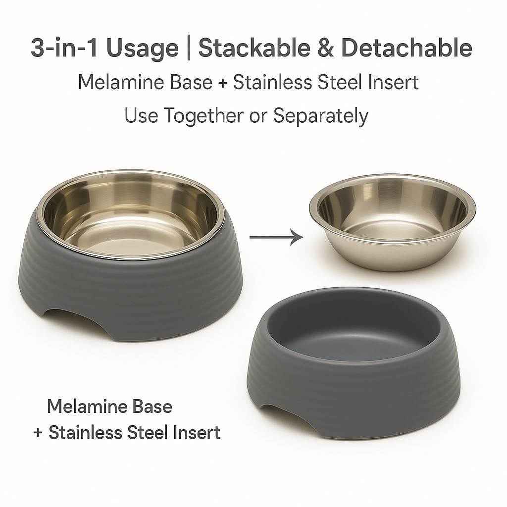 Elevate your pet’s dining experience with our elegantly crafted Non-Slip Melamine Dog Bowl, combining timeless design with everyday functionality. Featuring a removable stainless steel insert, this bowl ensures effortless cleaning and versatile use — ideal for both food and water. The sturdy melamine base offers superior stability with its anti-slip design, while the smooth, matte graphite finish blends seamlessly into any modern home.