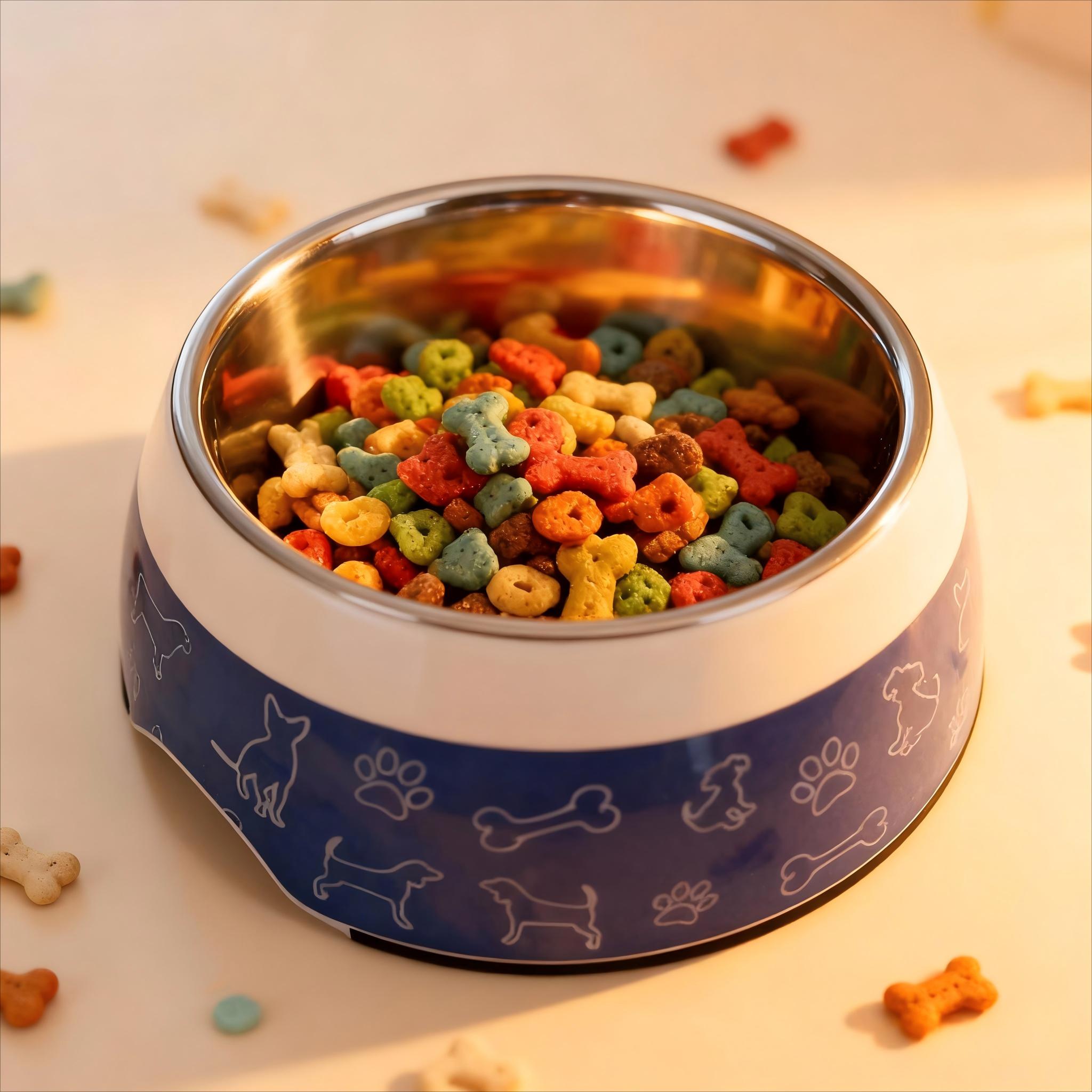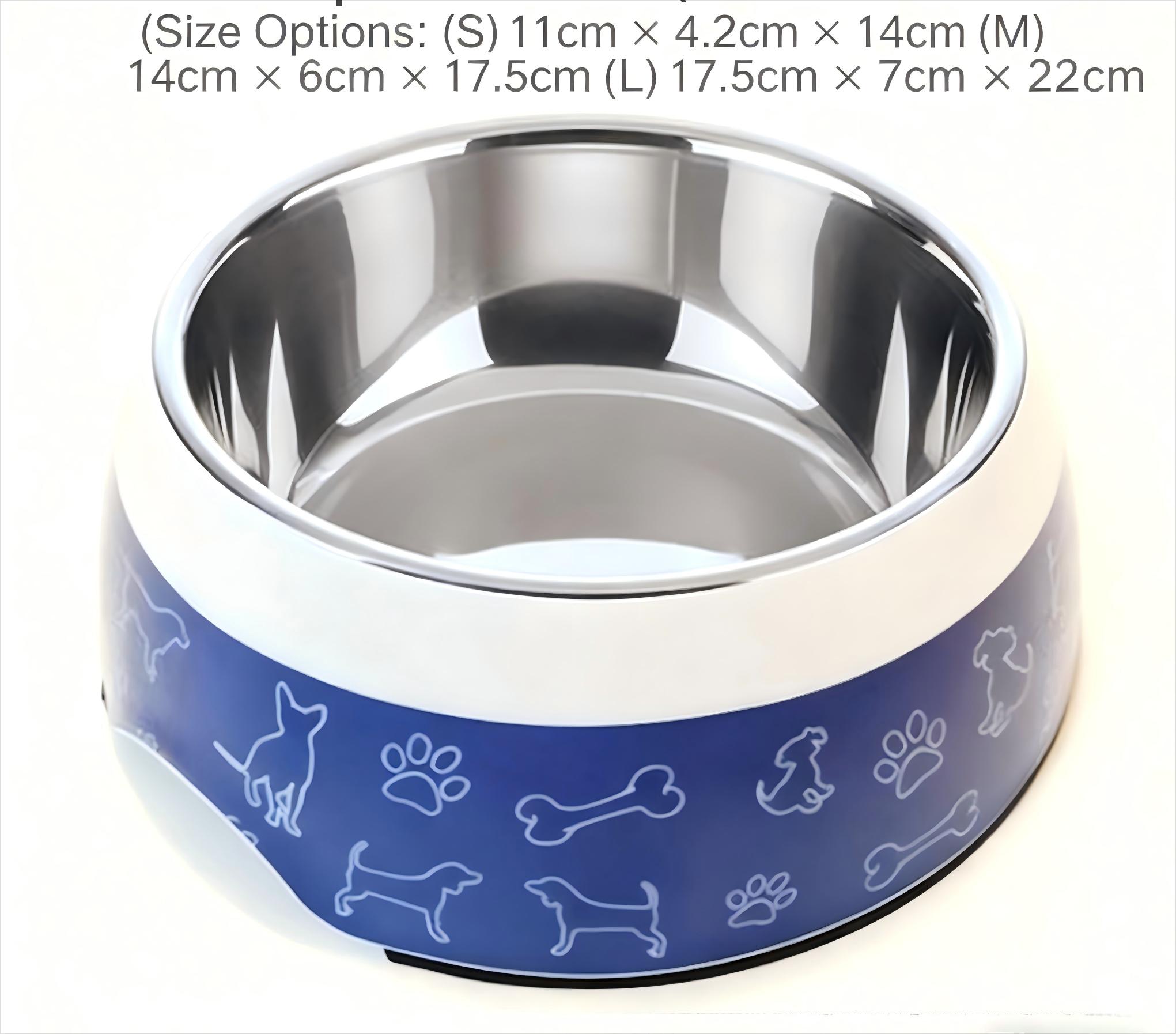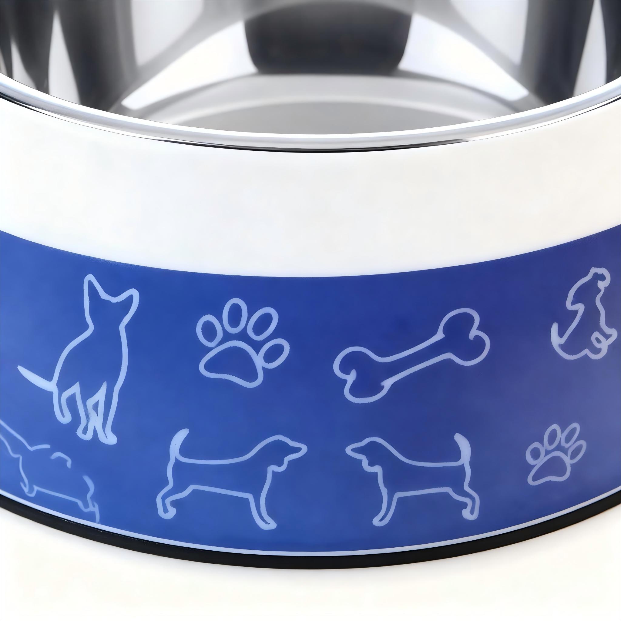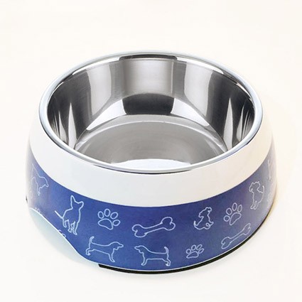 Blue melamine pet bowl with white dog silhouette and paw print design. Comes with stainless steel liner and anti-slip rubber base for clean and safe feeding.