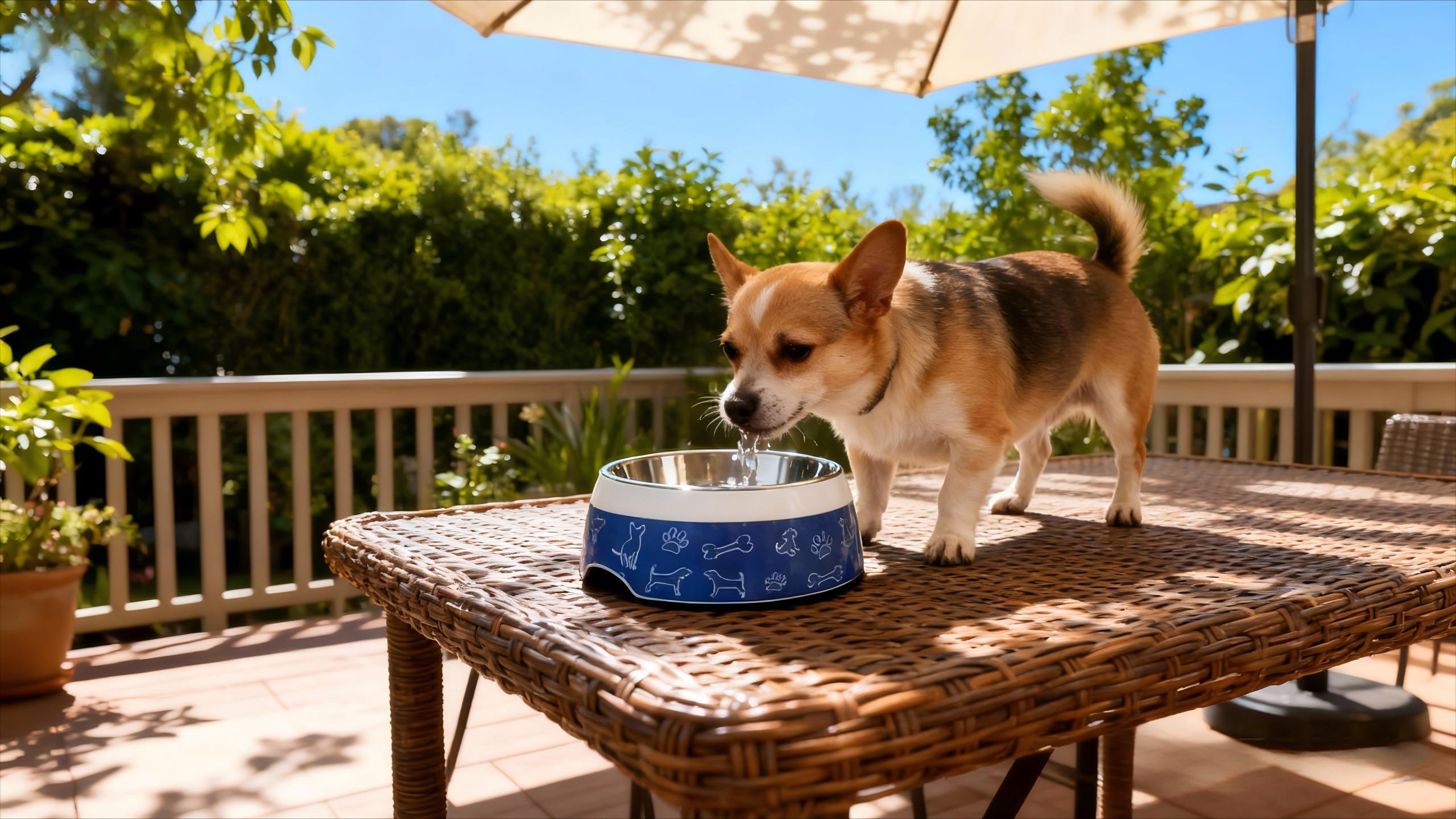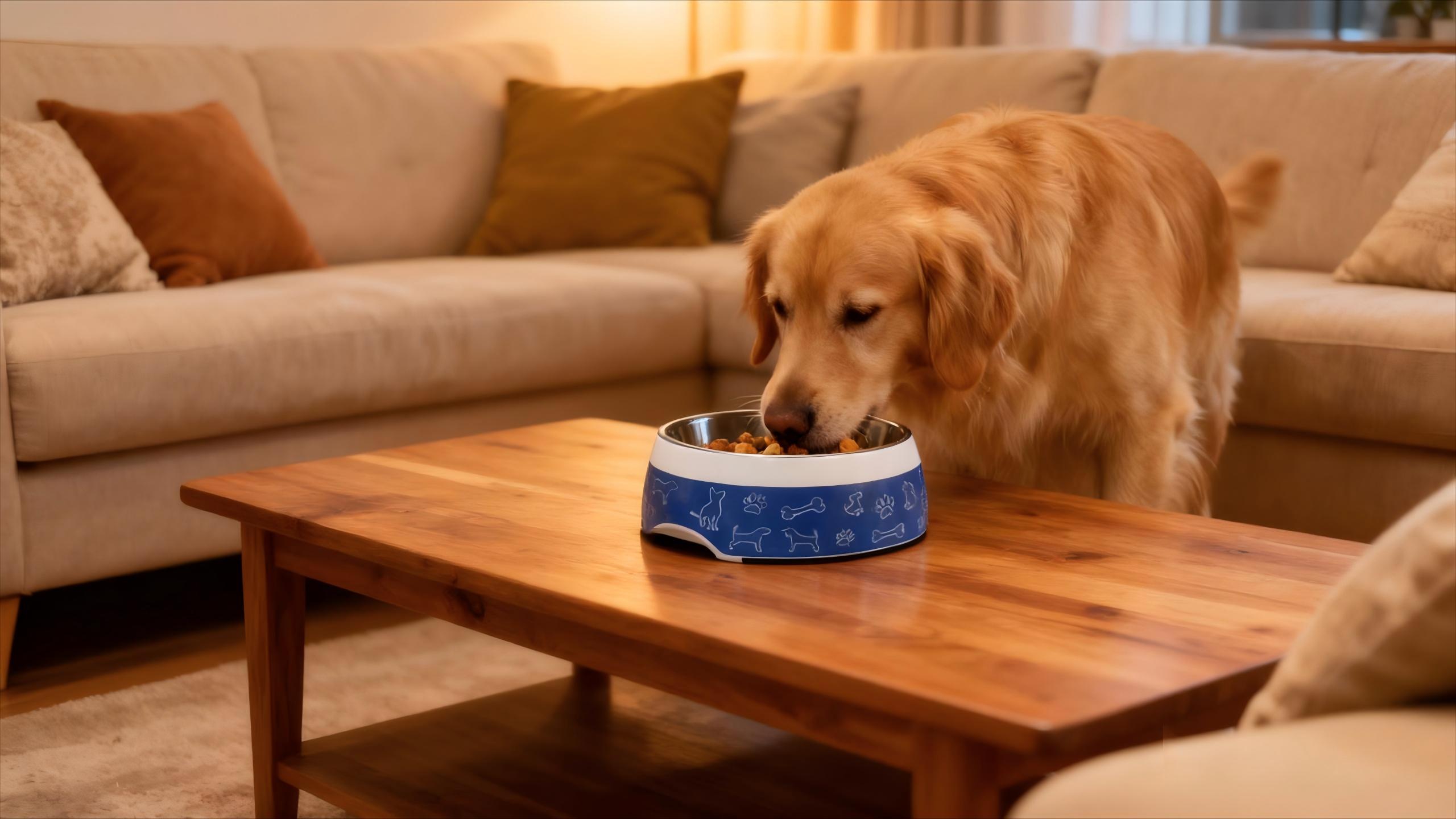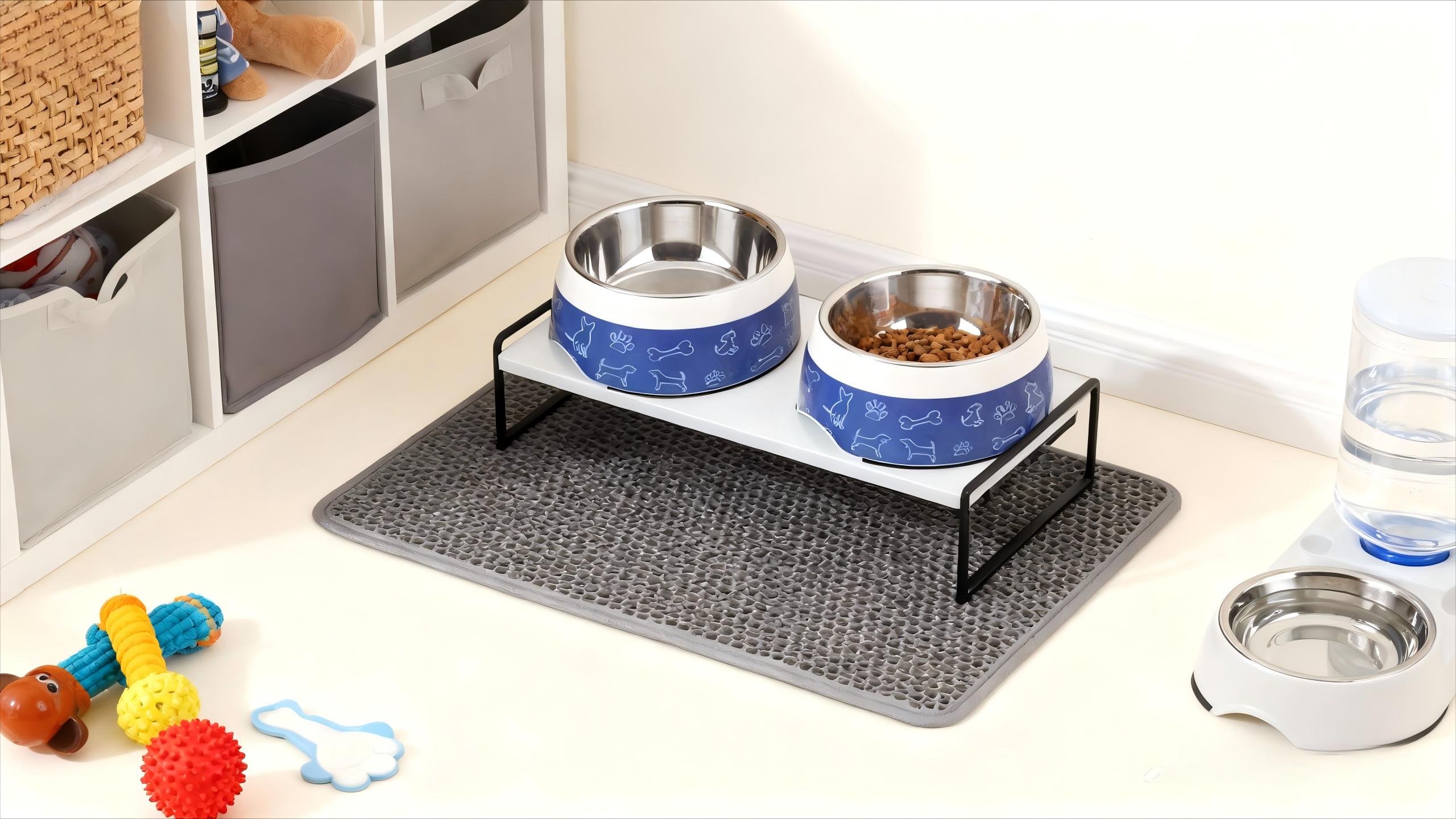 Blue melamine pet bowl with white dog silhouette and paw print design. Comes with stainless steel liner and anti-slip rubber base for clean and safe feeding.