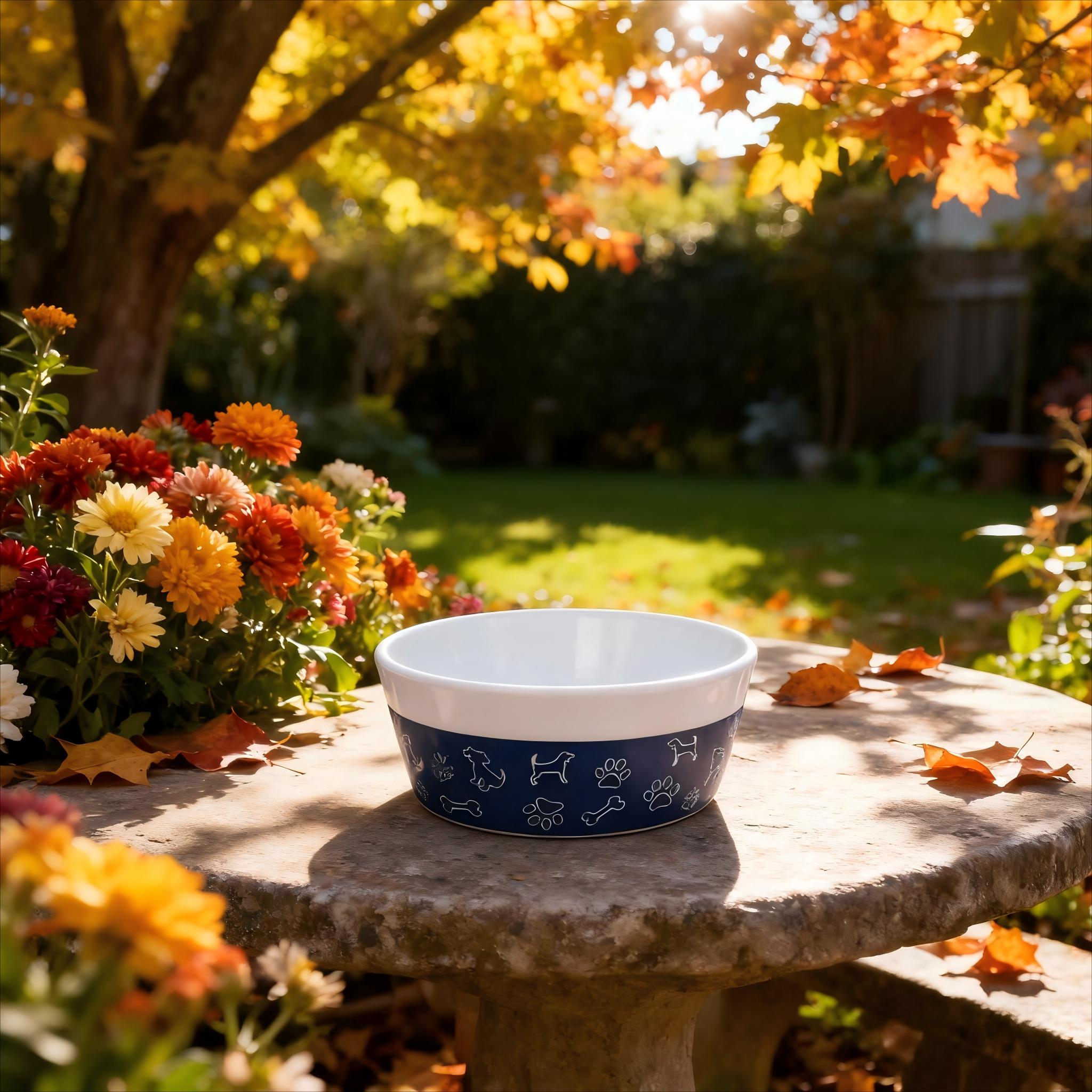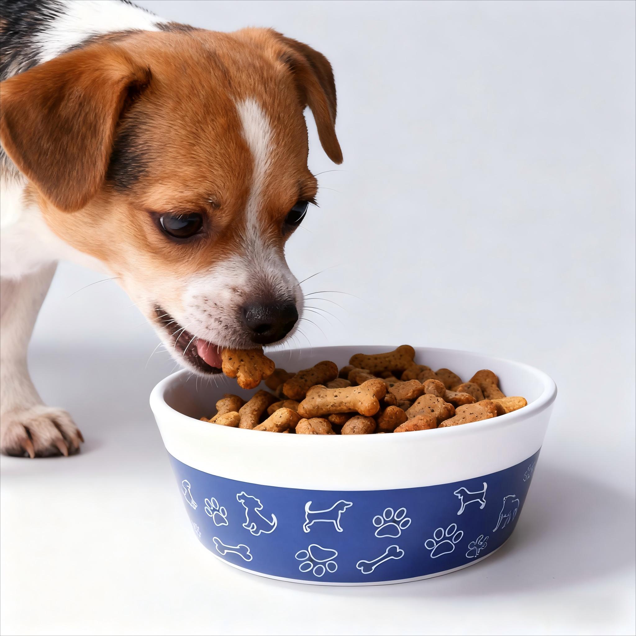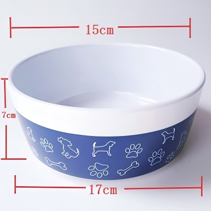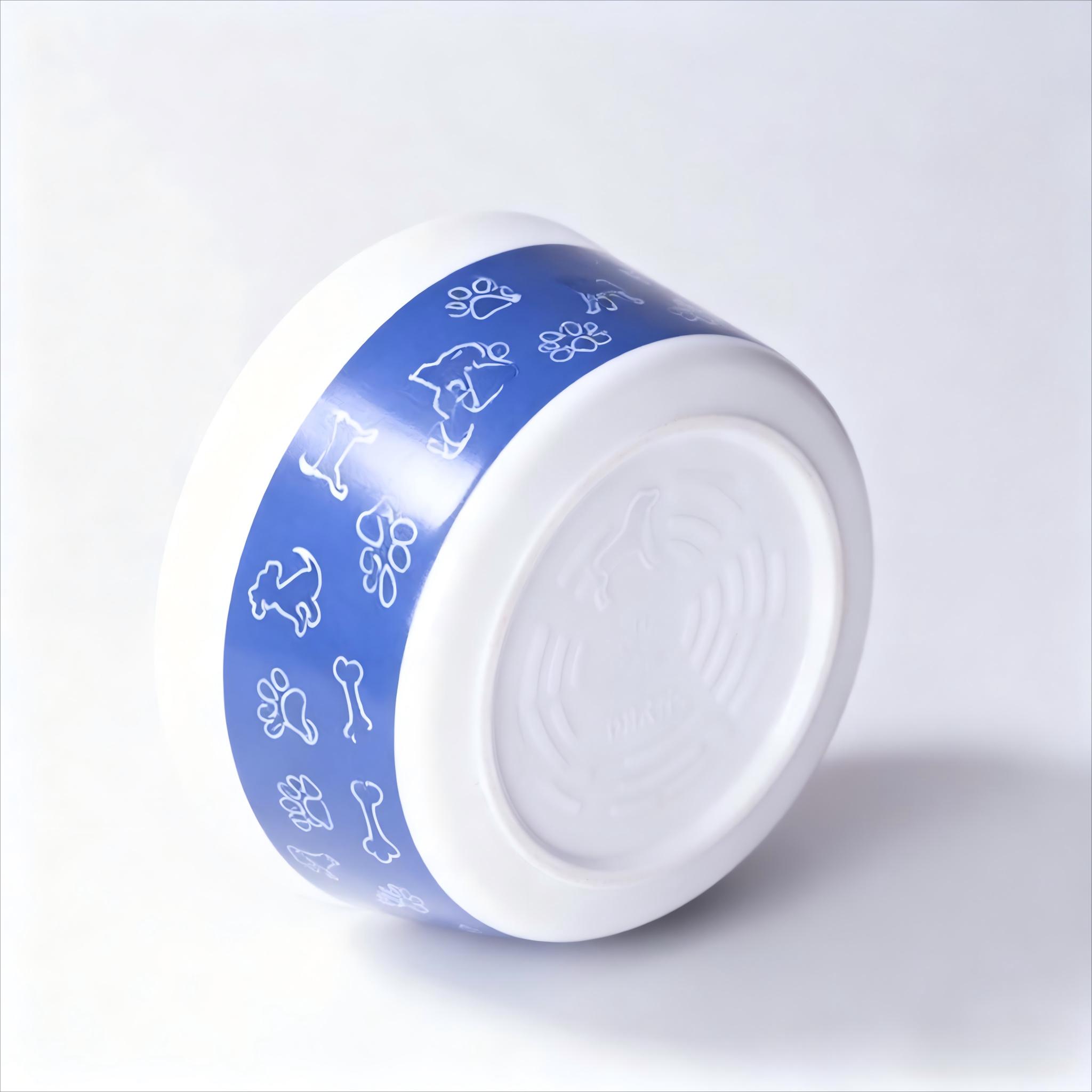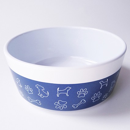 Durable melamine pet bowl with blue paw and dog pattern. Single size design, perfect for everyday feeding.