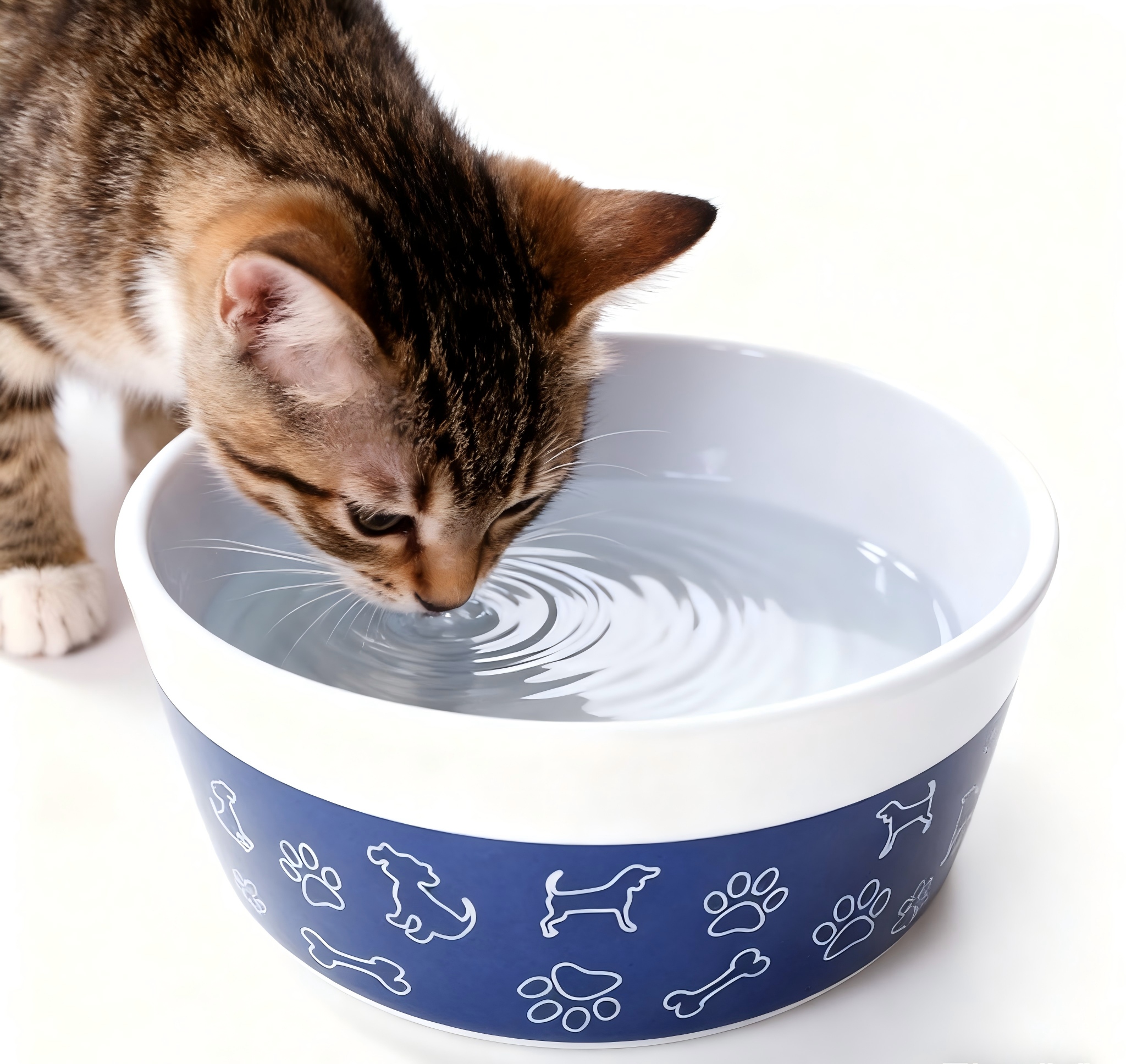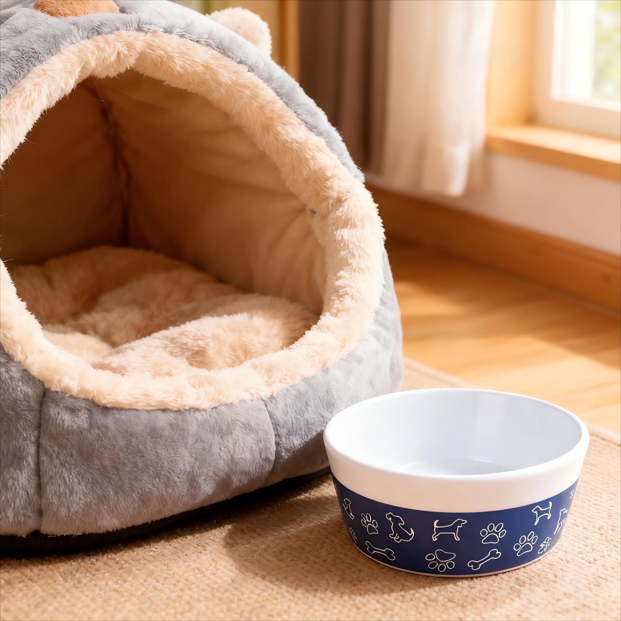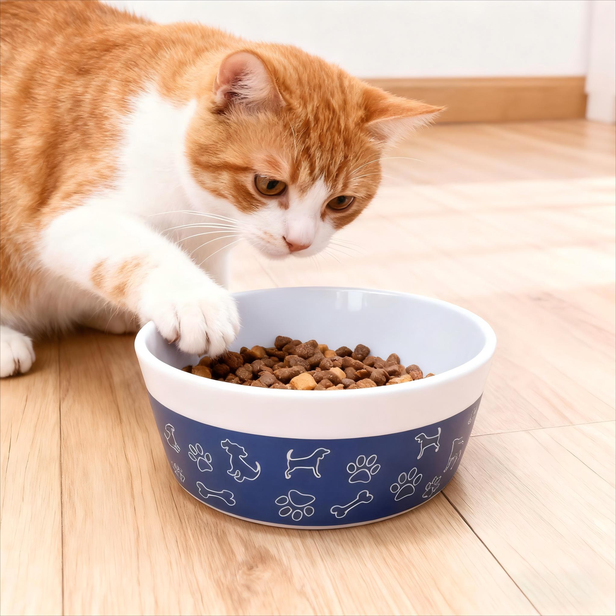 Durable melamine pet bowl with blue paw and dog pattern. Single size design, perfect for everyday feeding.