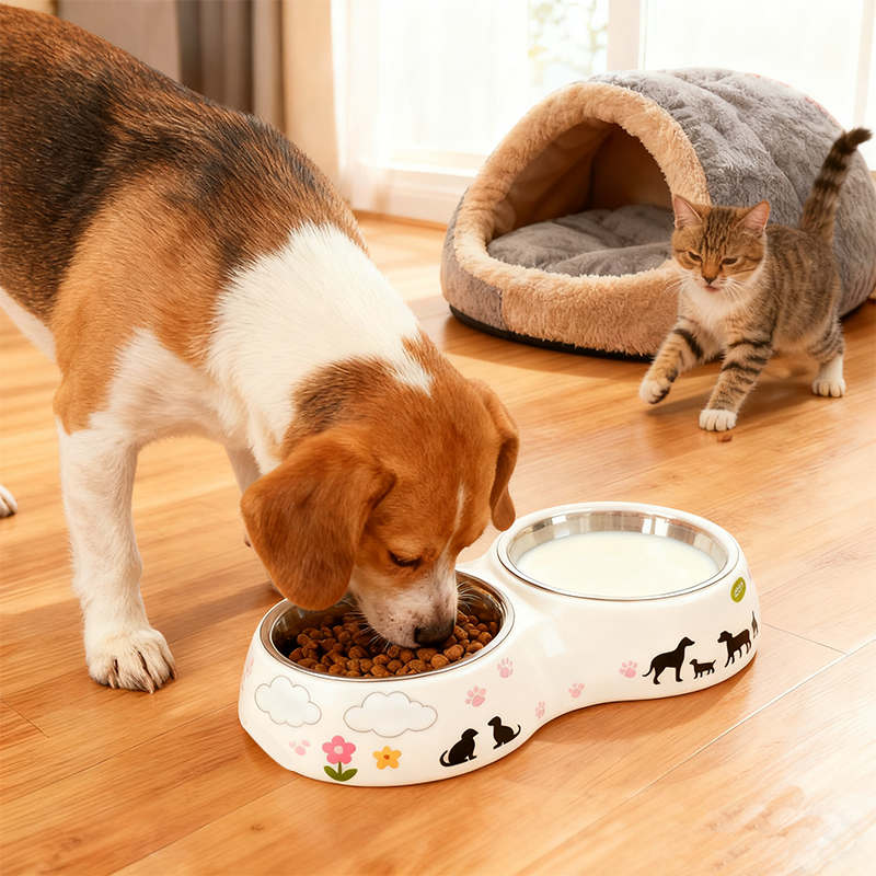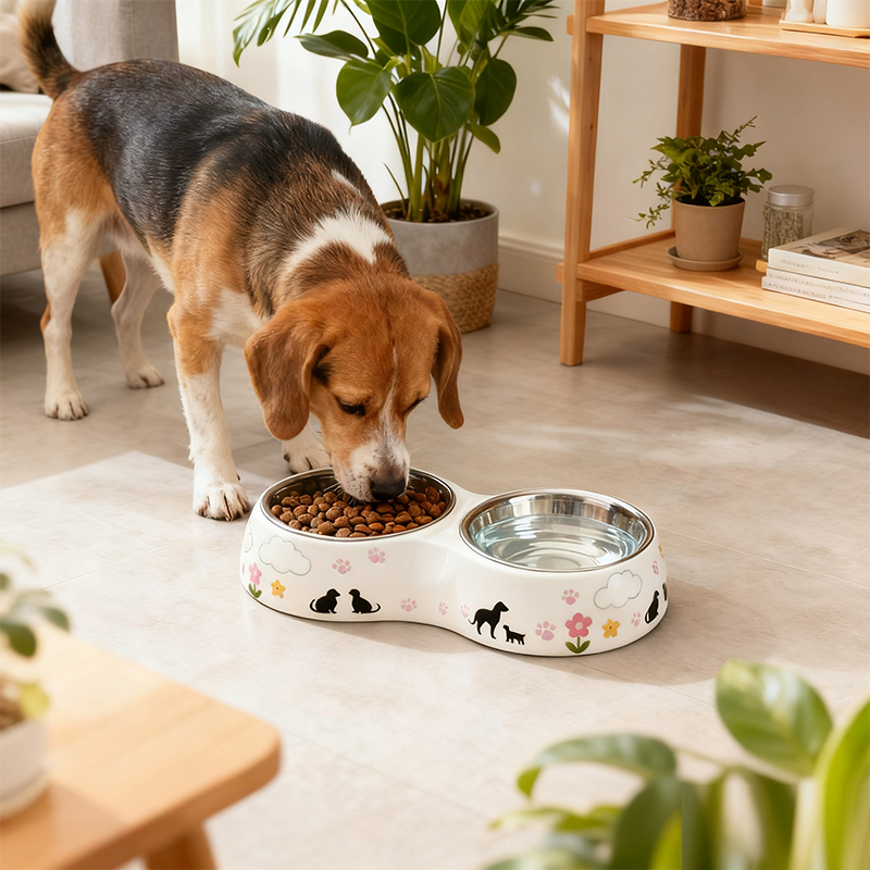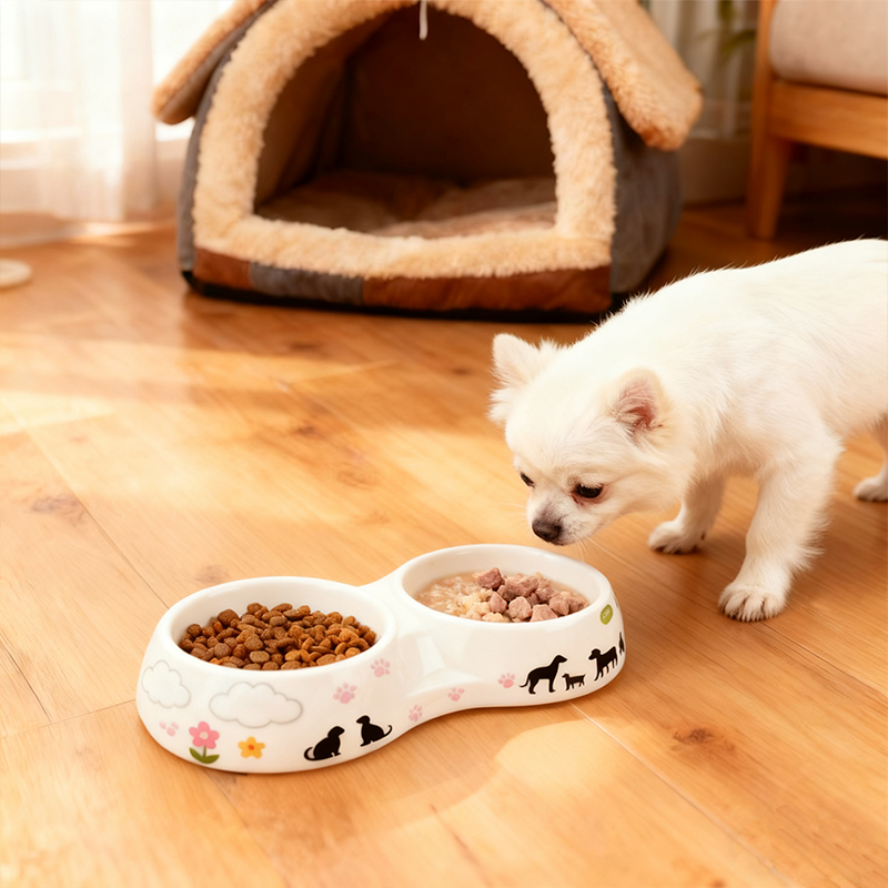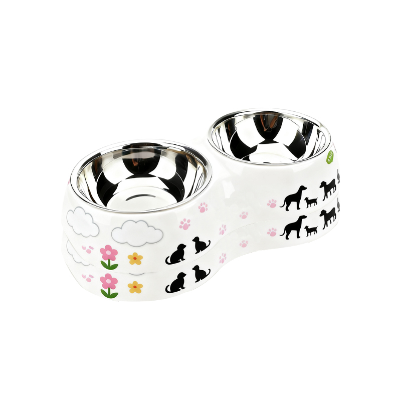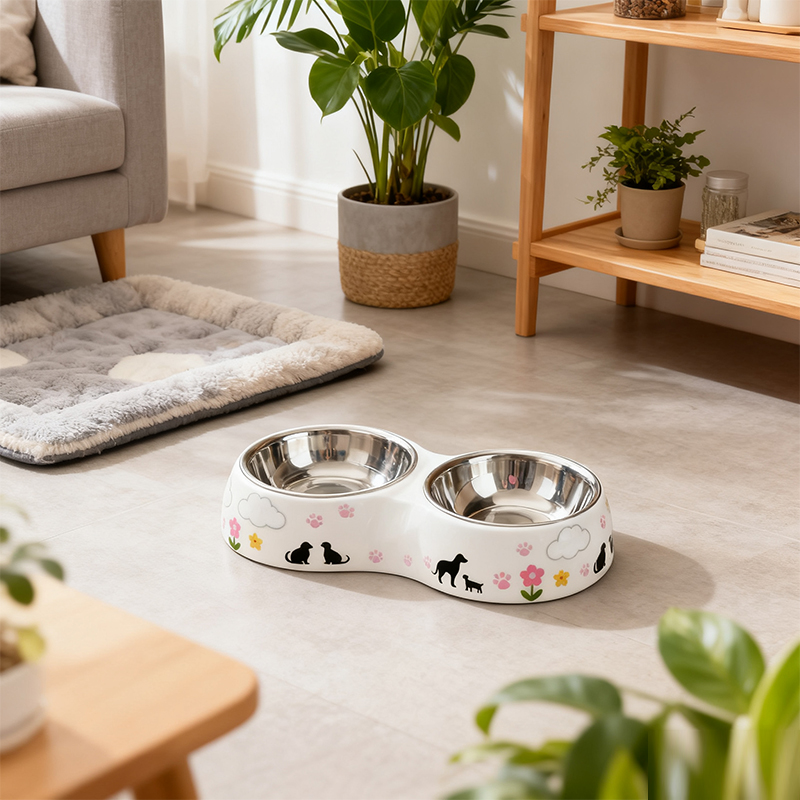 This adorable double pet bowl features two compartments perfect for separating food and water — or dry and wet food. Designed with playful dog silhouettes and paw prints, it adds a charming touch to any pet-friendly space. Made from durable, easy-to-clean materials with a non-slip base, it's ideal for small dogs and cats.