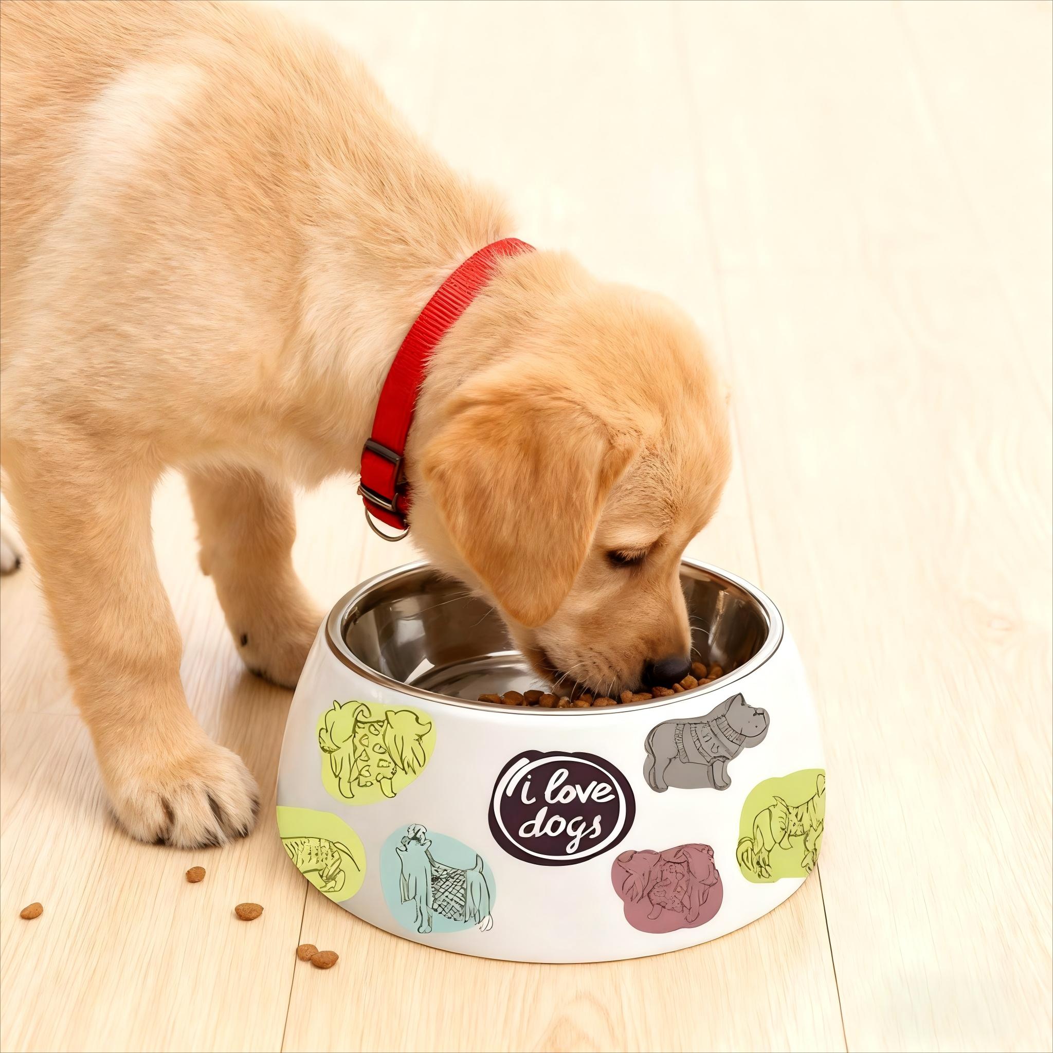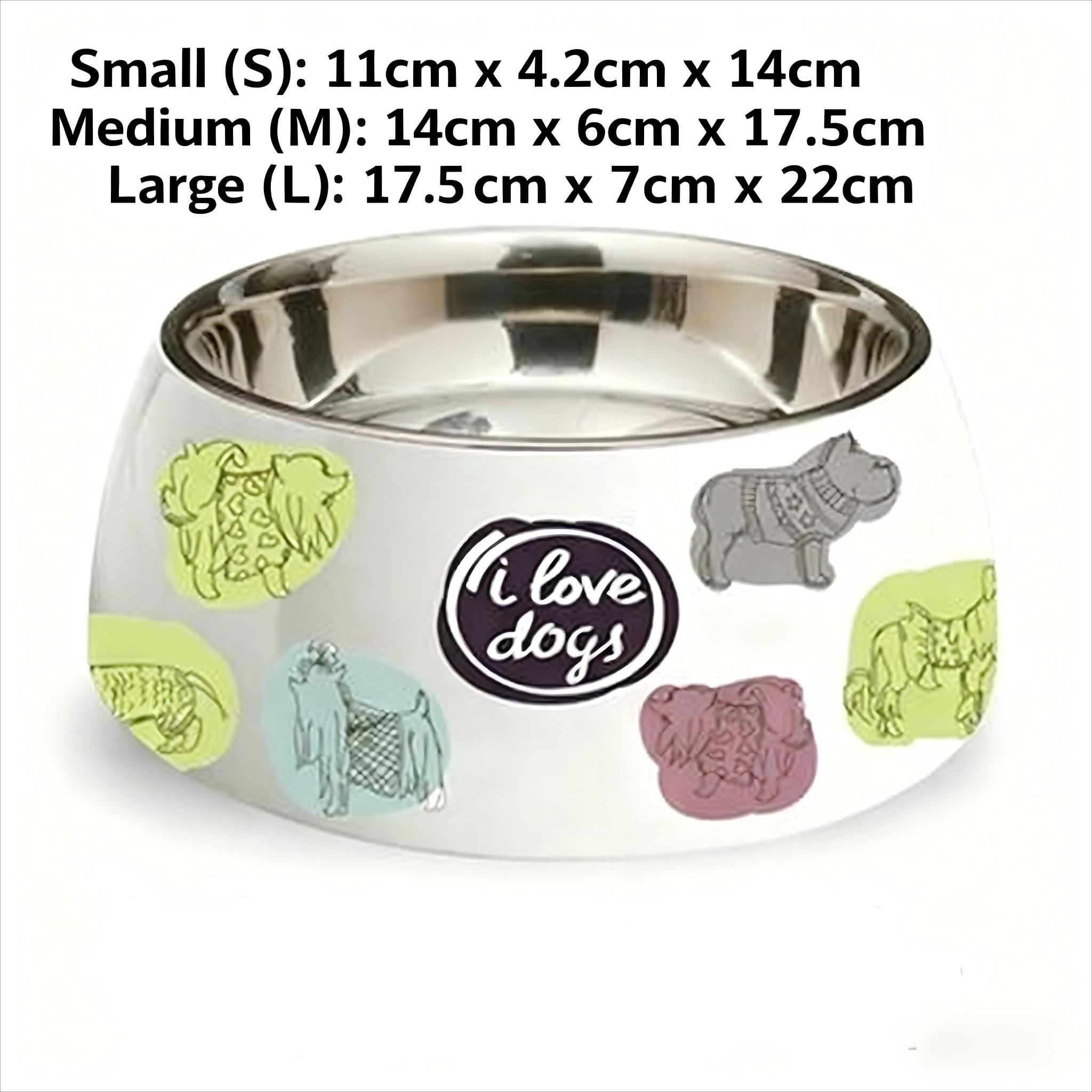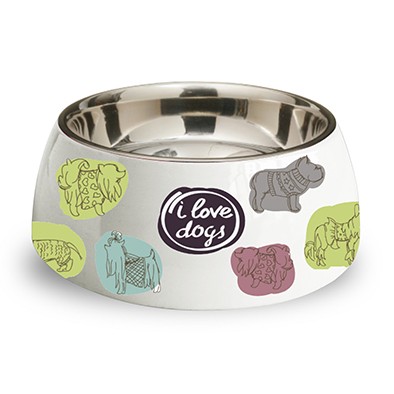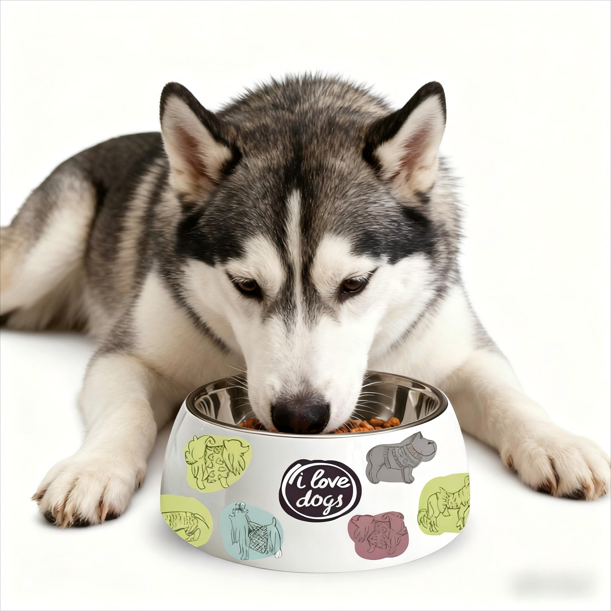 Design: 'I Love Dogs' text with colorful illustrated dogs