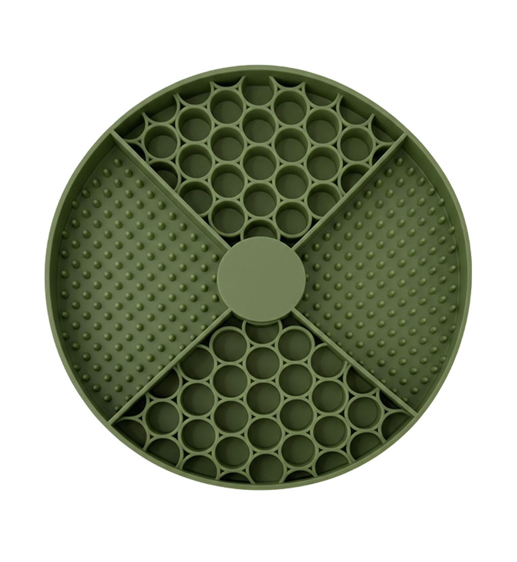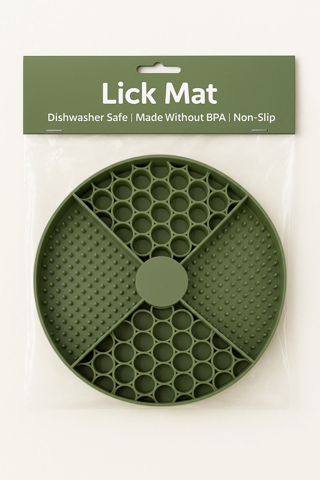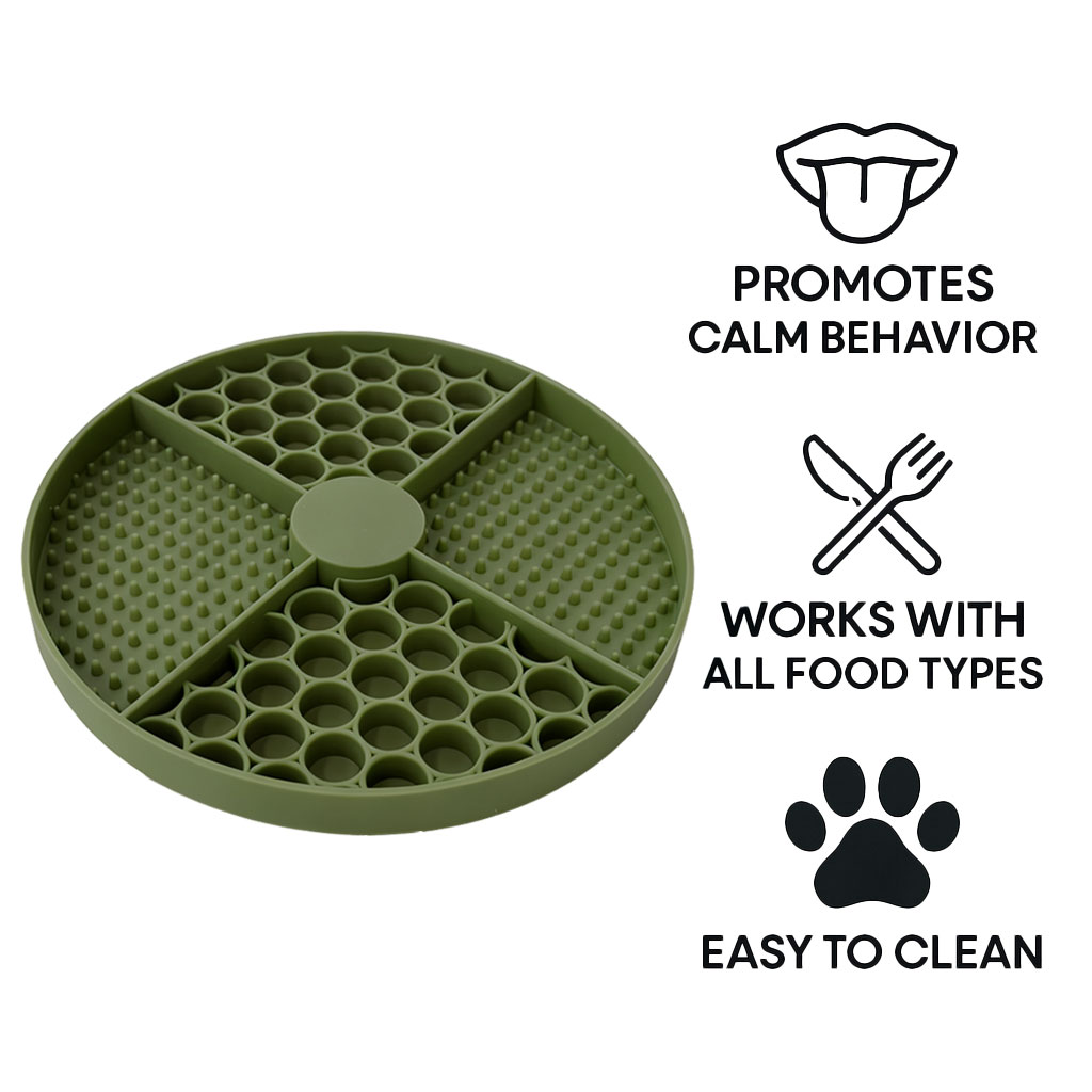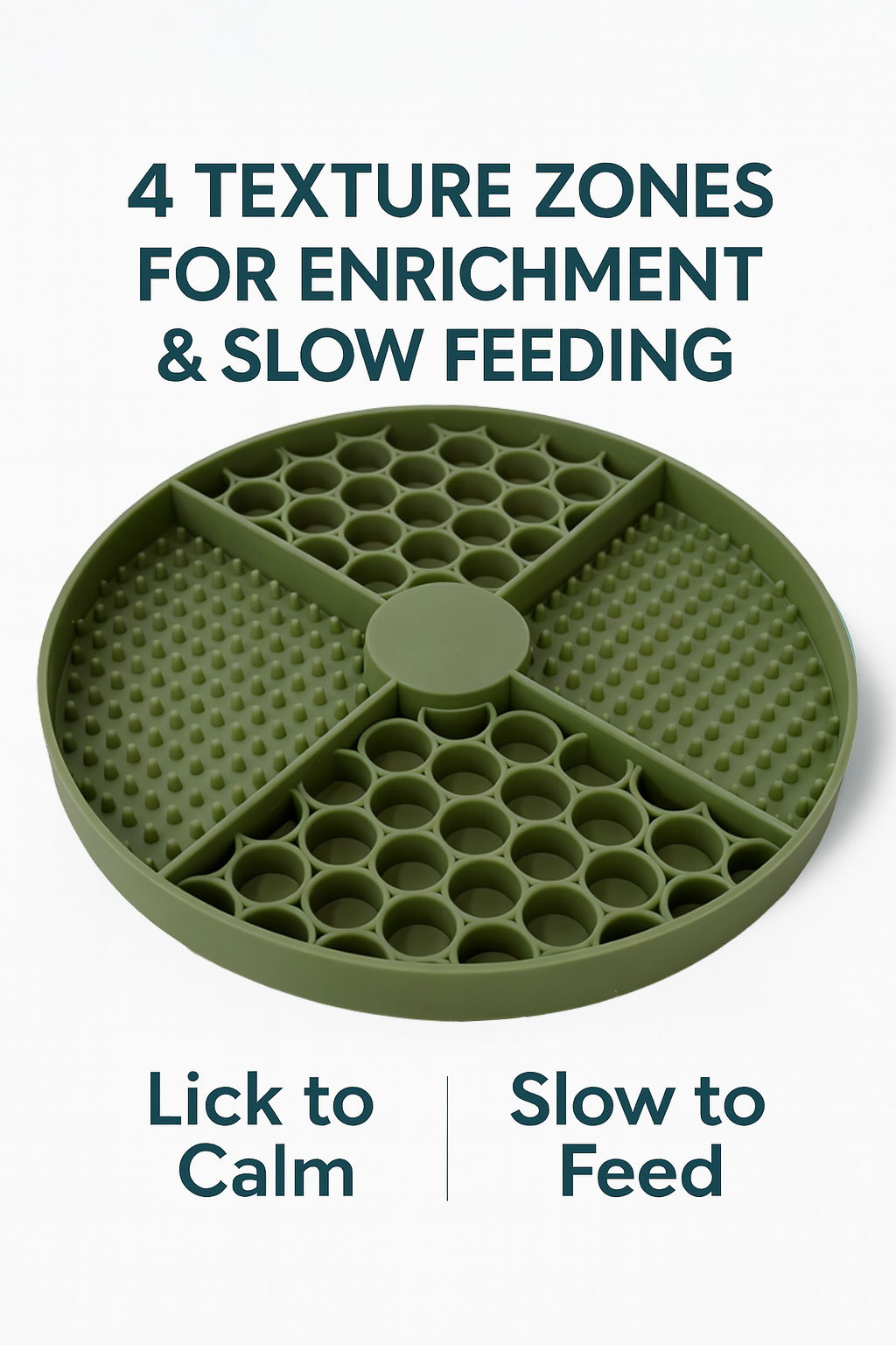 Designed in a soothing sage green, this mat features four unique texture zones that engage your pet’s senses, encourage slower eating, and promote natural licking behavior to reduce anxiety.