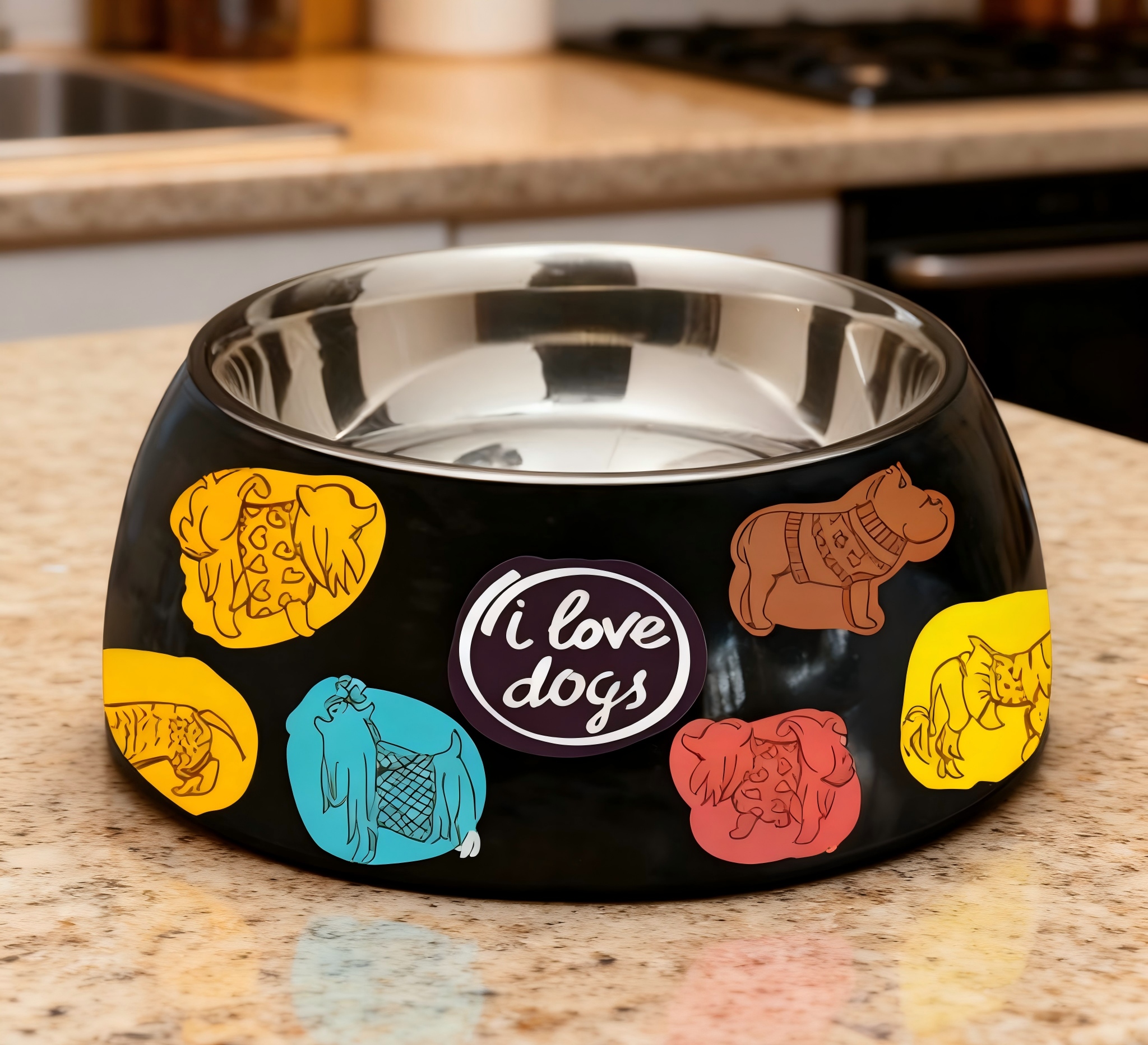 Design: Colorful cartoon dog prints with "I love dogs" text