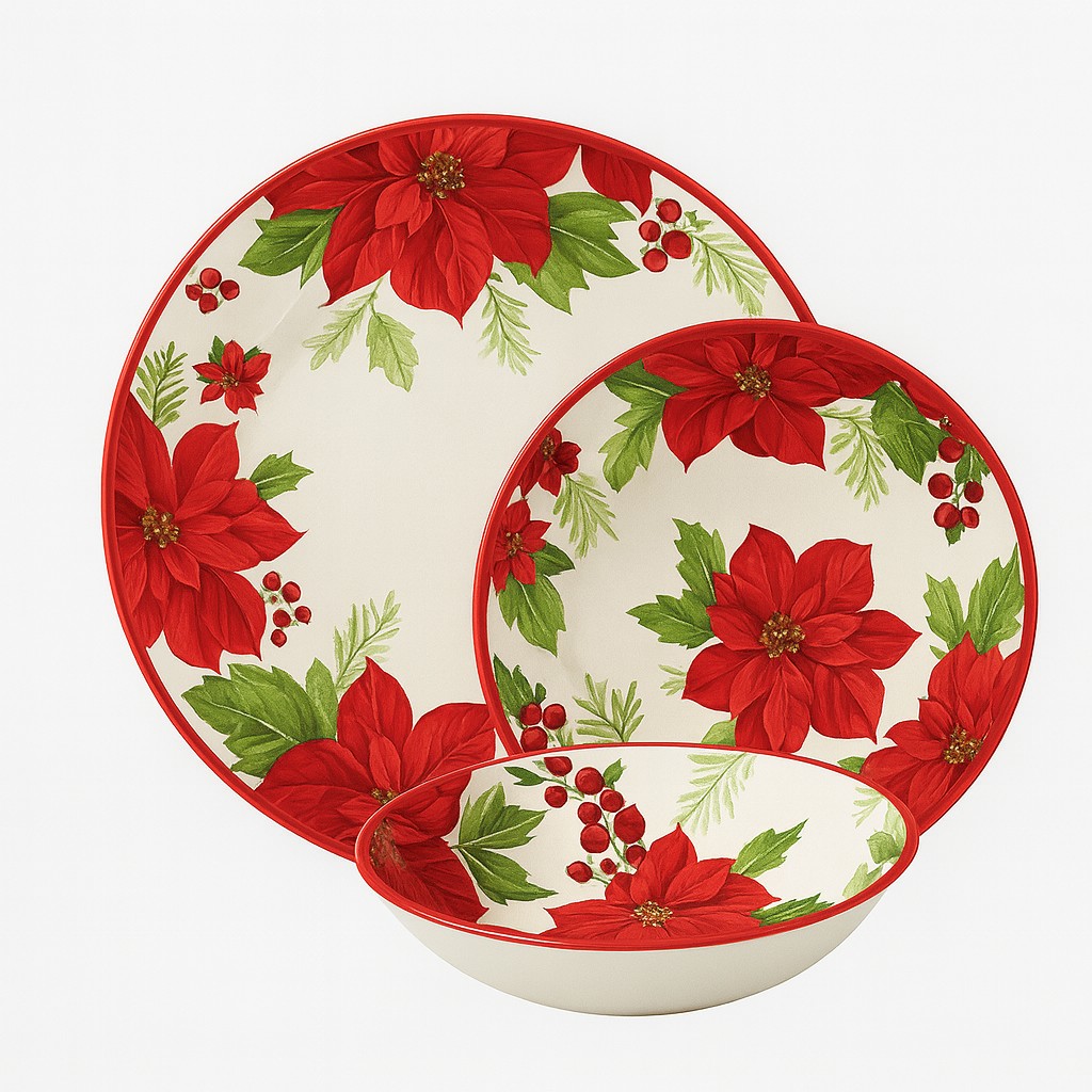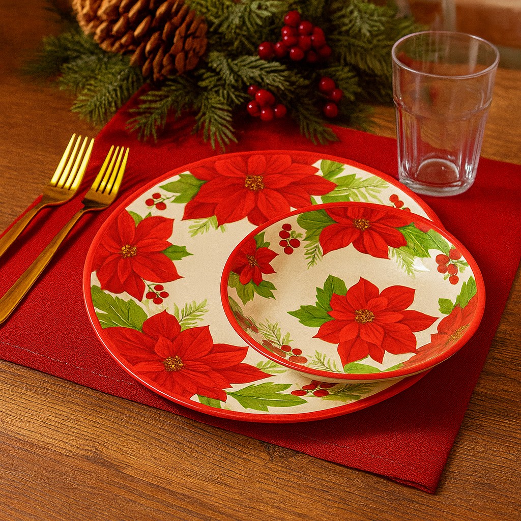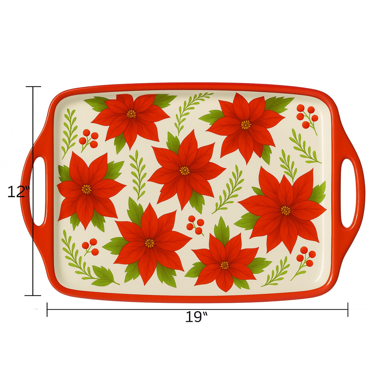 This 19-inch poinsettia melamine serving tray with handles features a festive red floral design inspired by classic holiday décor. The generous rectangular shape provides ample space for serving drinks, snacks, appetizers, or desserts, while the built-in handles make carrying easy and secure.
