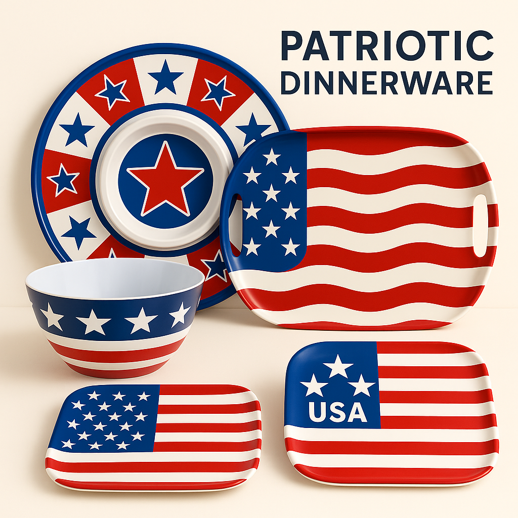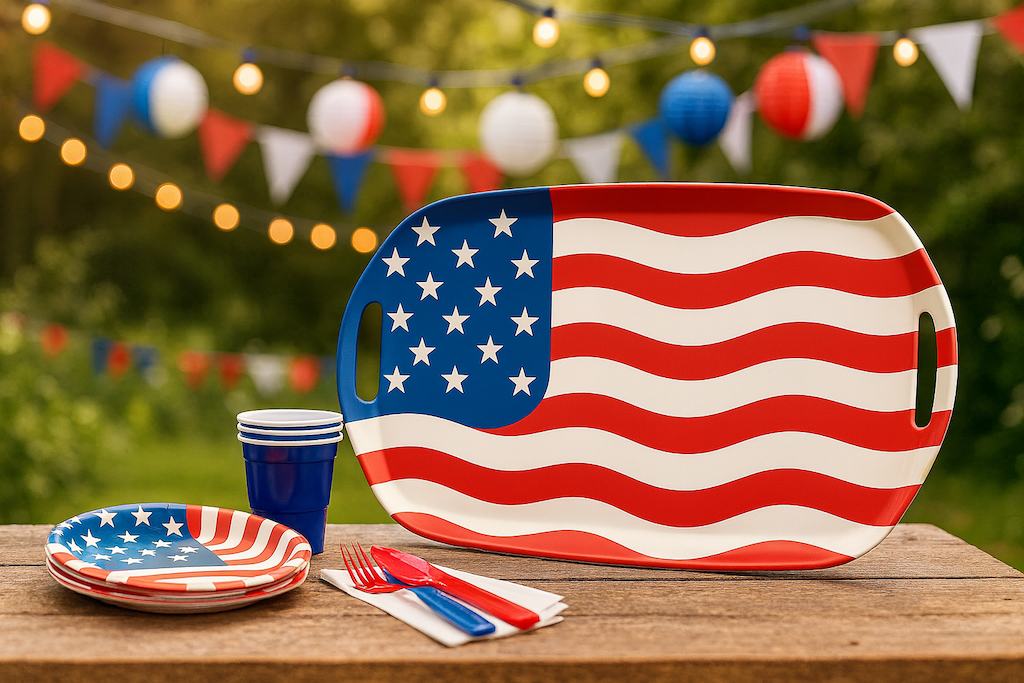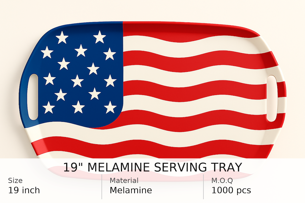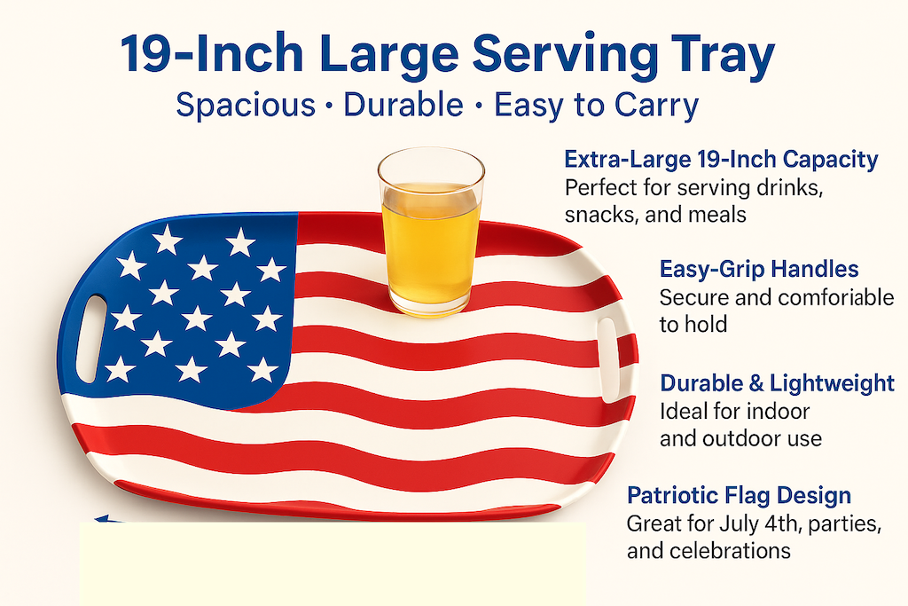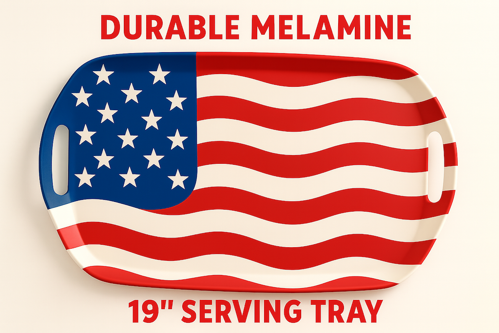 Bring instant patriotic spirit to your table with this 19 inch melamine serving tray featuring a bold American flag design. With easy-grip handles and a lightweight yet durable melamine build, it’s perfect for serving burgers, snacks, drinks, and desserts at 4th of July parties, summer BBQs, picnics, and outdoor gatherings. Reusable, shatter-resistant, and sized for sharing—your go-to tray for festive entertaining.