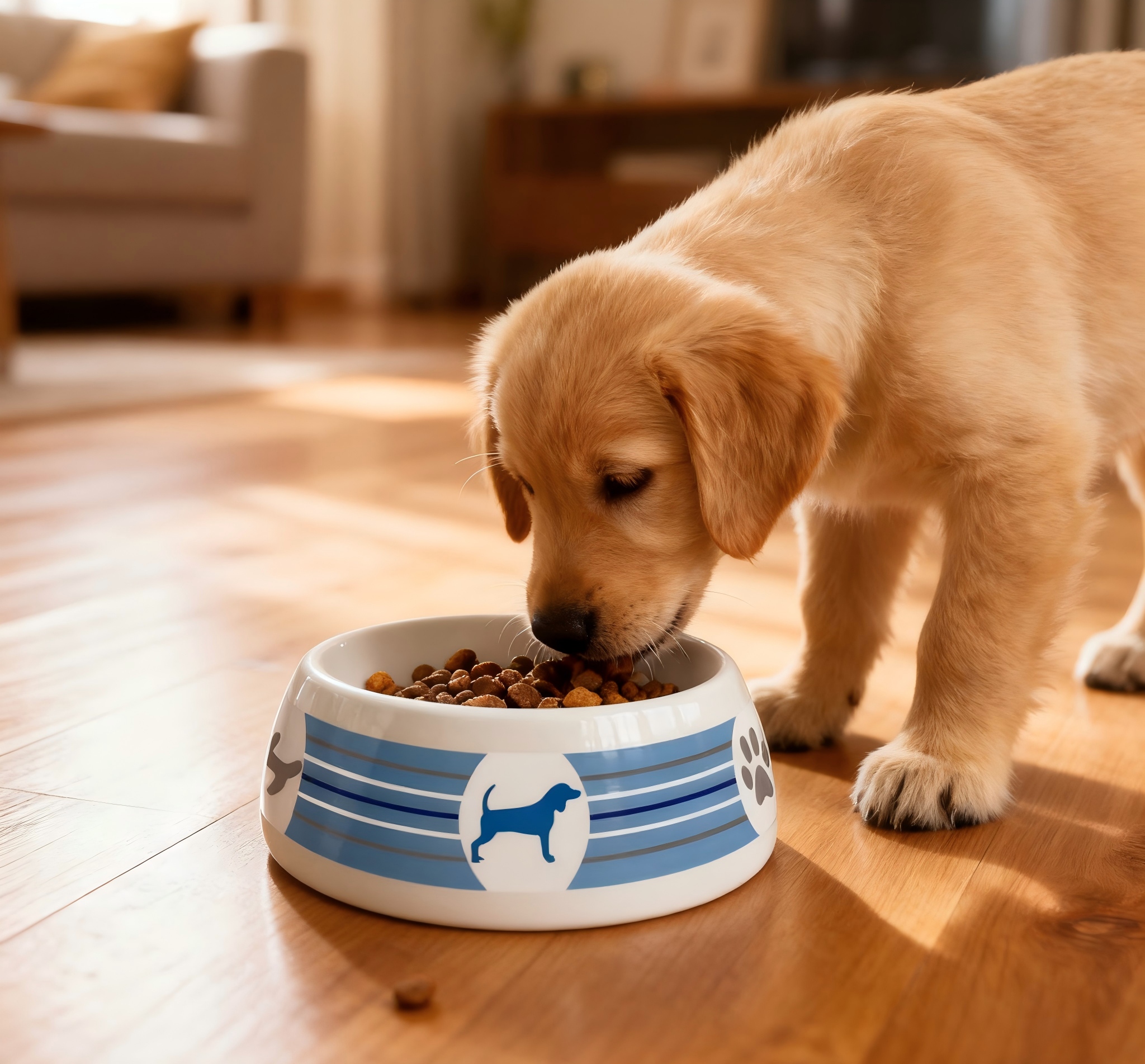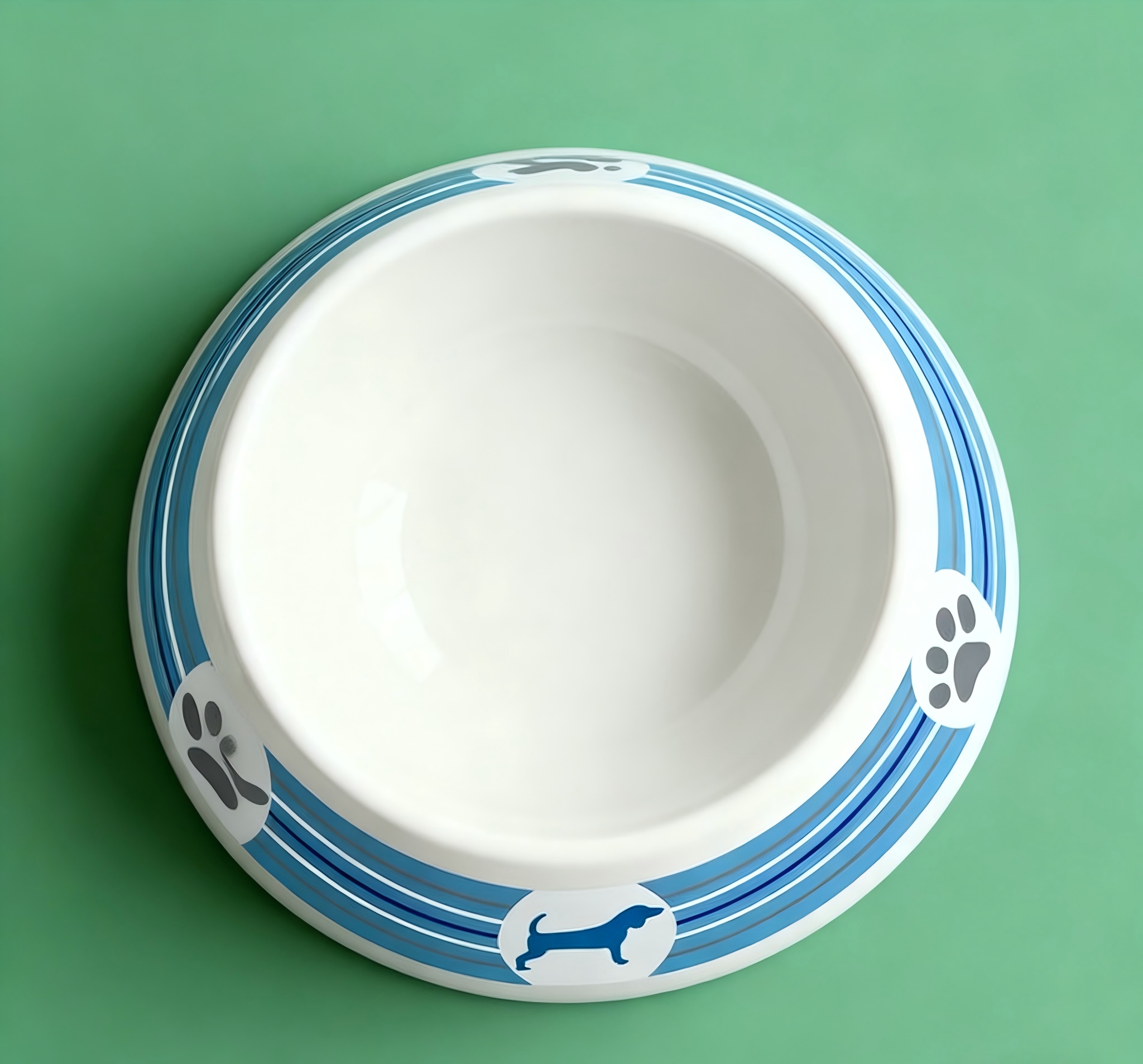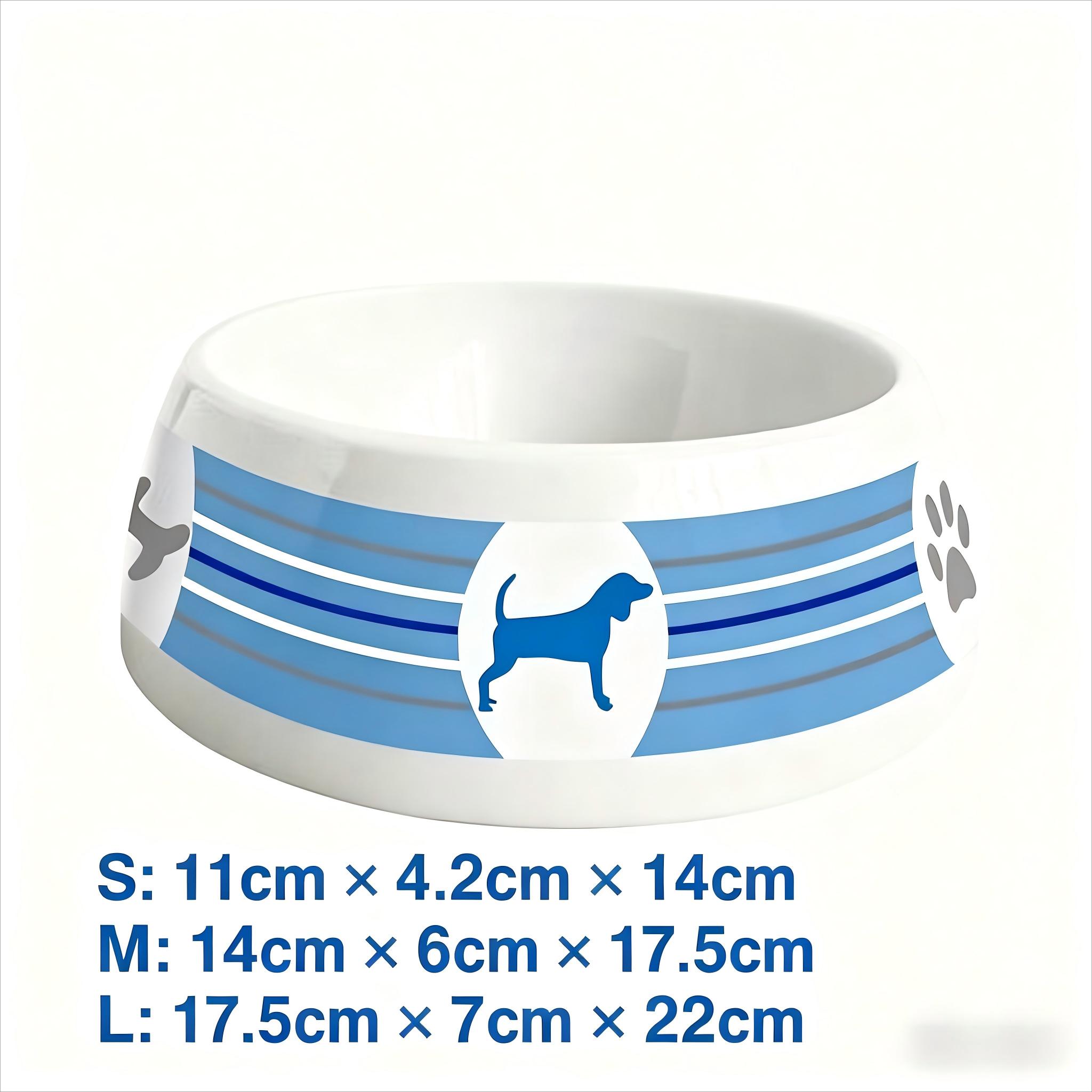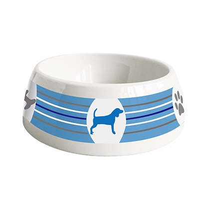 Design: Blue silhouette dog and gray paw print with striped pattern