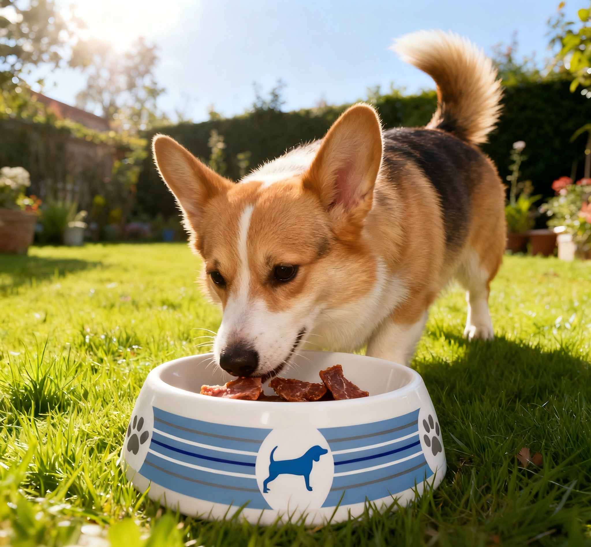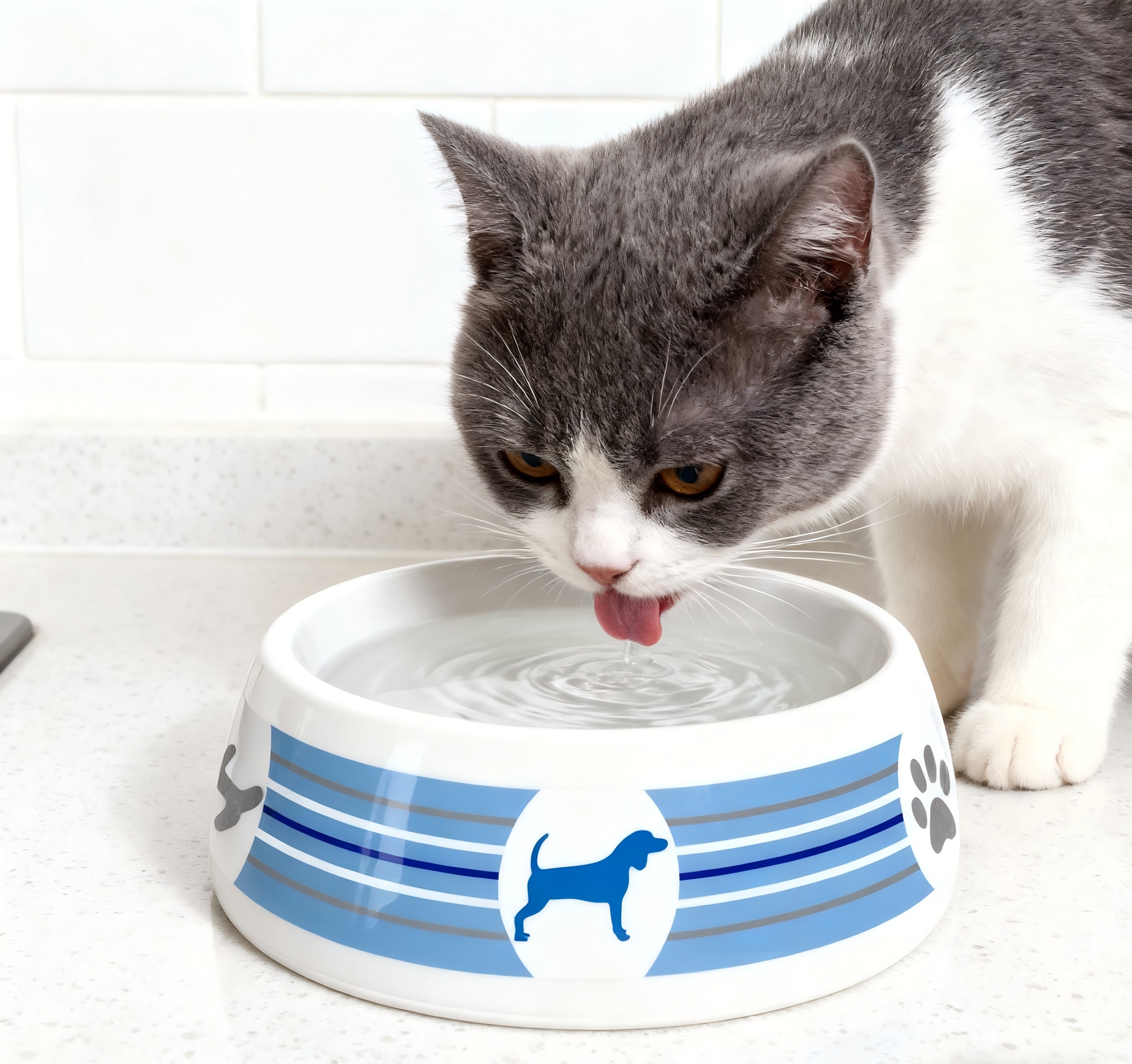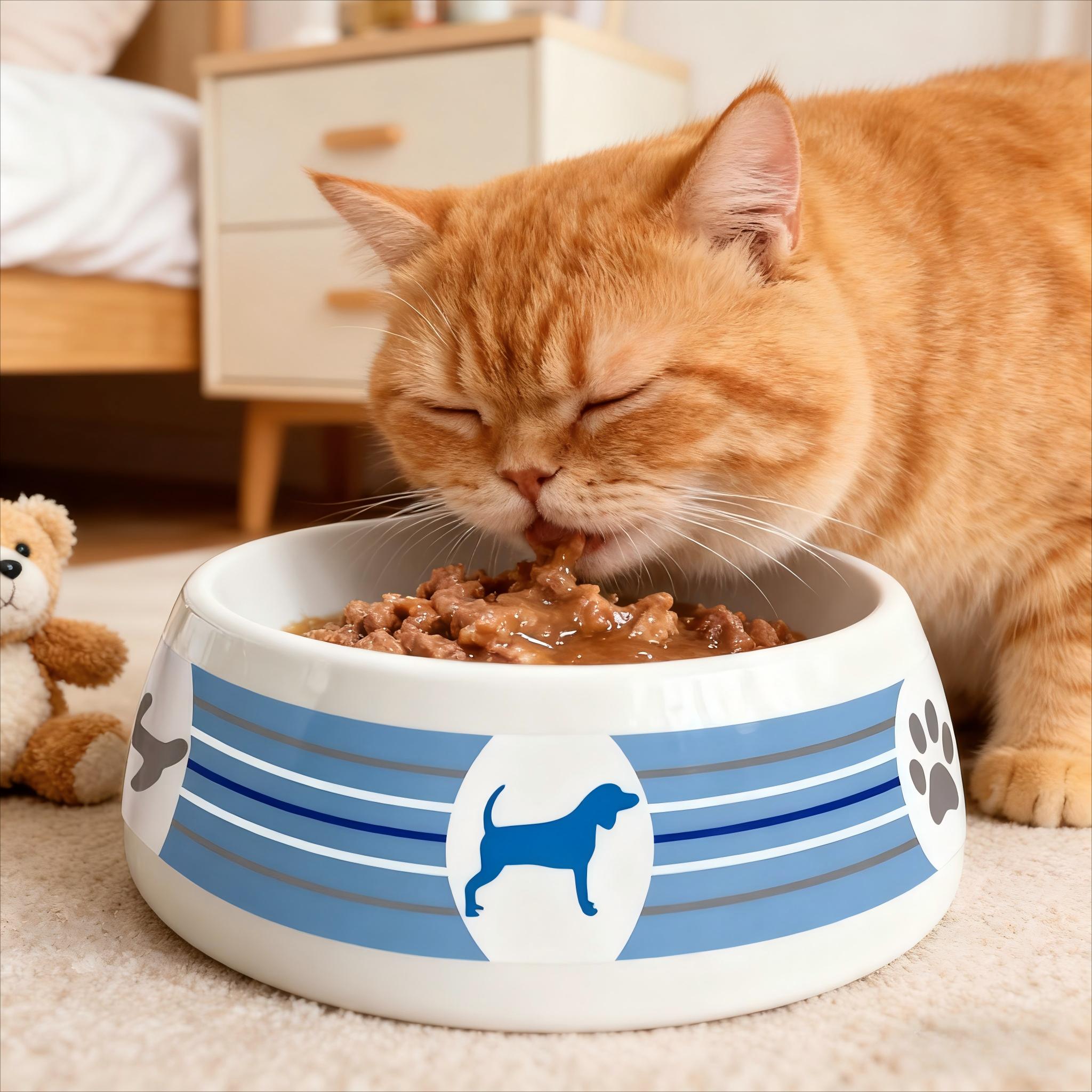 Design: Blue silhouette dog and gray paw print with striped pattern