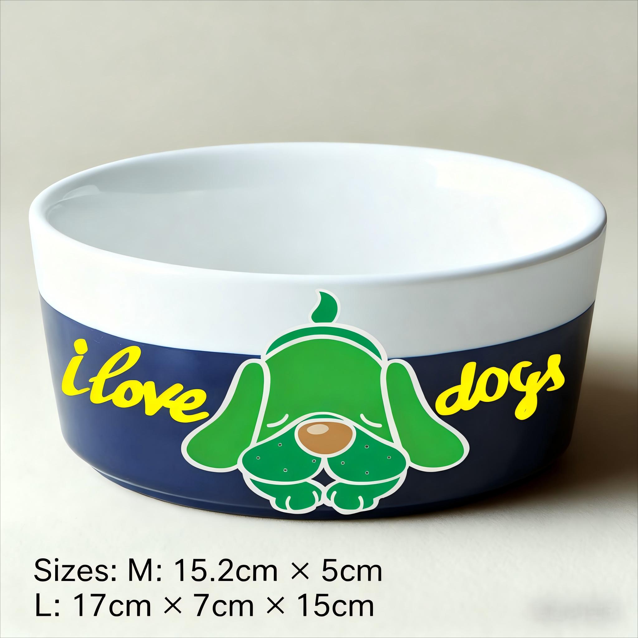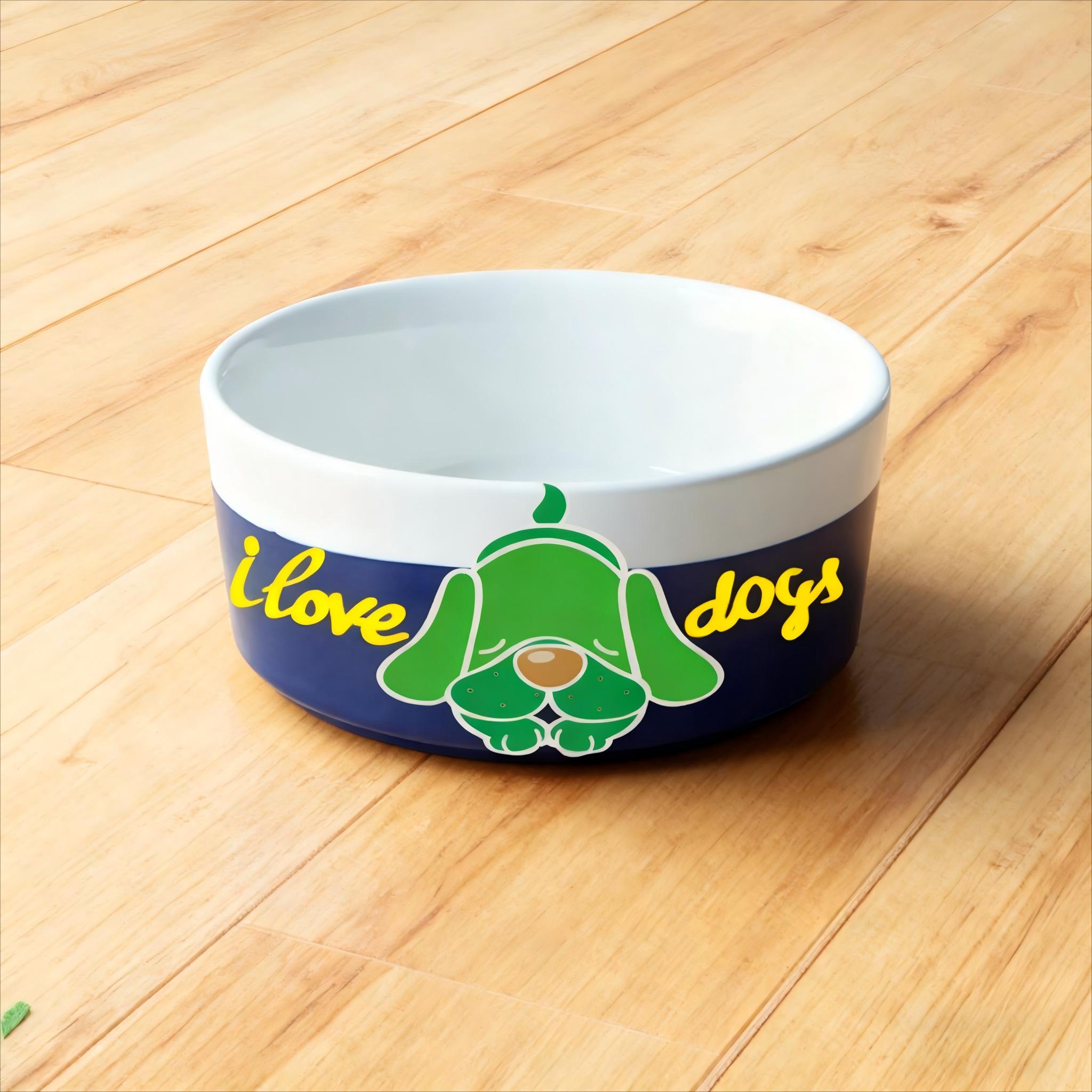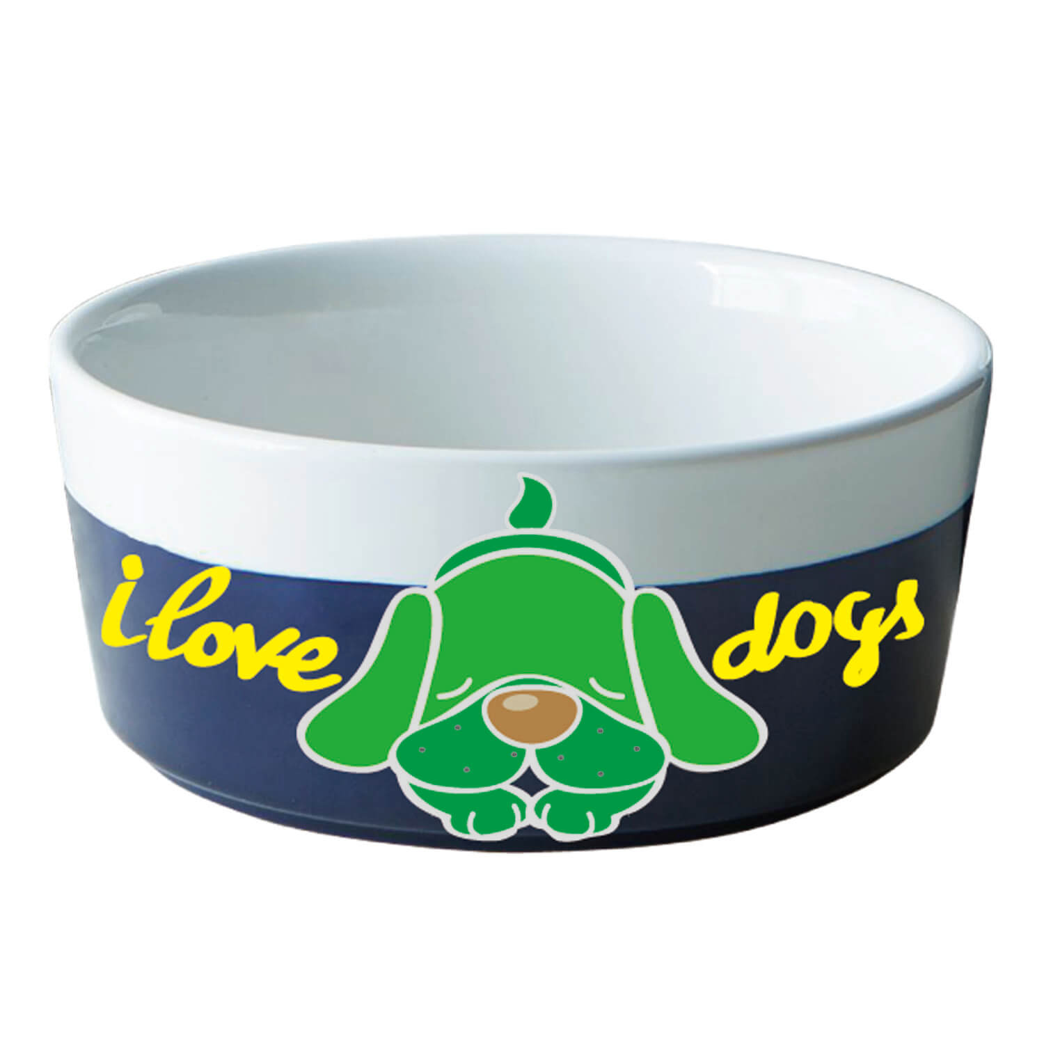 Design: Green cartoon dog with “I love dogs” text in yellow