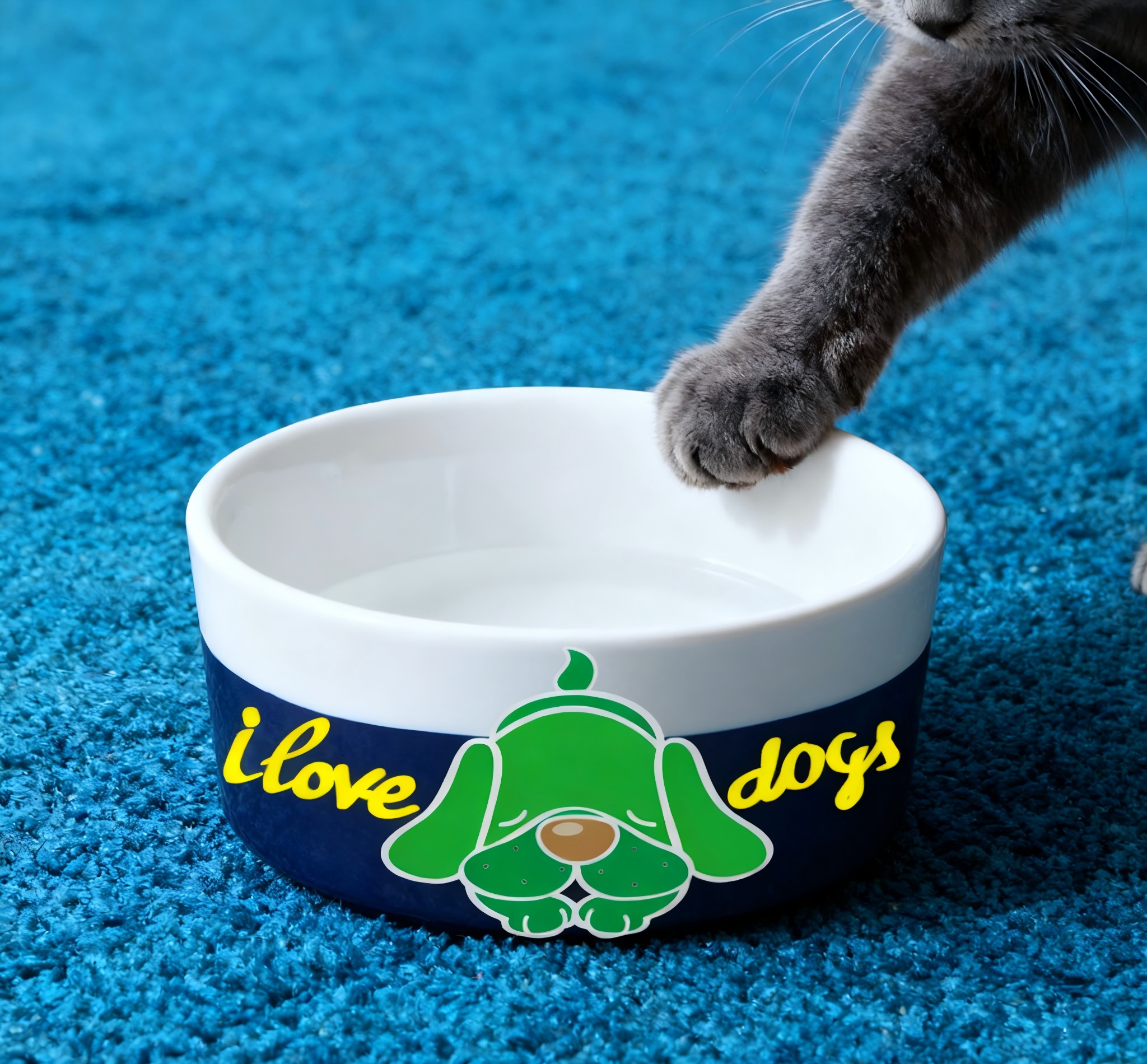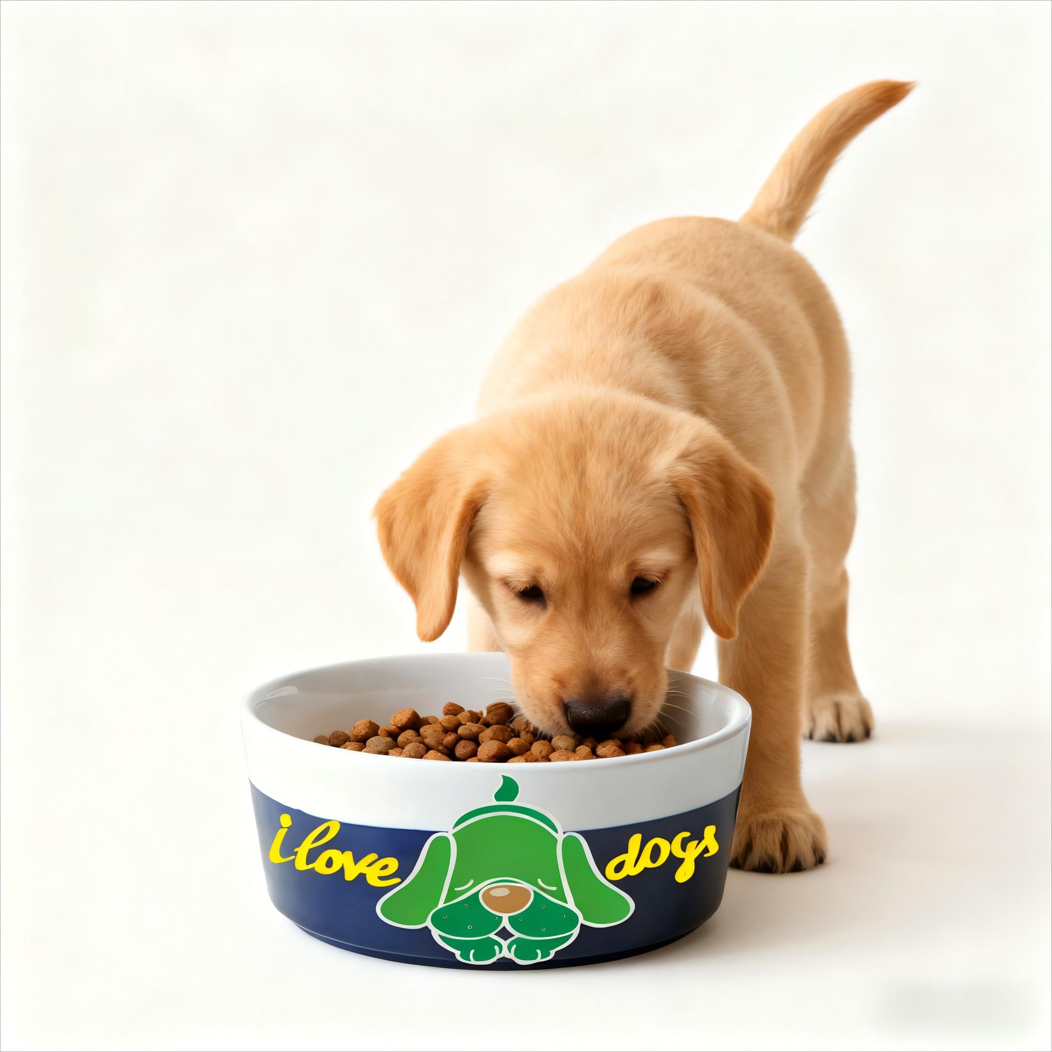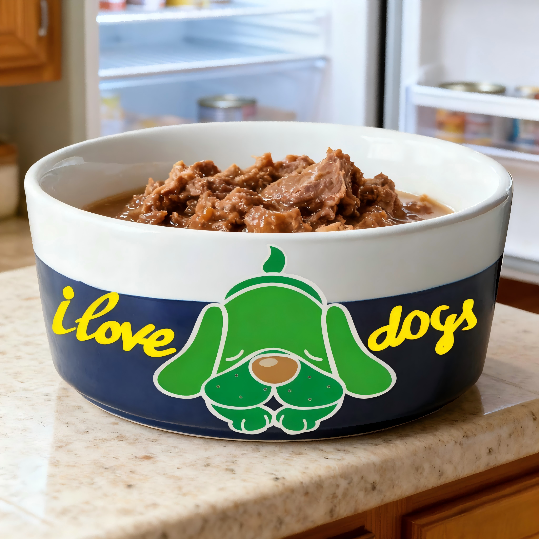 Design: Green cartoon dog with “I love dogs” text in yellow
