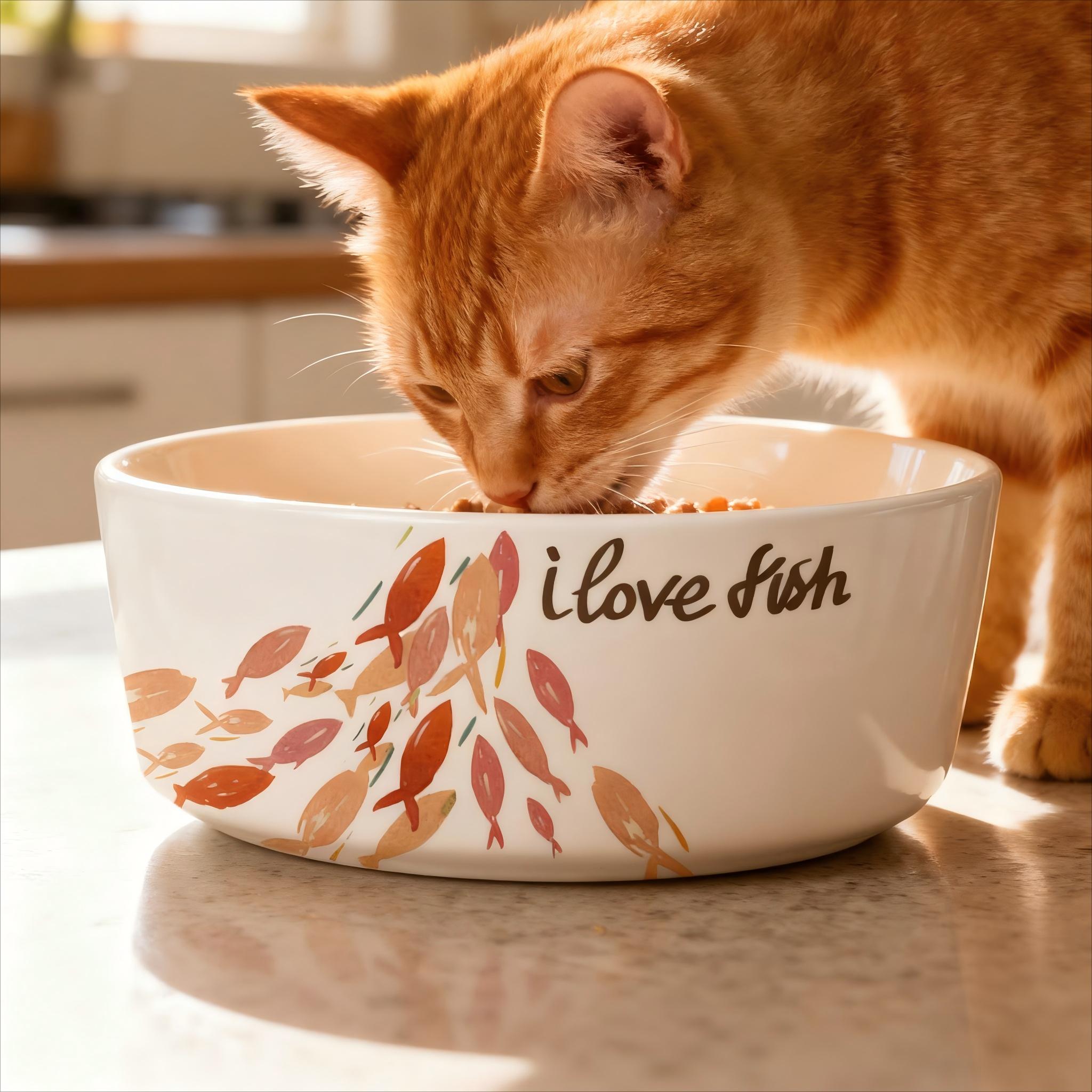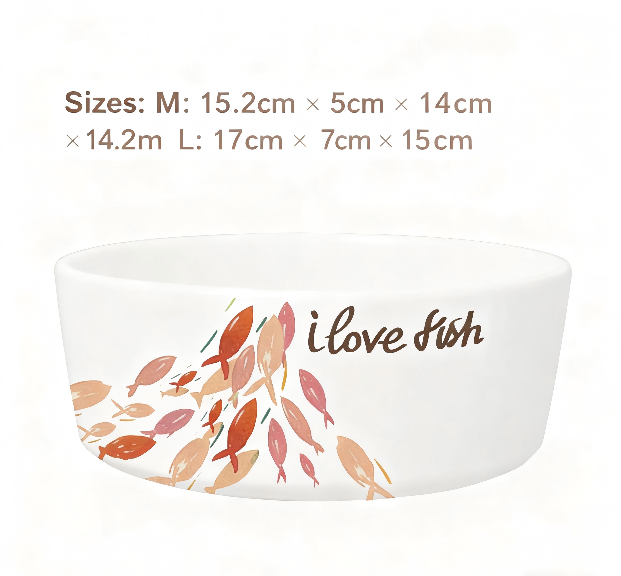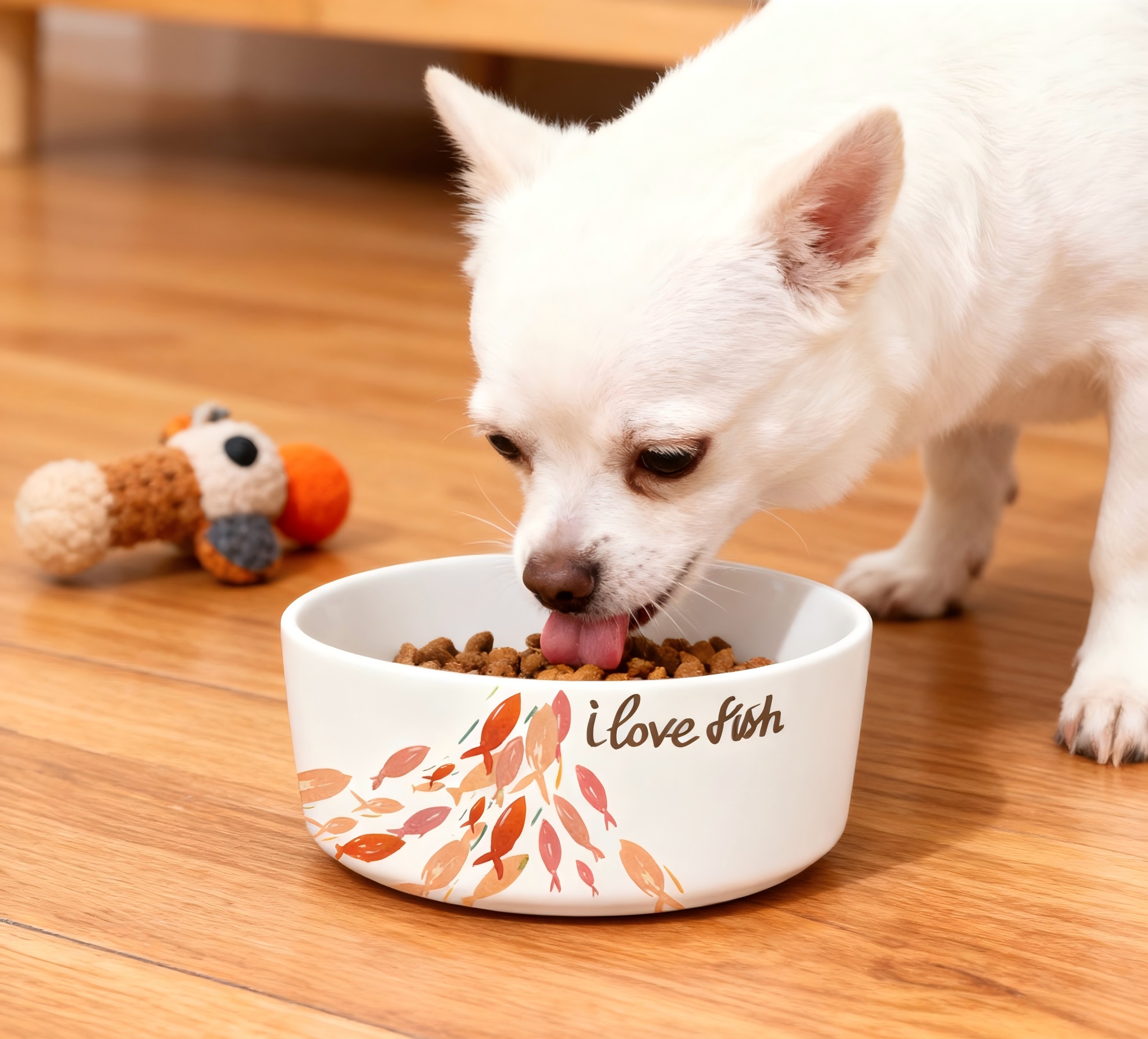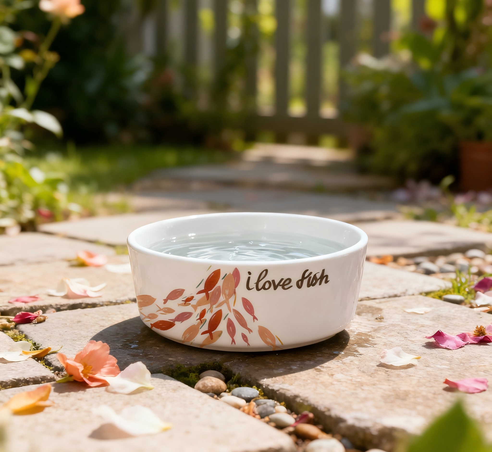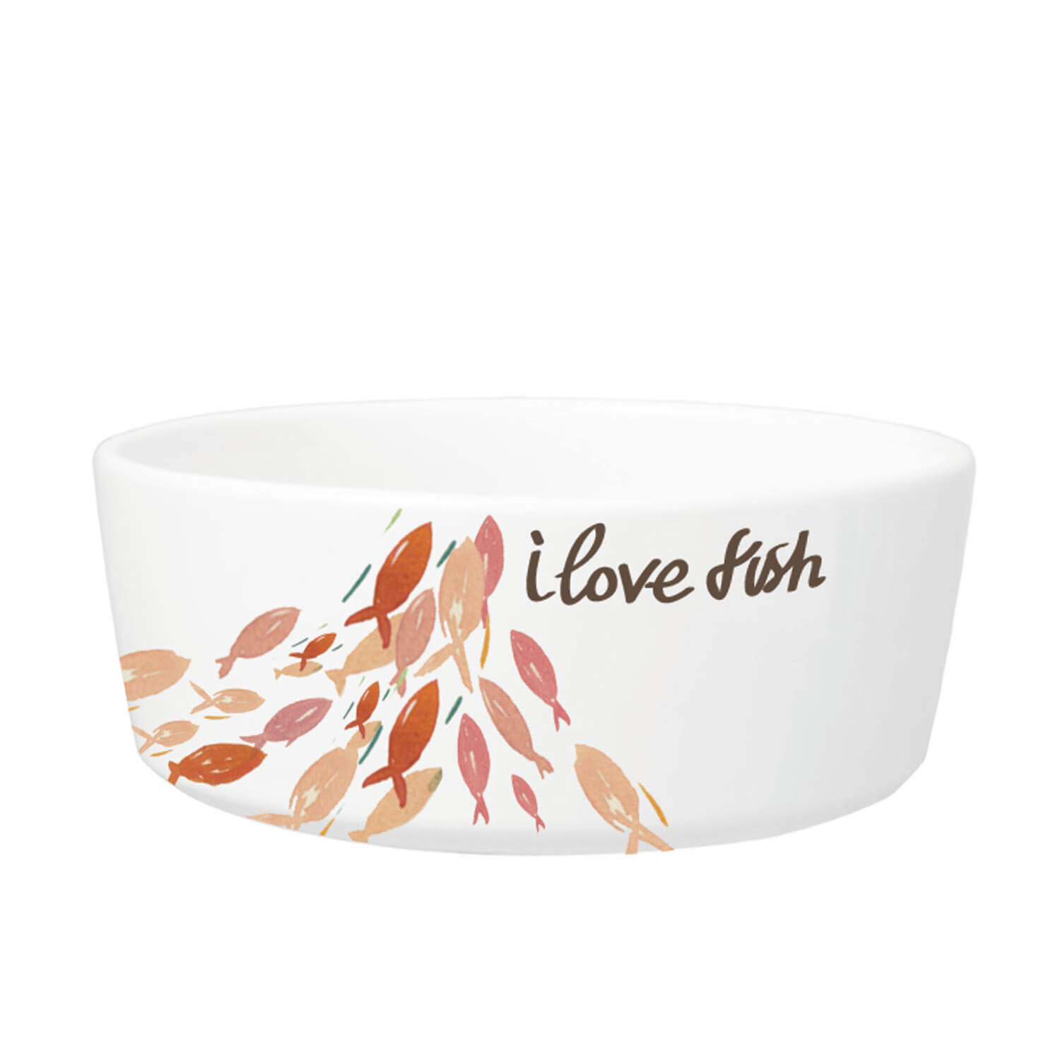 Color Scheme: White bowl with earthy orange and coral-toned fish