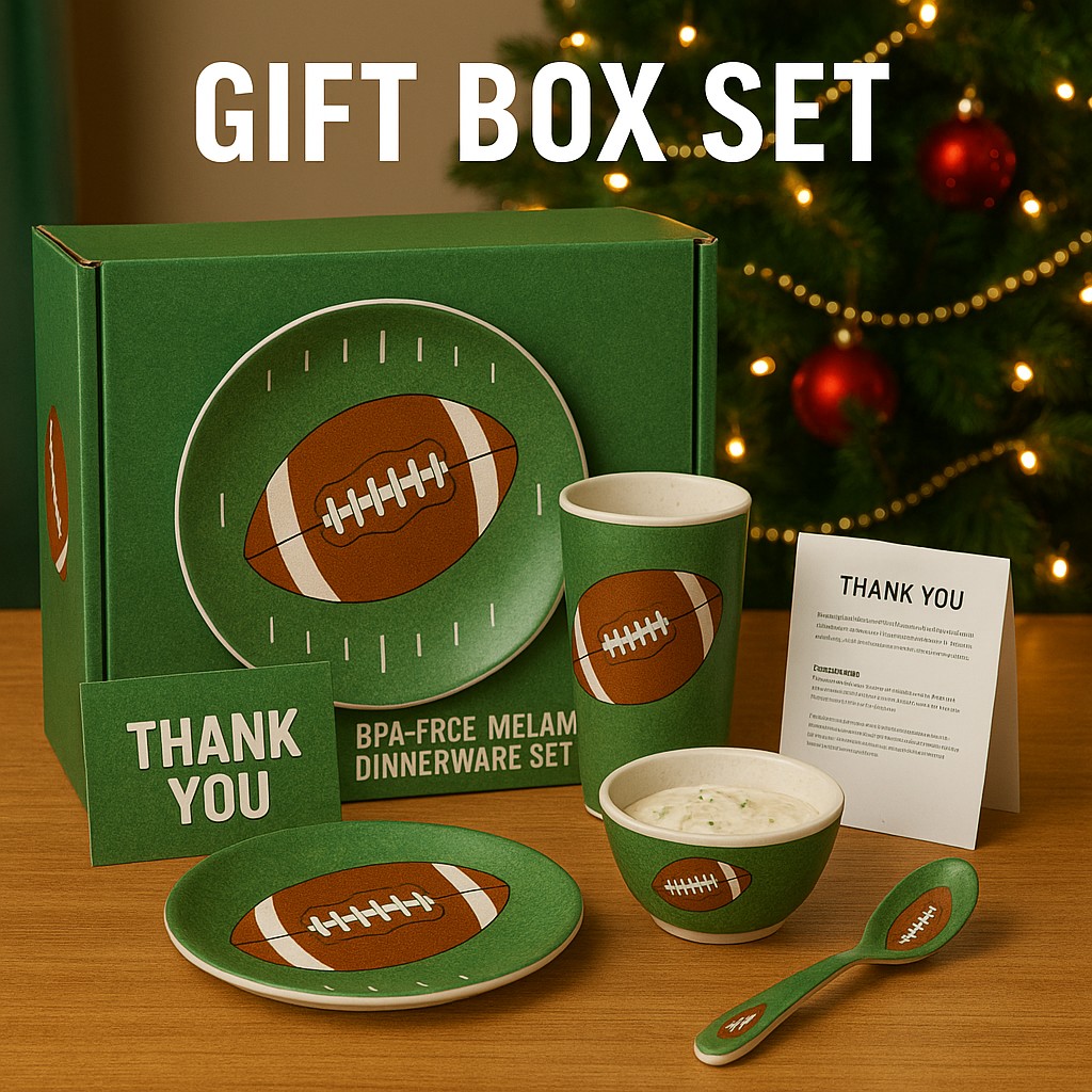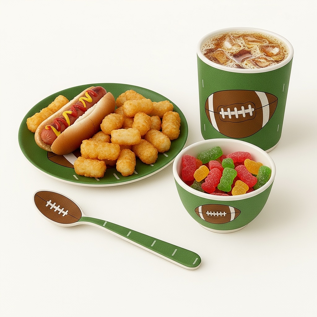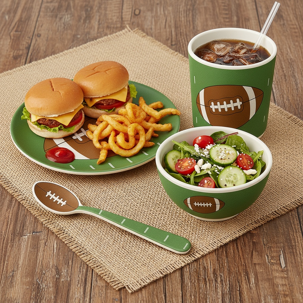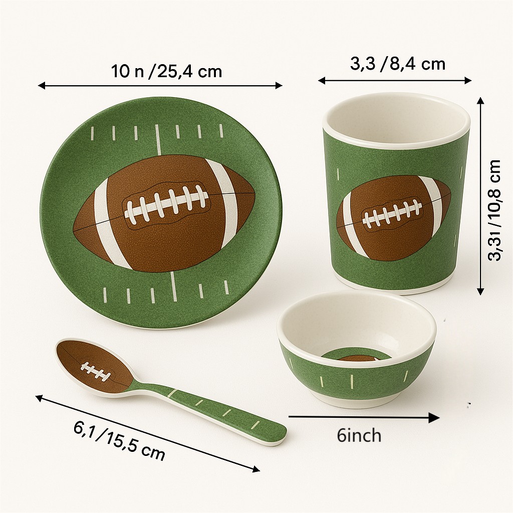 This football-themed bamboo fiber dinnerware set is perfect for little sports fans. Featuring a fun football field design, it turns mealtime into playtime.
