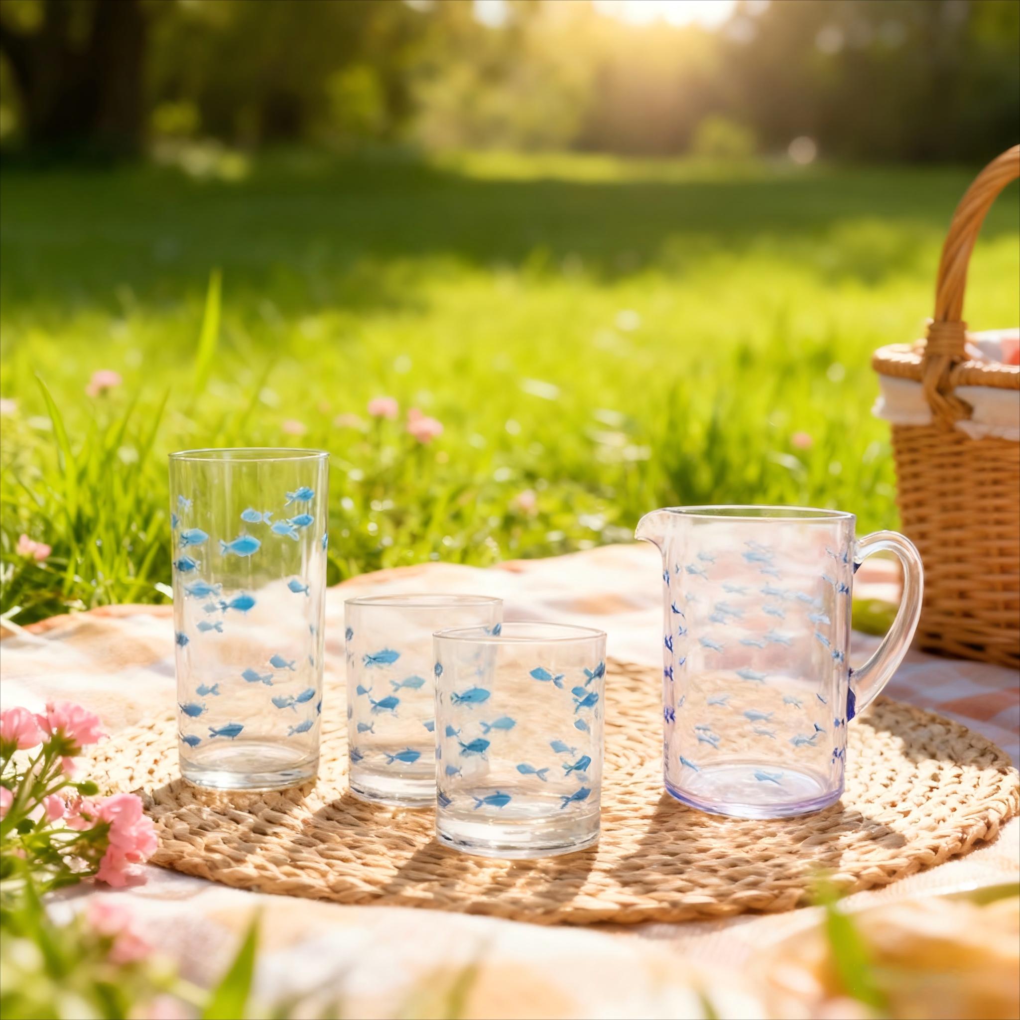 Set Includes: 1 pitcher, 1 stemless goblet, 2 short tumblers, 1 tall tumbler