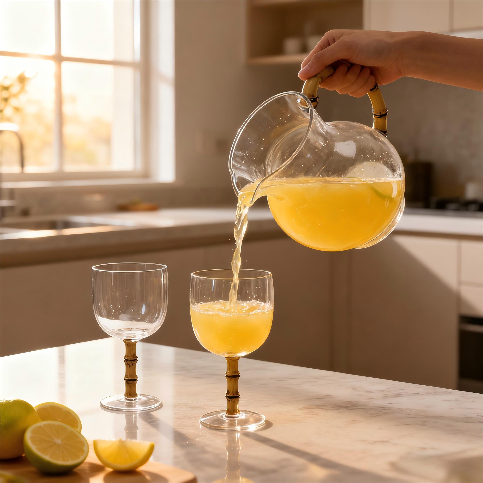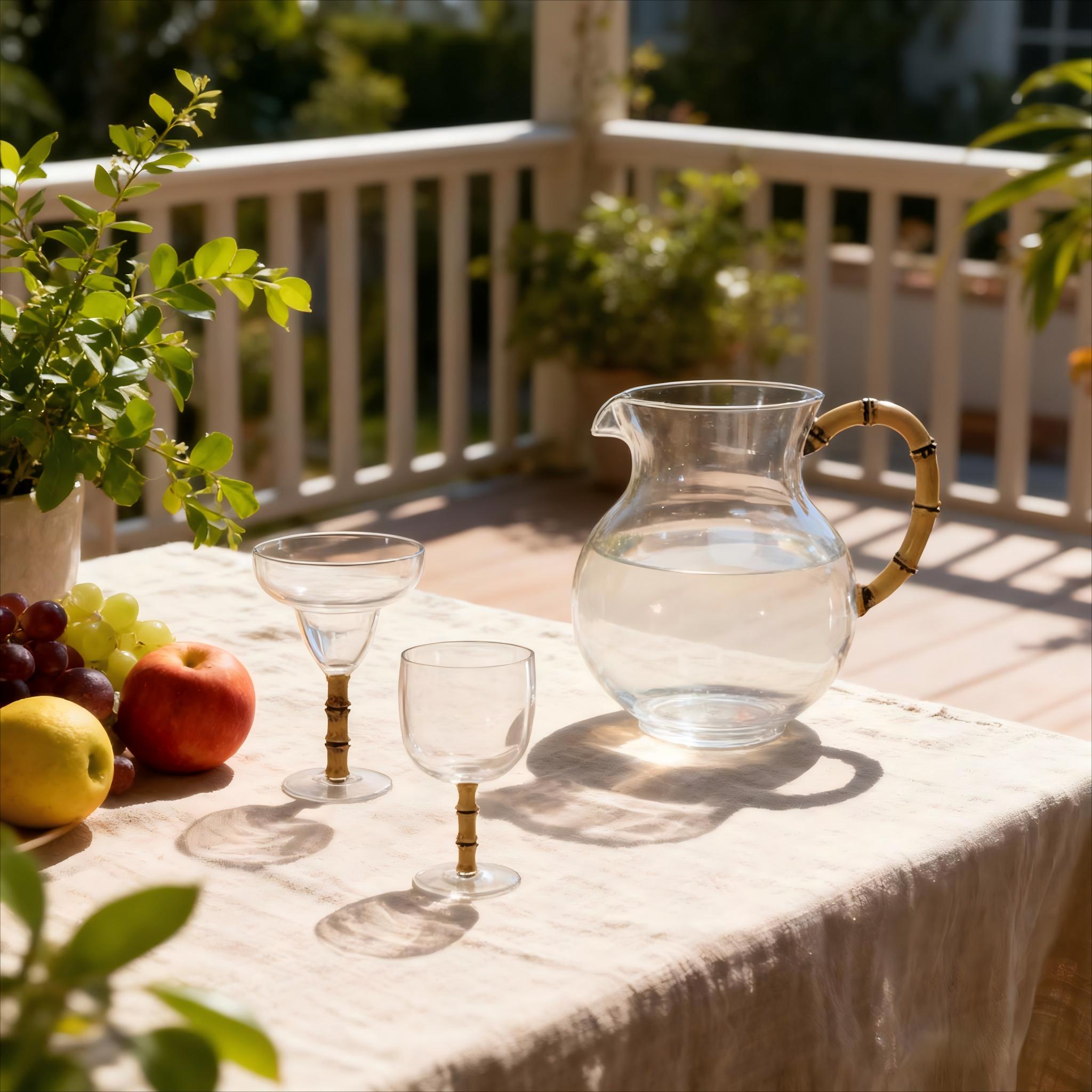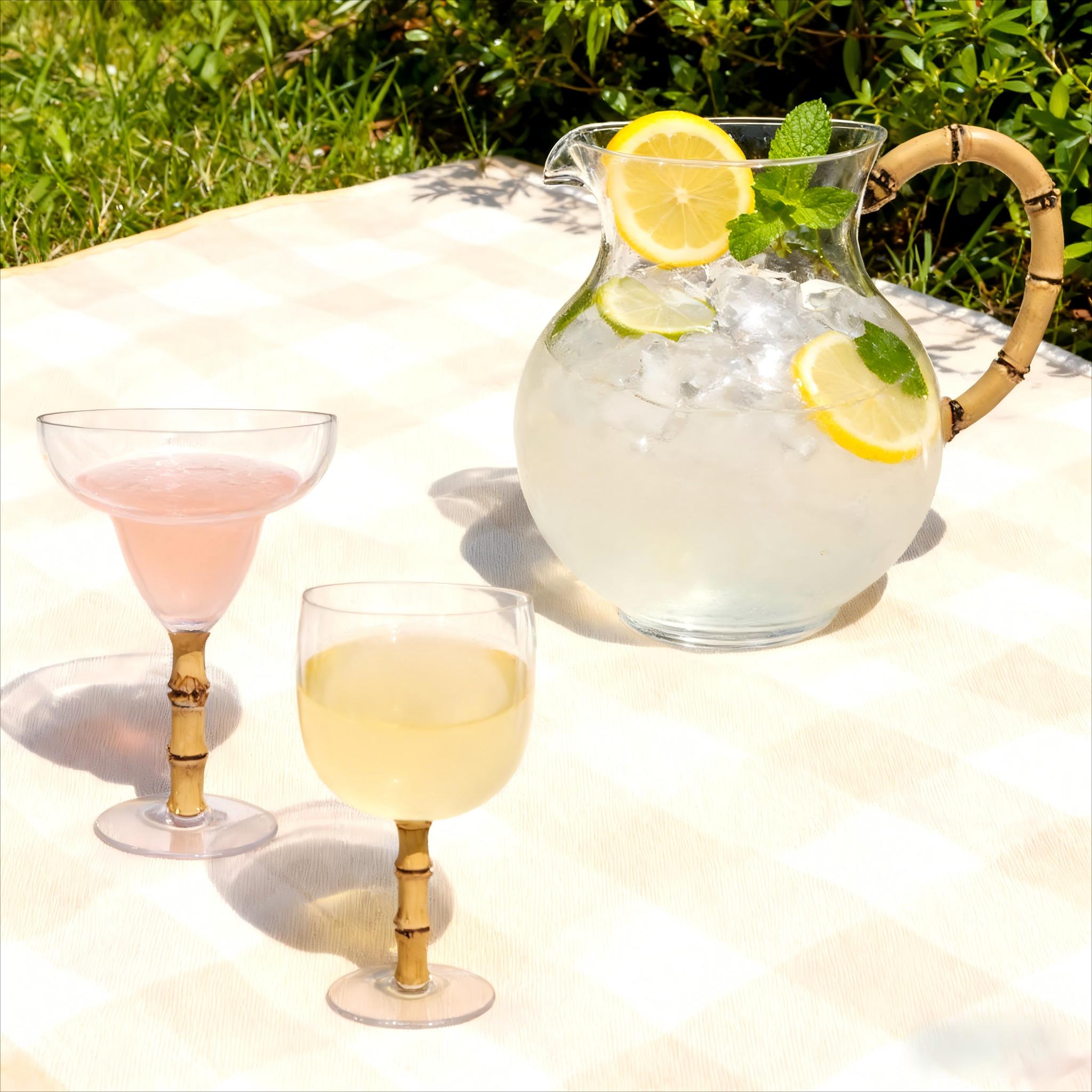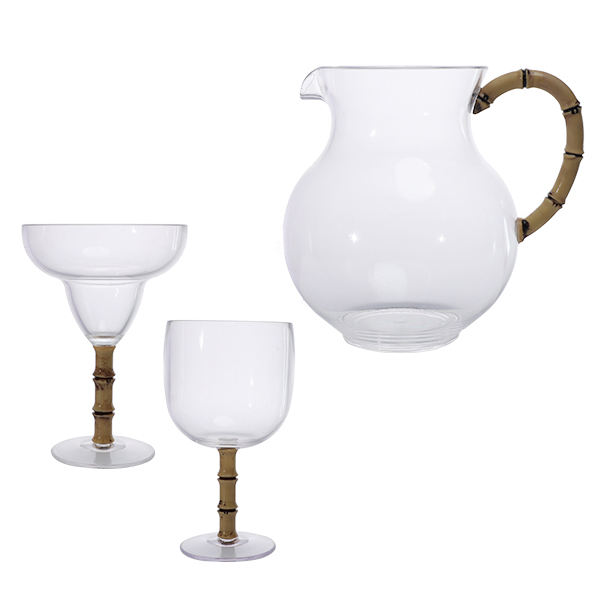 Set Includes: 1 pitcher with bamboo-style handle, 1 margarita glass, 1 wine goblet