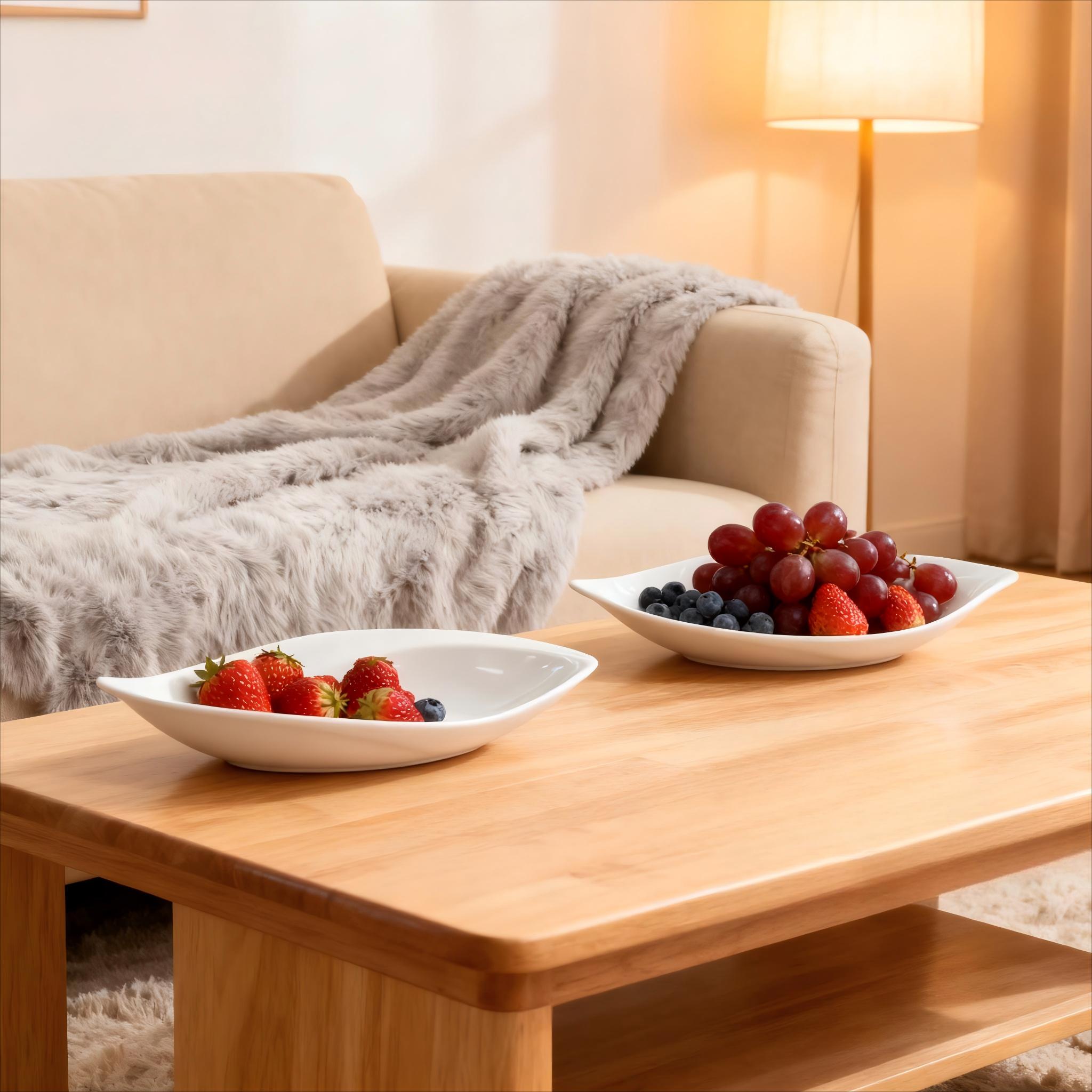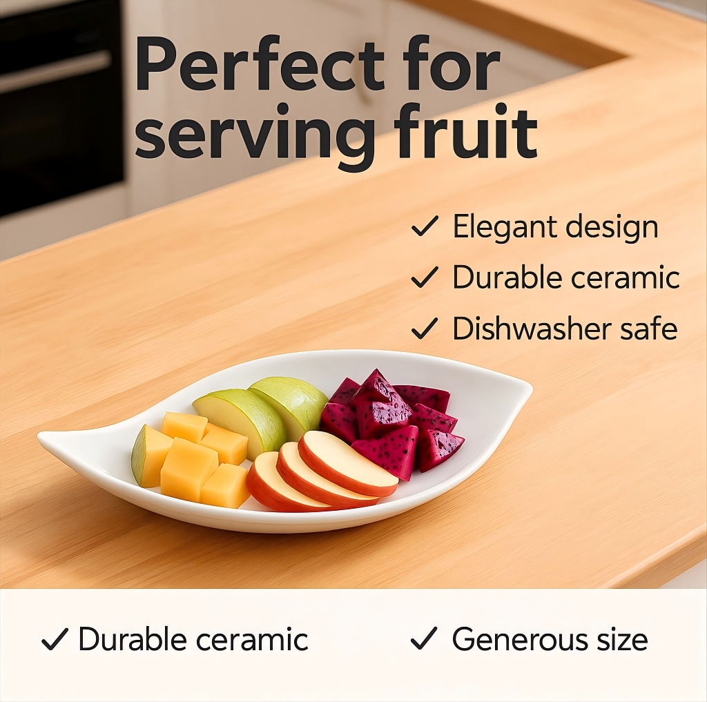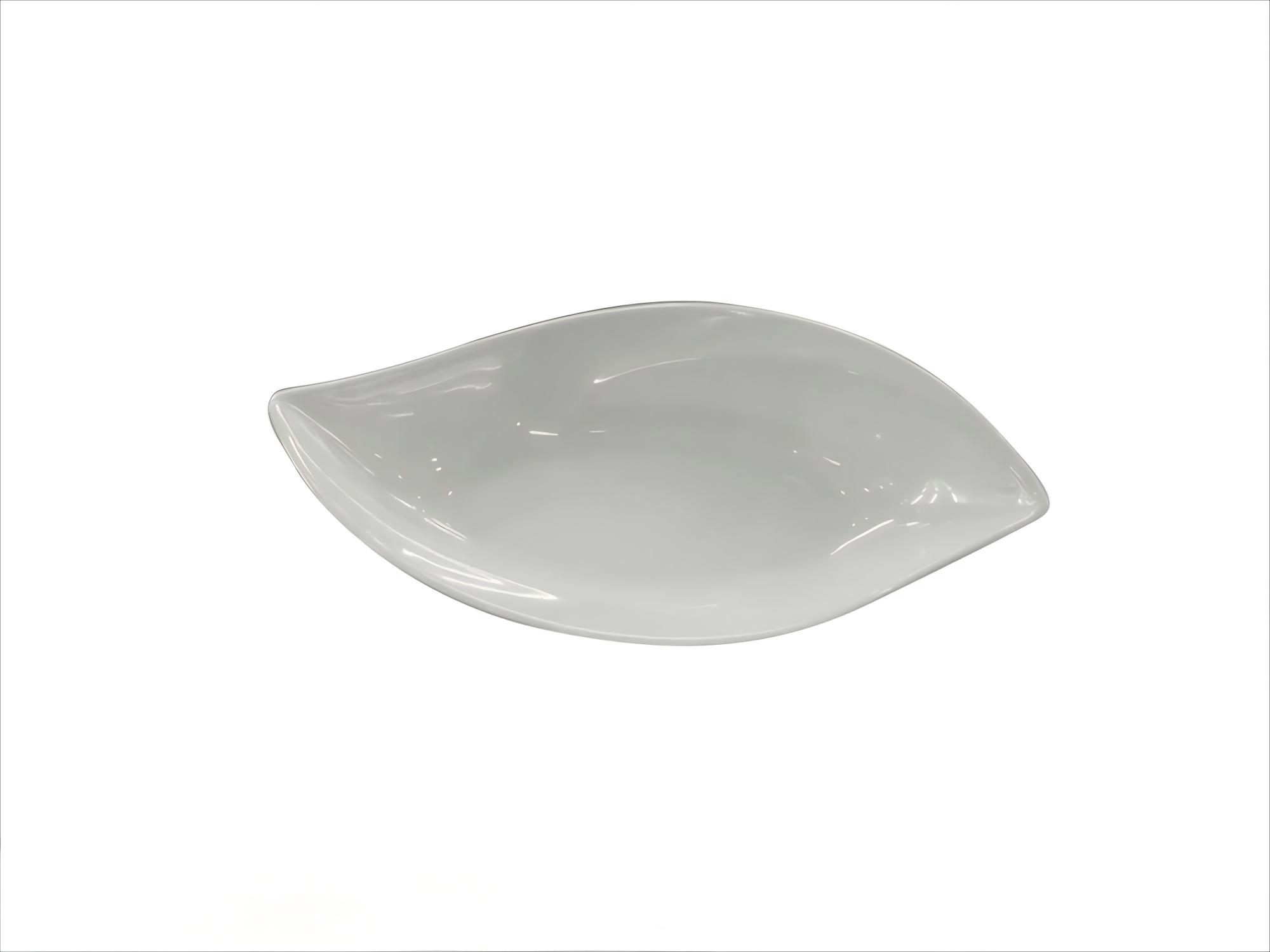 Elegant leaf-shaped melamine fruit plate measuring 25.5x12.7x4.5cm. Perfect for restaurants, hotels, and catering services. Designed for durability and modern presentation.