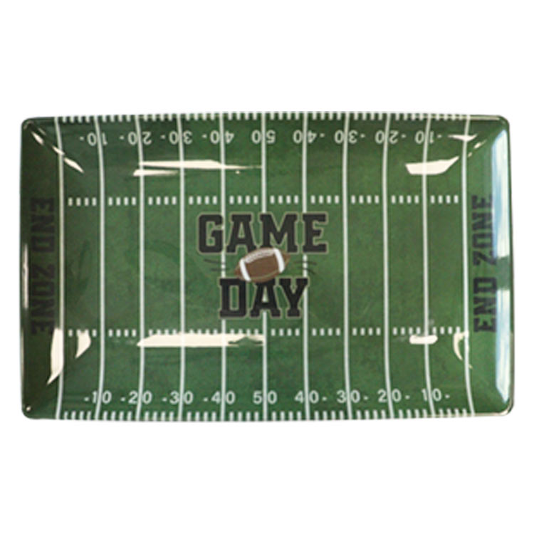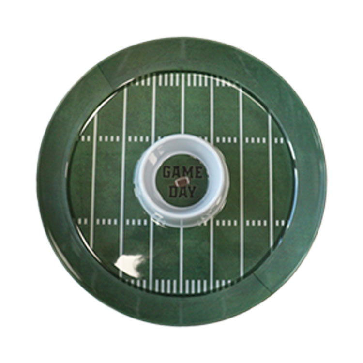 Get ready for the big game with this round melamine serving tray featuring a football field design and a central dip bowl marked "GAME DAY." Perfect for chips, wings, veggies, and dips, this tray is both festive and functional — ideal for tailgating, Super Bowl parties, and sports-themed gatherings.