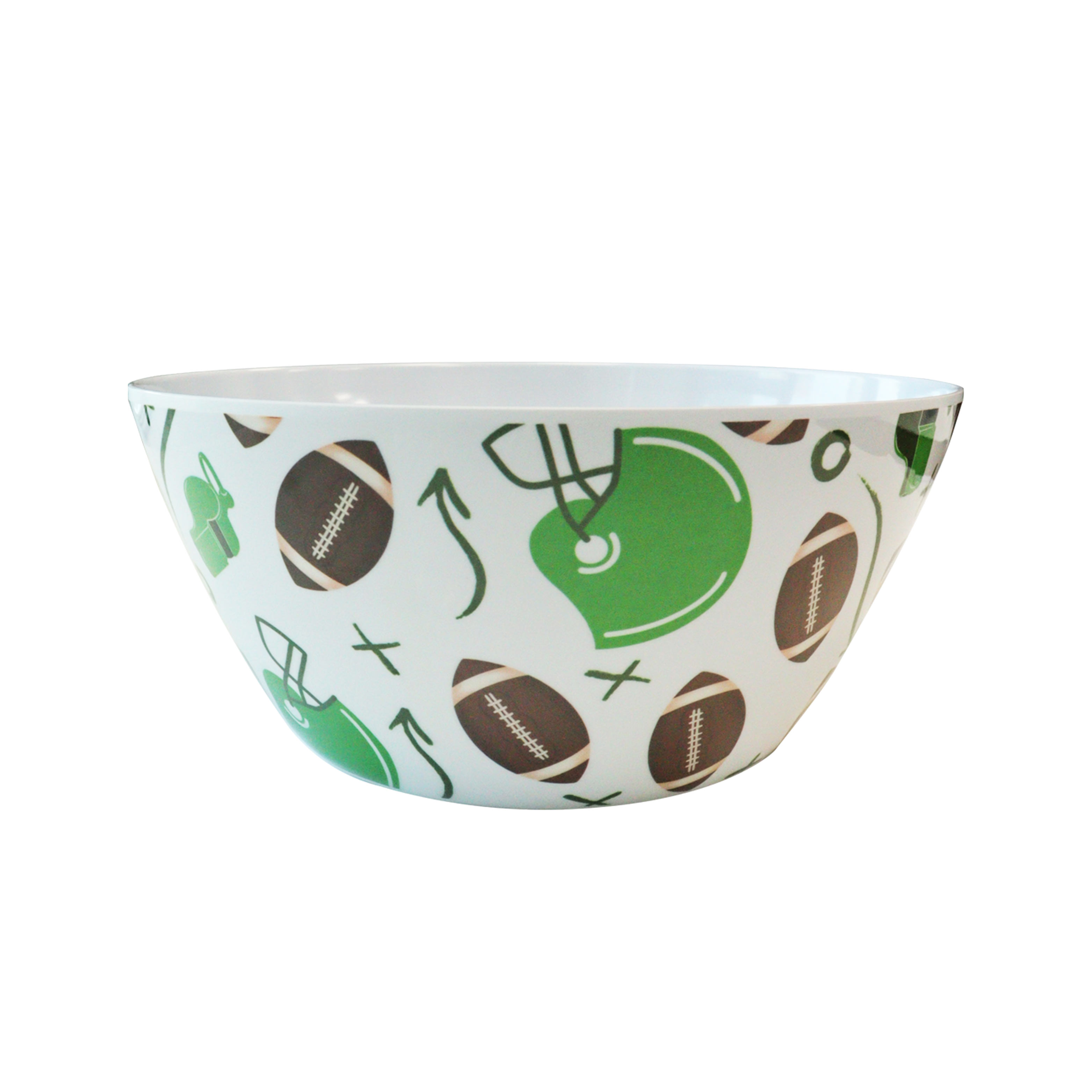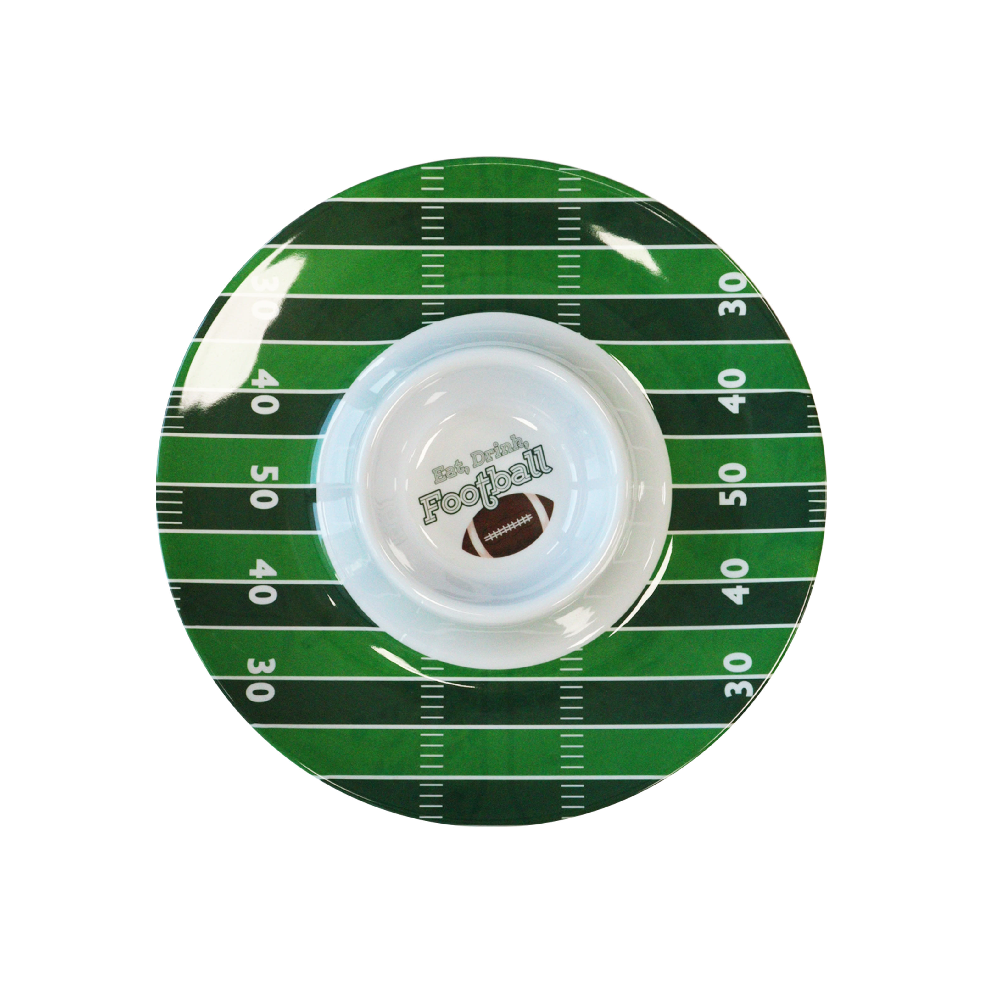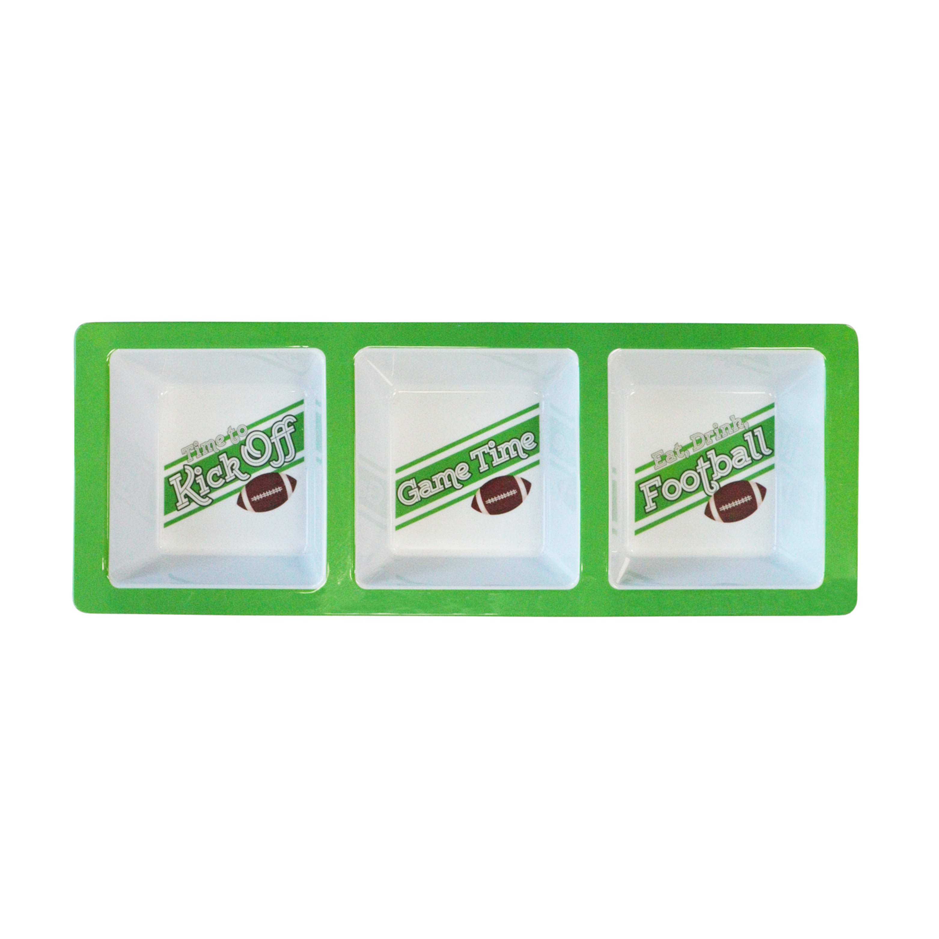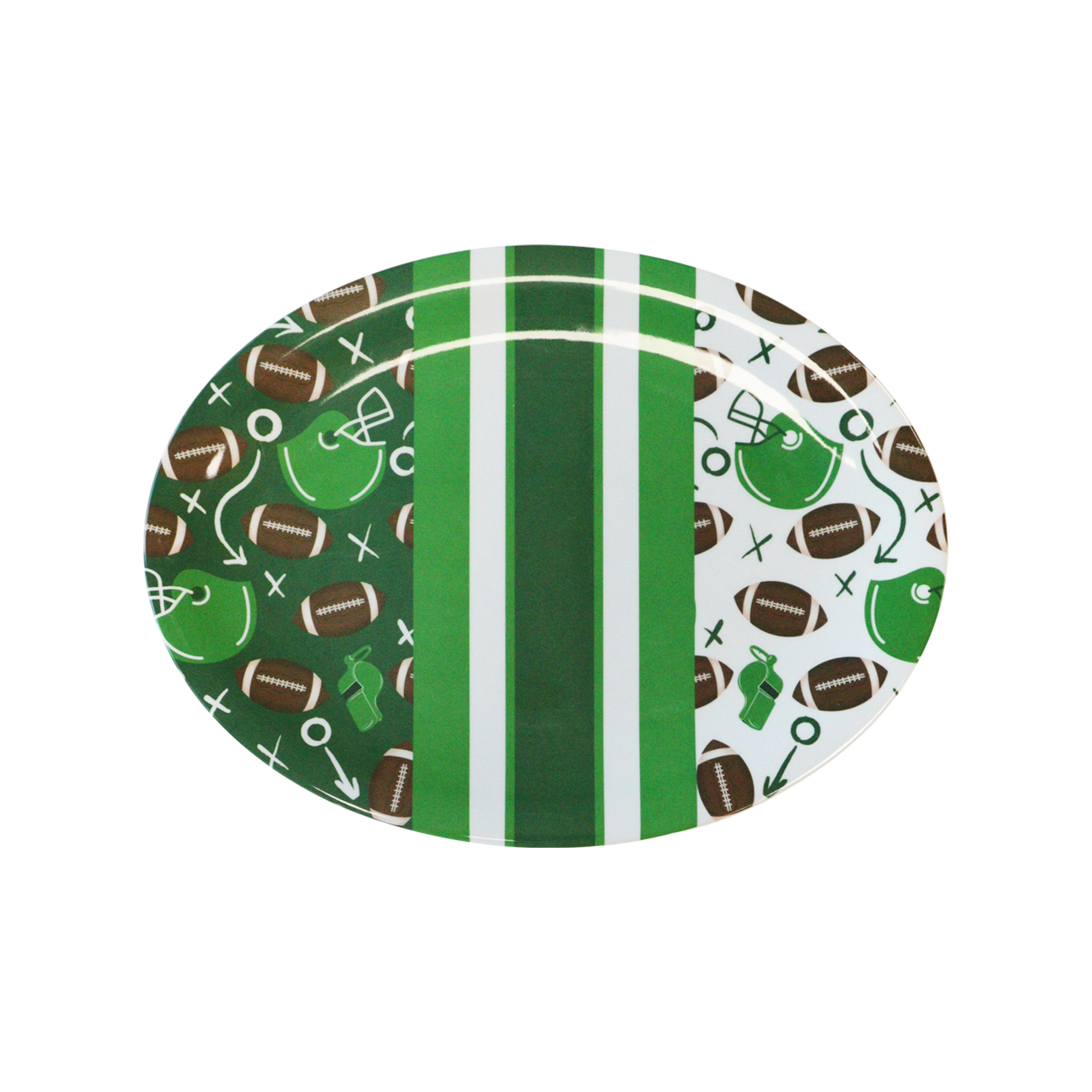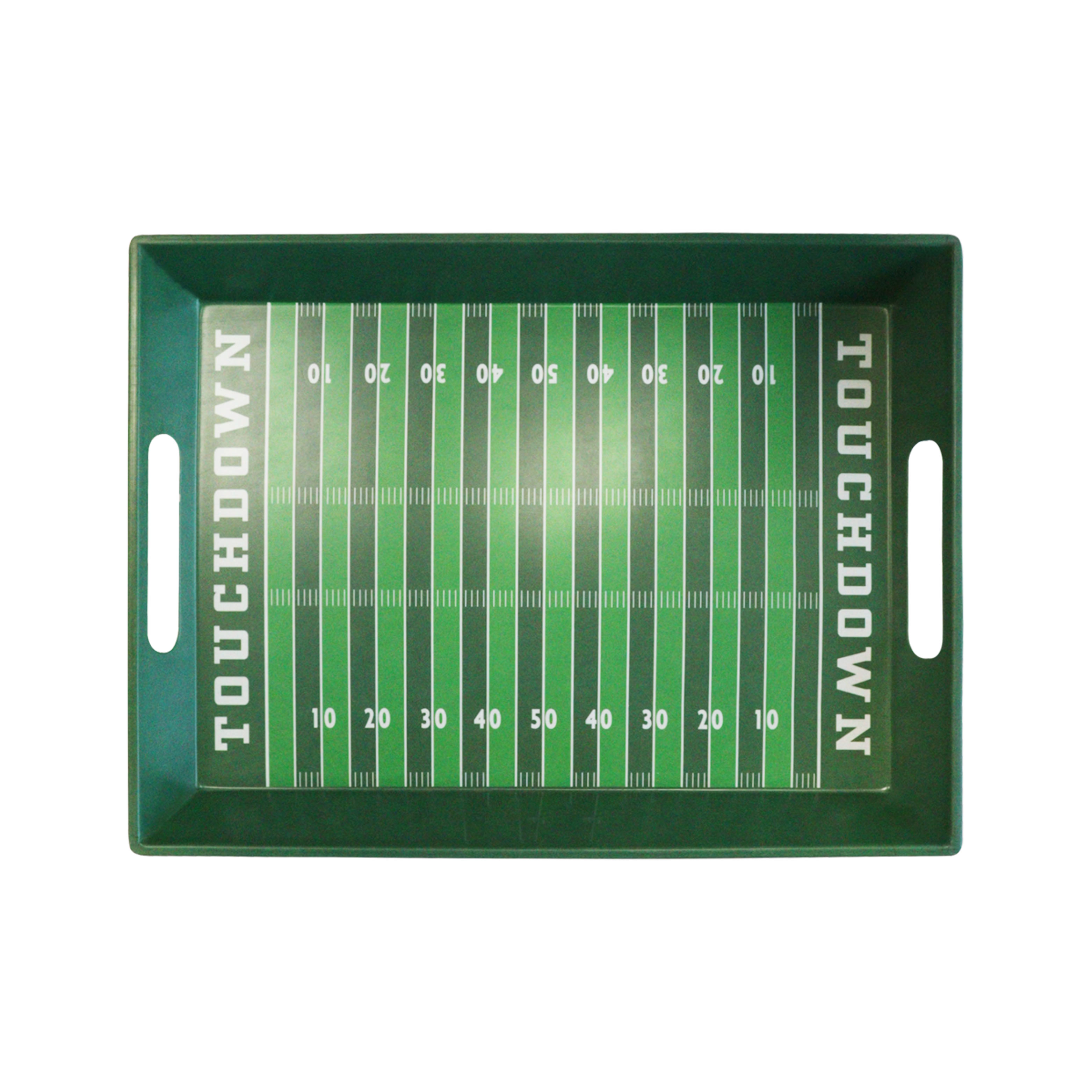 Serve your snacks in sporty style with this football field-themed rectangular tray. Made from durable melamine and featuring side handles for easy carrying, it's the perfect accessory for tailgating, Super Bowl parties, and football-themed gatherings. “TOUCHDOWN” graphics on both sides add the ultimate game day flair!