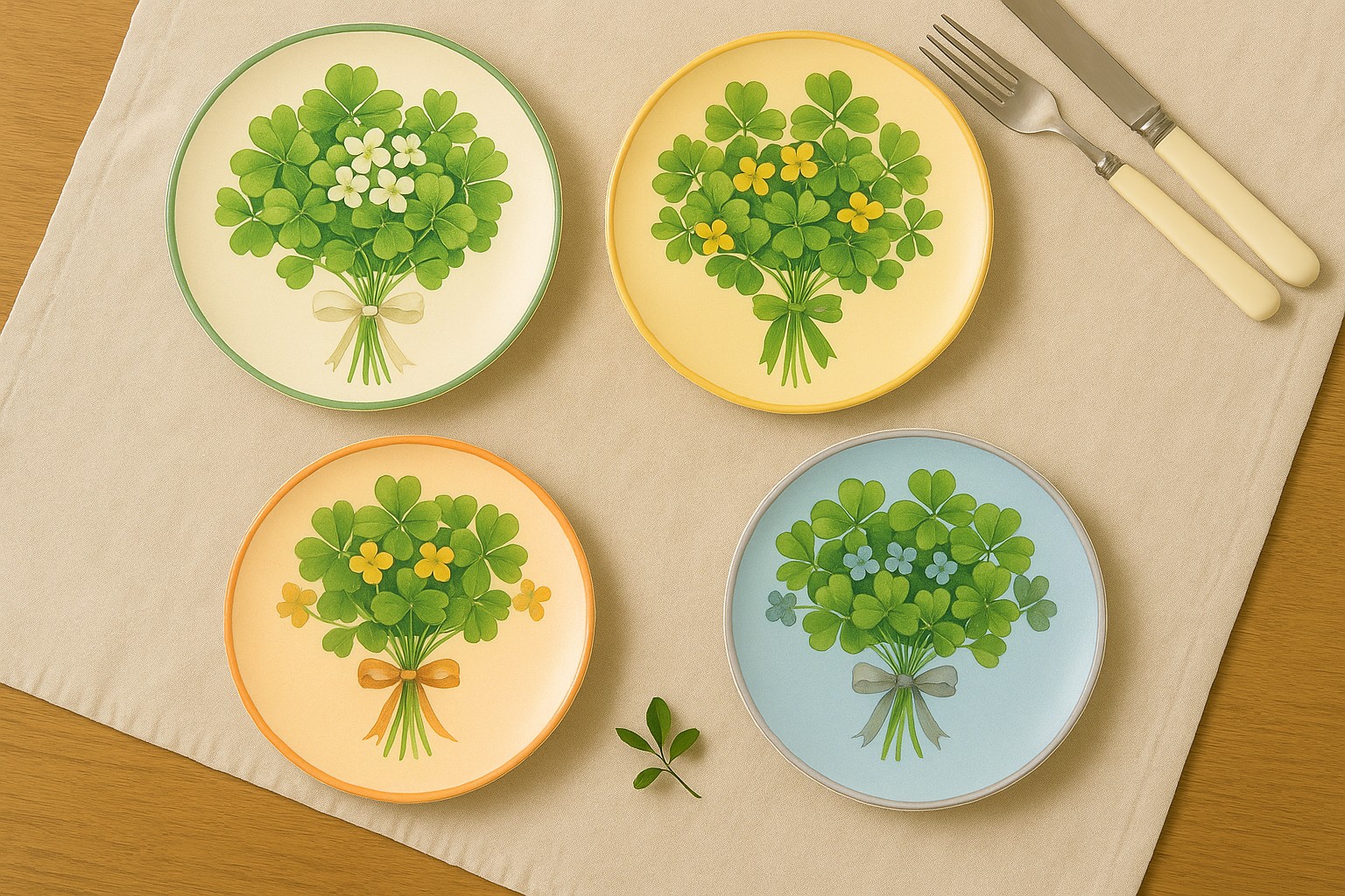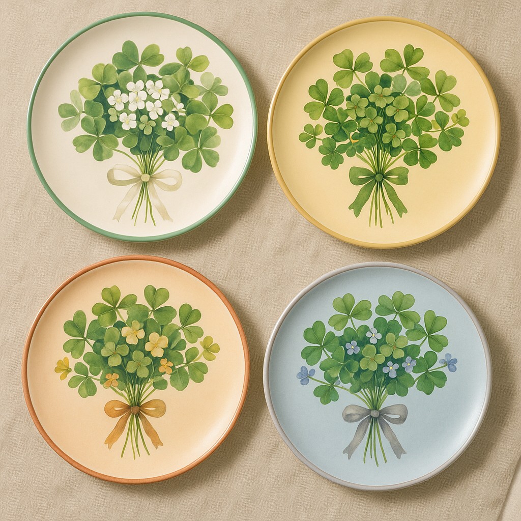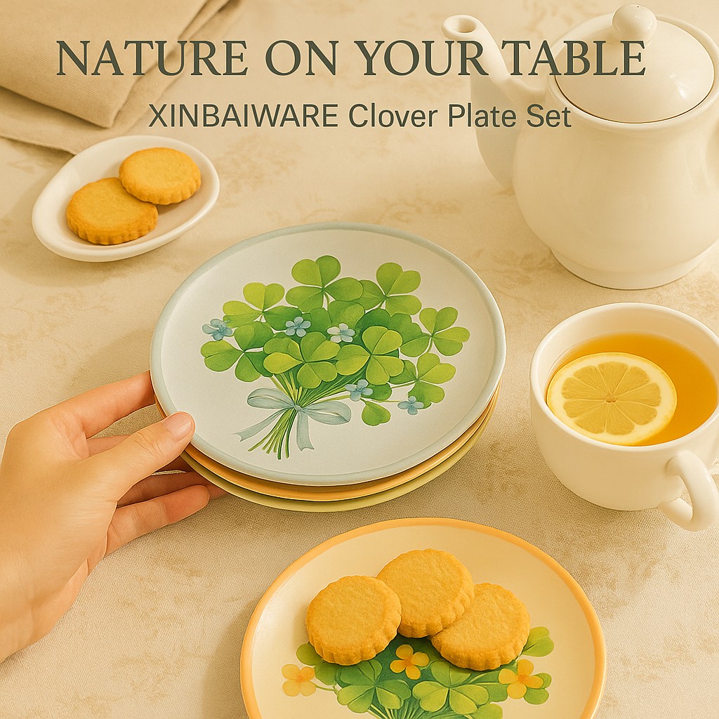 dd a refreshing touch of nature to your table with this 4-piece Clover Collection melamine plate set by XINBAIWARE. Featuring charming clover bouquet illustrations in four soft color tones, this set is perfect for everyday use, spring dining, picnics, and thoughtful gifting.