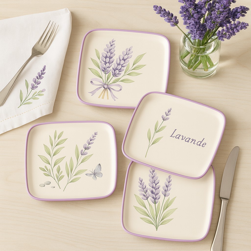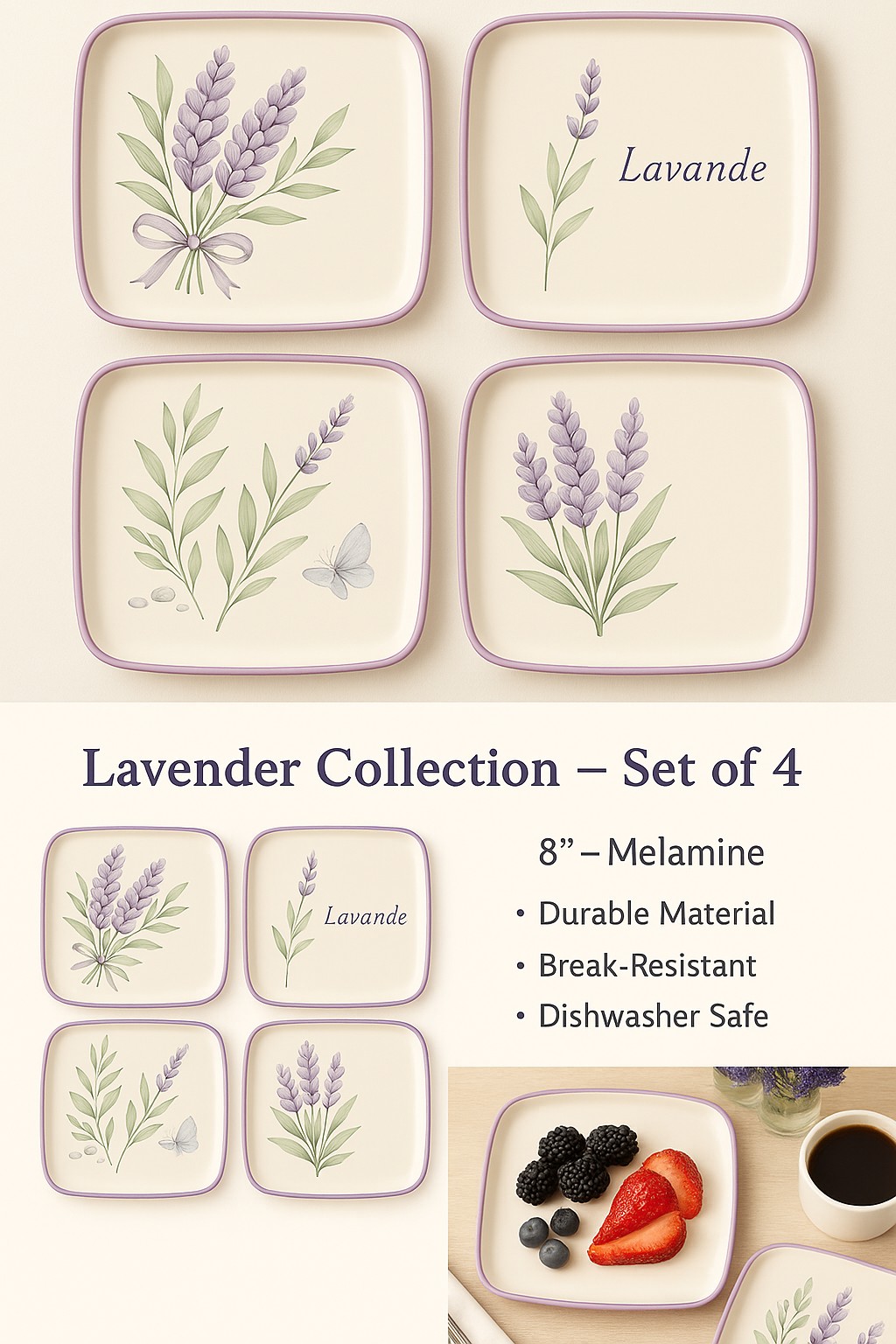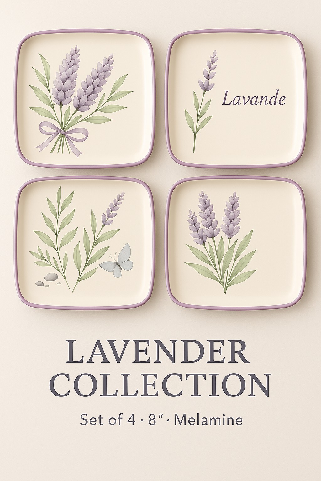 Capture the calming charm of Provence with this 4-piece lavender melamine plate set. Featuring delicate botanical illustrations and pastel purple rims, this collection is ideal for spring dining, home décor, or a relaxing tablescape that soothes the senses.