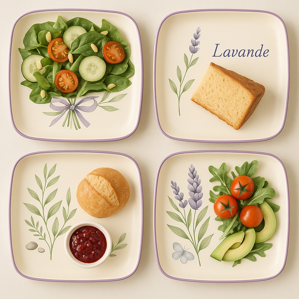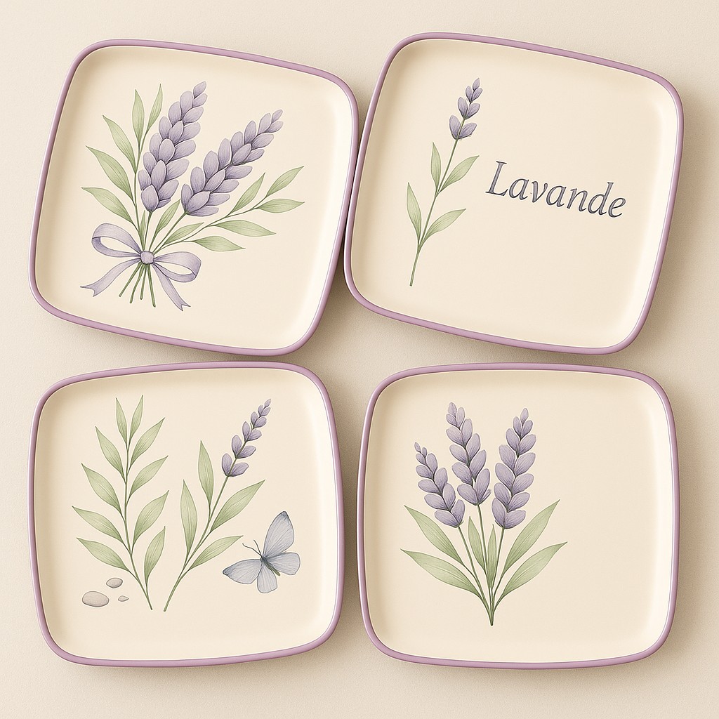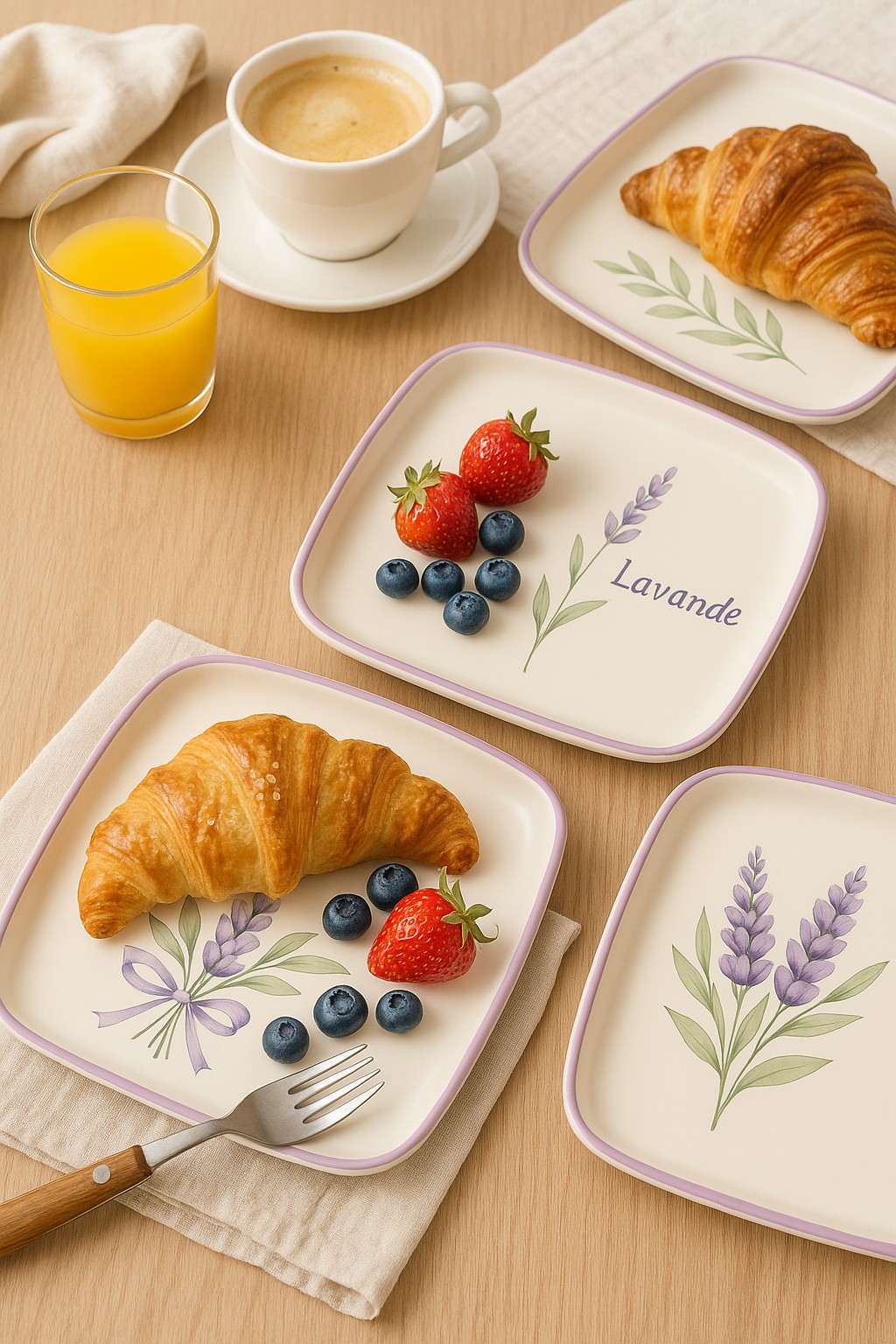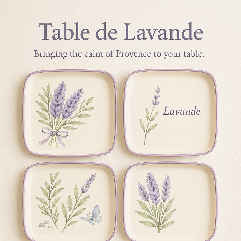 Capture the calming charm of Provence with this 4-piece lavender melamine plate set. Featuring delicate botanical illustrations and pastel purple rims, this collection is ideal for spring dining, home décor, or a relaxing tablescape that soothes the senses.