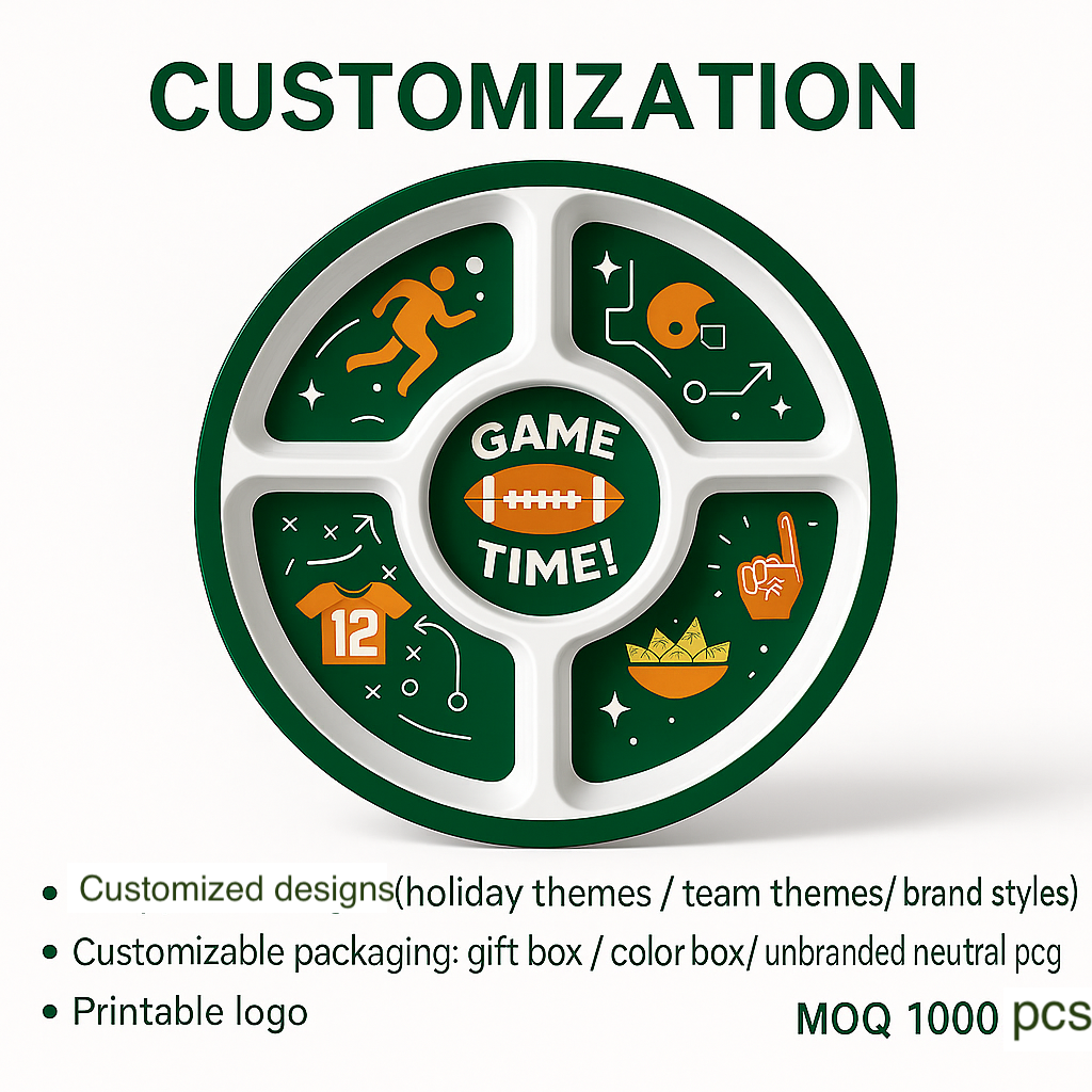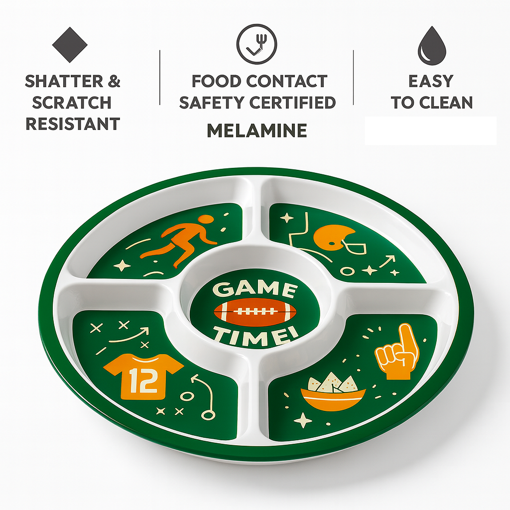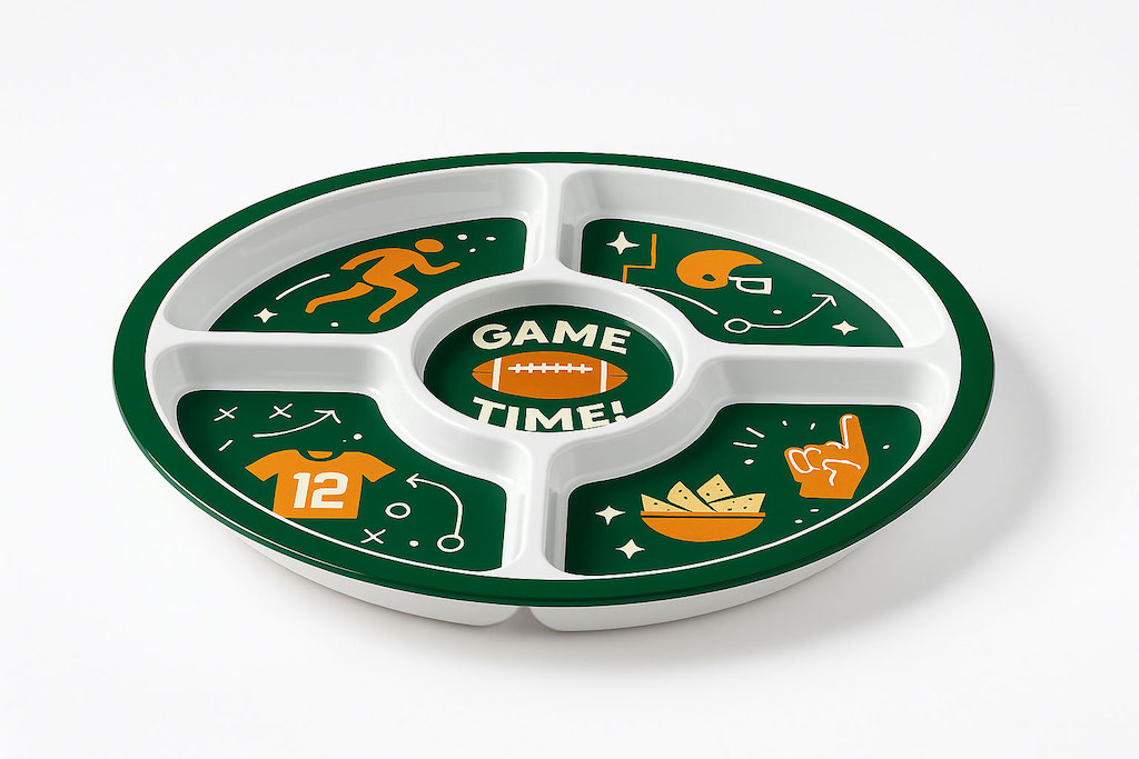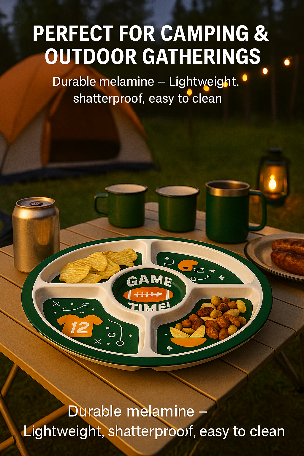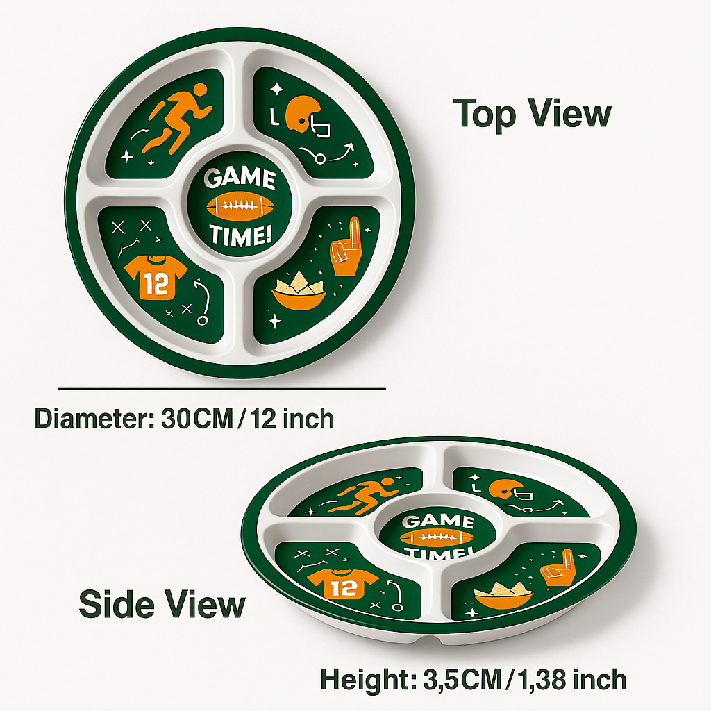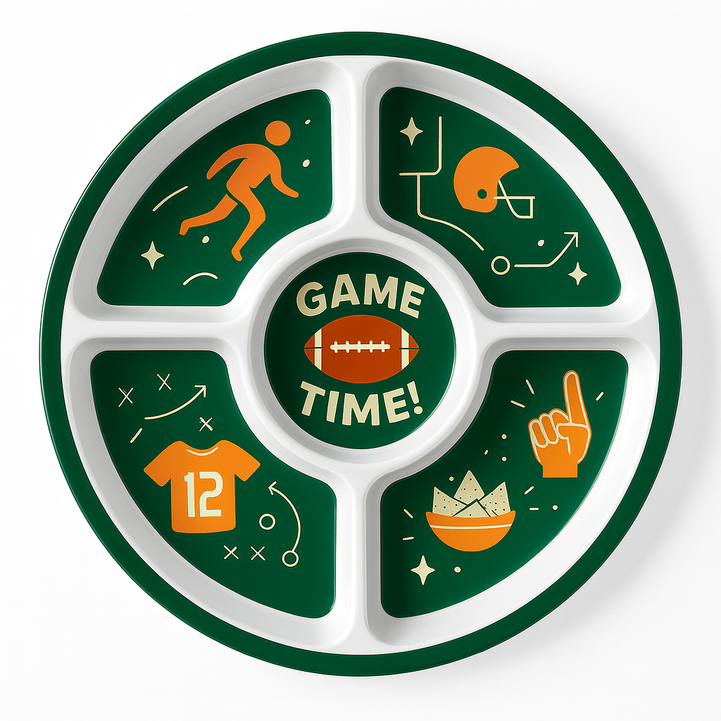 Bring the excitement of game day to your table! This football-themed snack serving tray features 5 divided compartments perfect for chips, dips, wings, nuts, and more. With fun sports graphics and “Game Time” design, it’s ideal for Super Bowl parties, family gatherings, or tailgating events. Durable, reusable, and easy to clean — a must-have for football fans who love to snack in style.