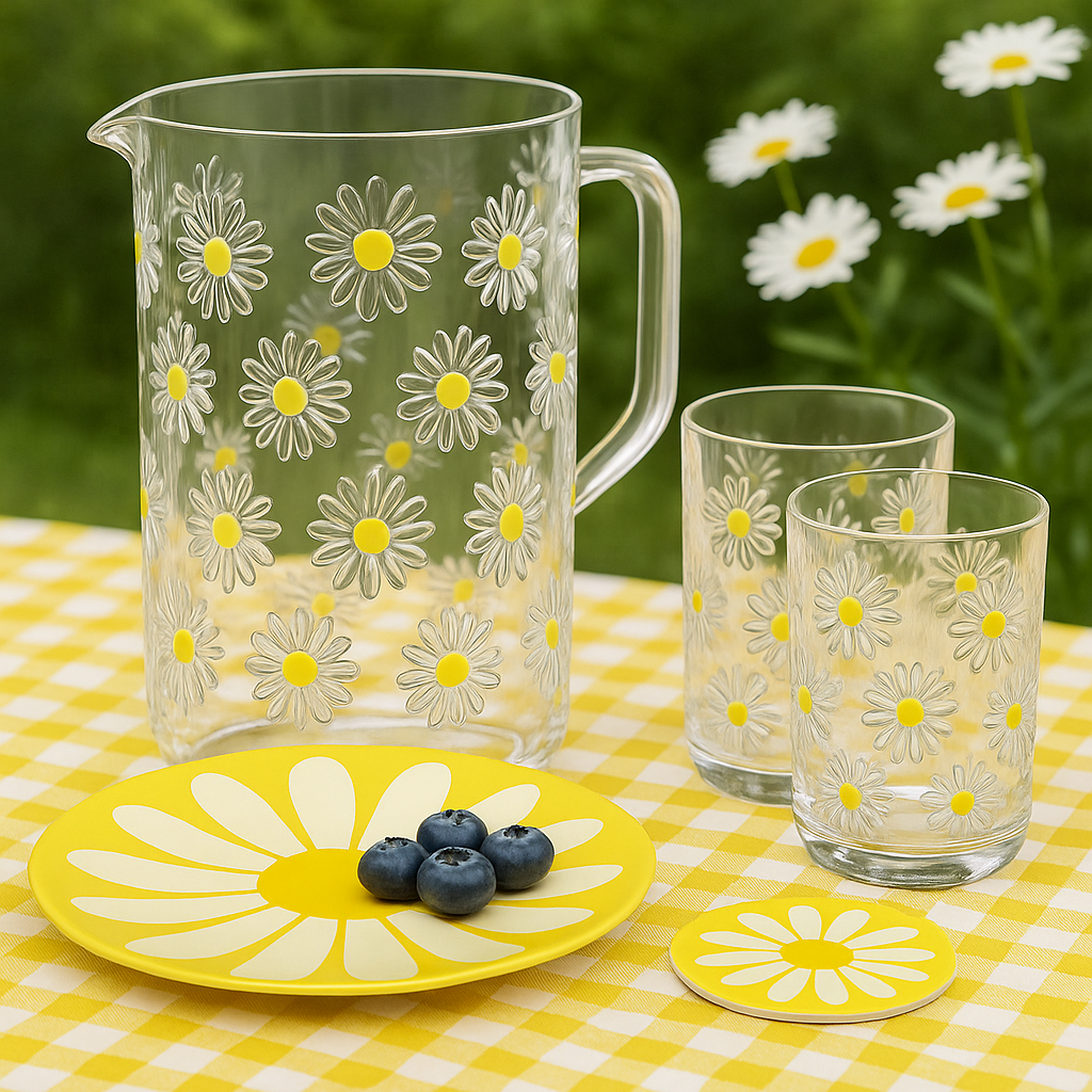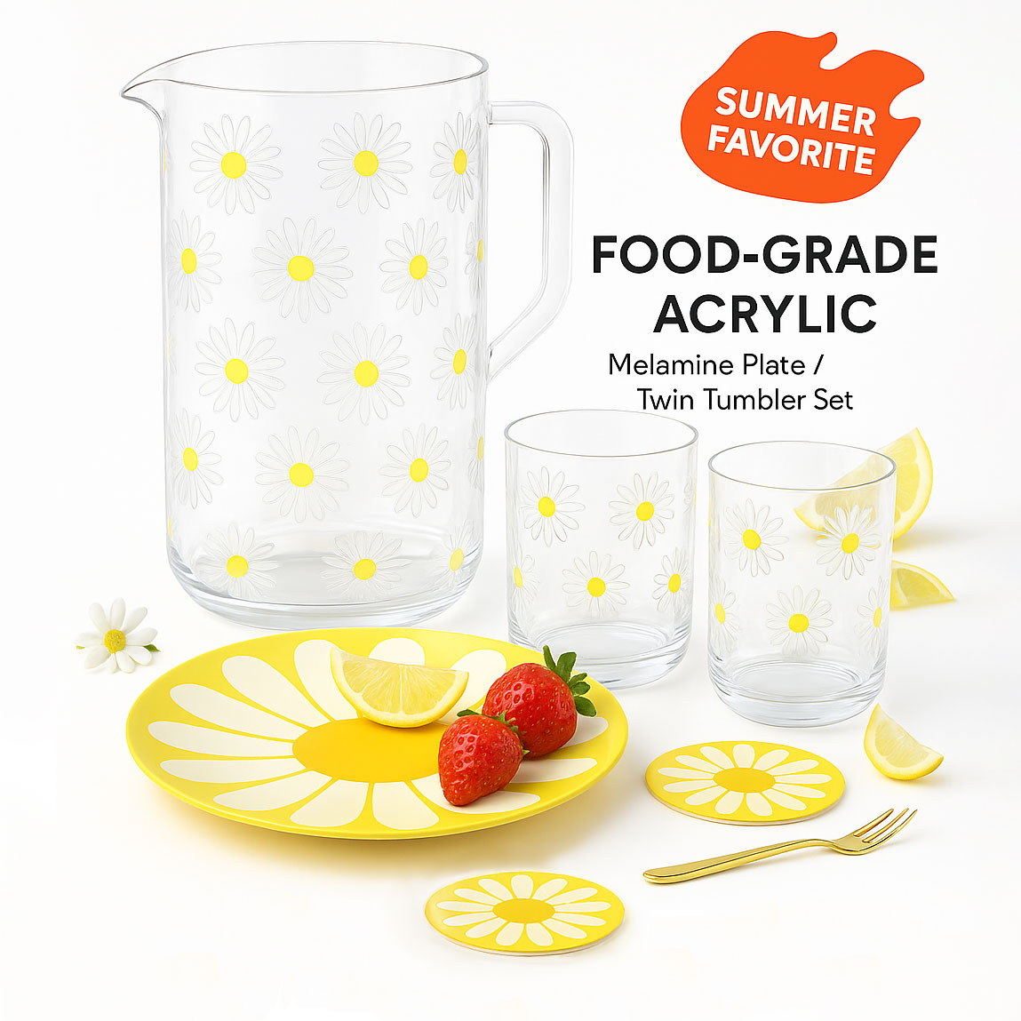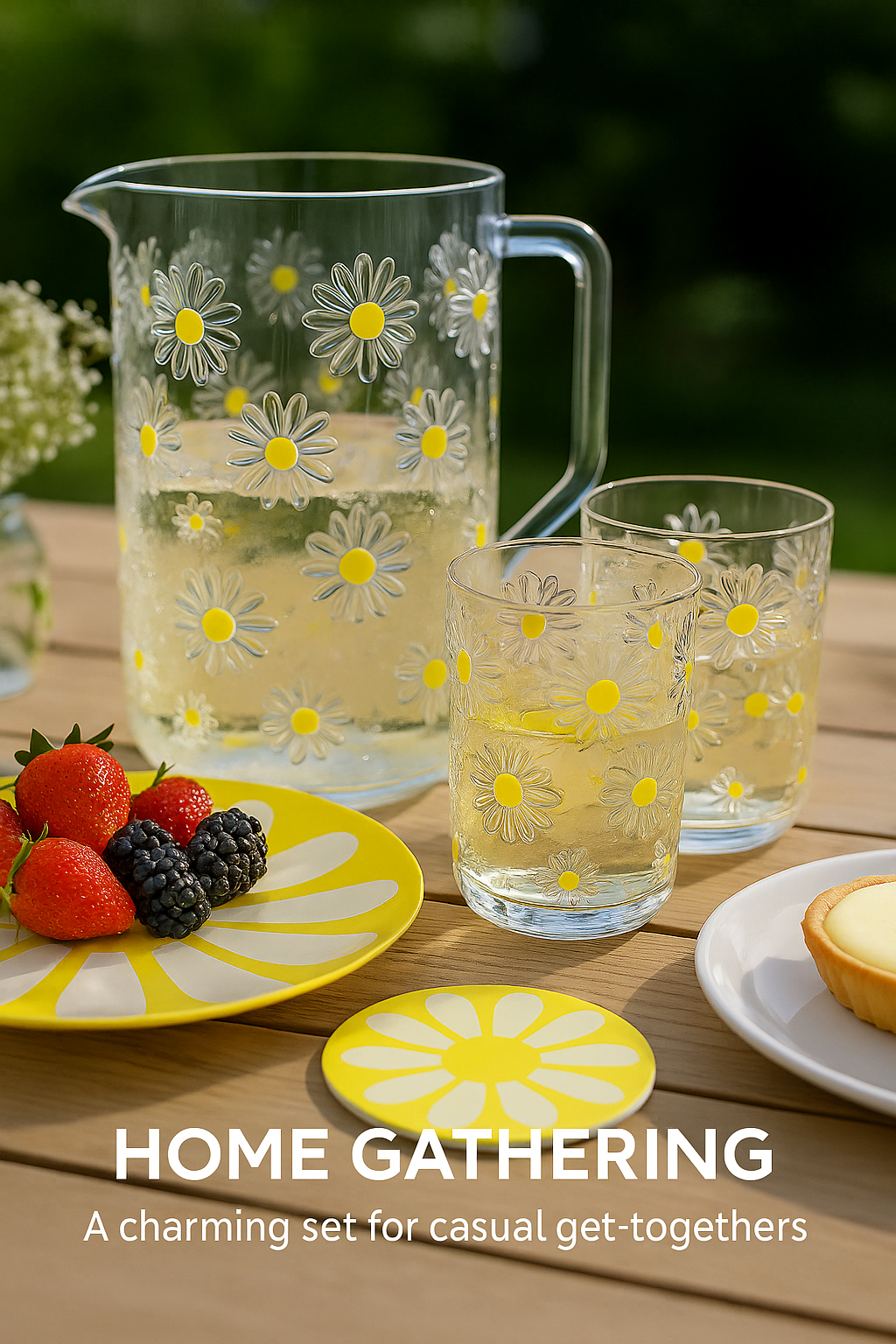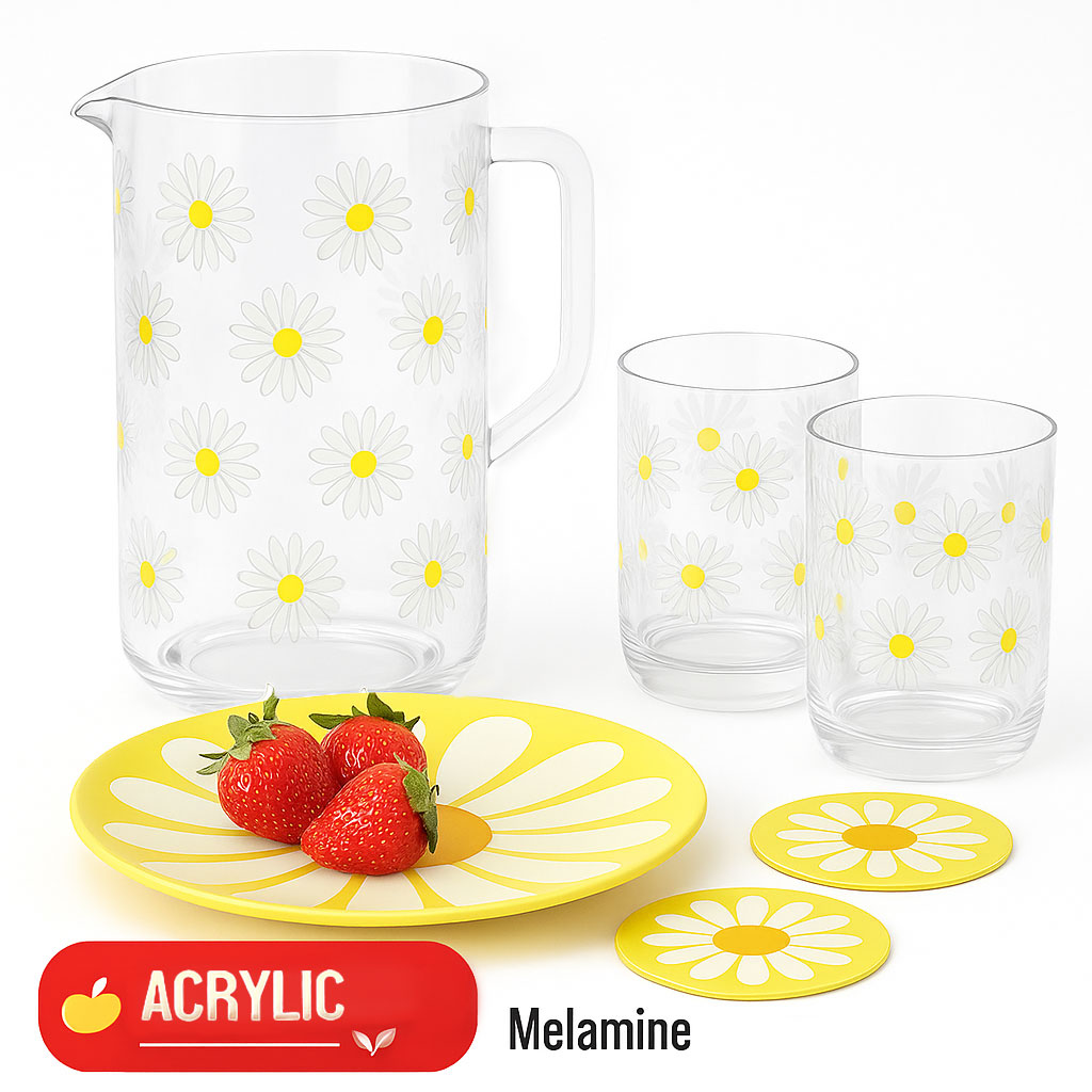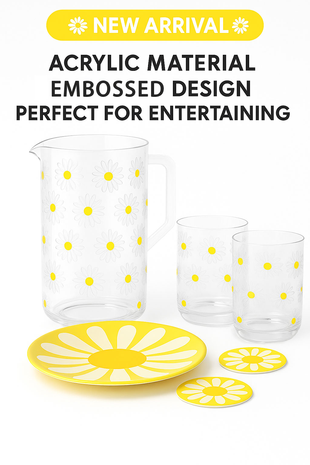 1. Design ConceptSymbolizing freshness and joy, daisies come to life in this collection through embossed floral patterns on acrylic pitchers and tumblers, creating a tactile and elegant 3D effect. Paired with vibrant yellow melamine plates and coasters, the set brings a lively, summer-inspired atmosphere to any table—blending nature’s charm with everyday function.