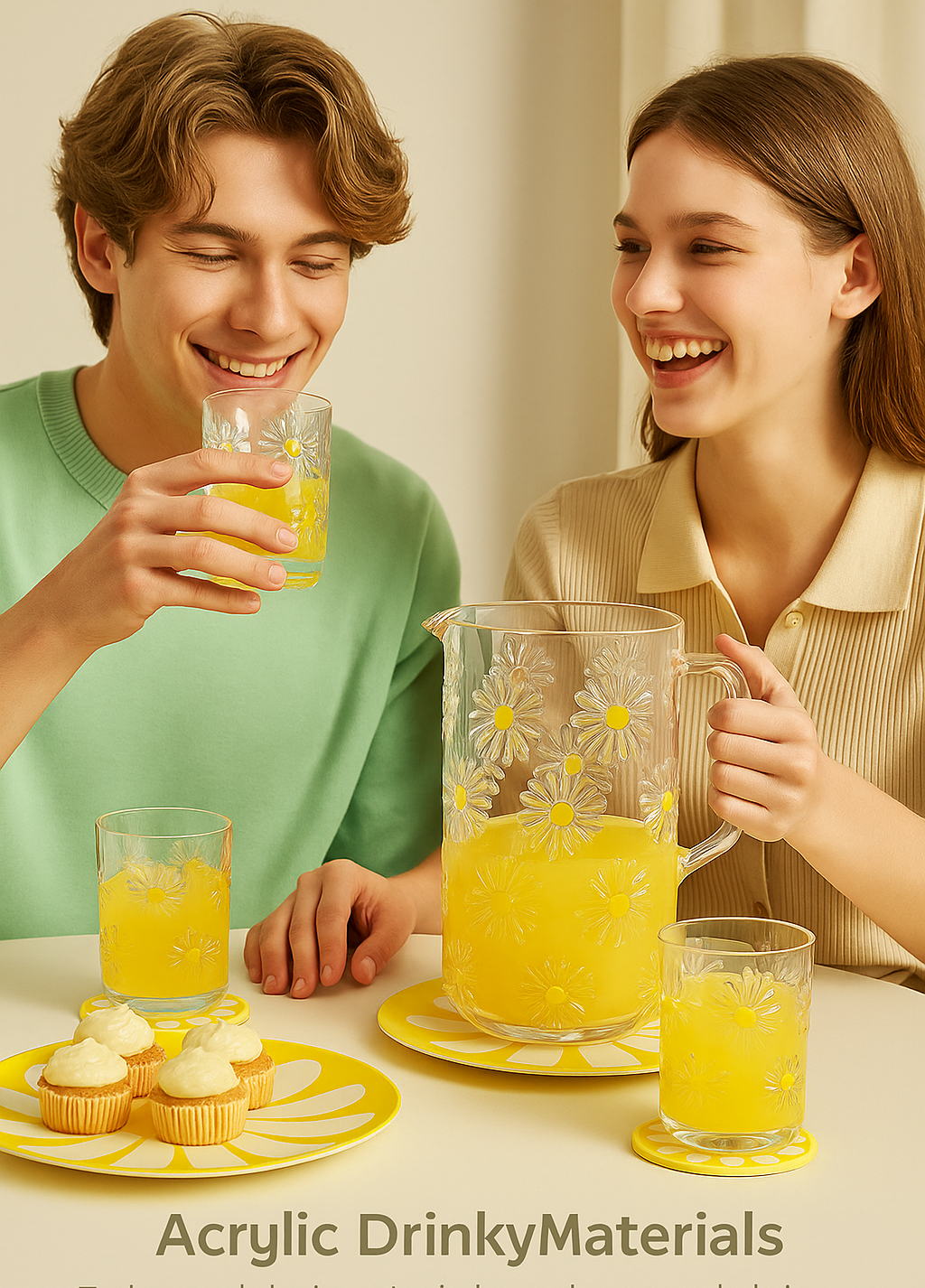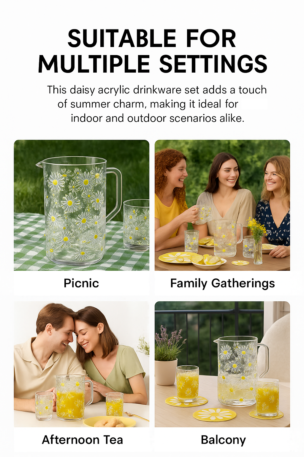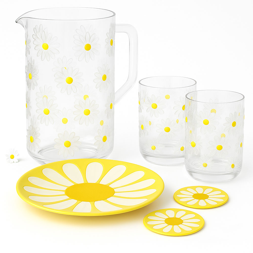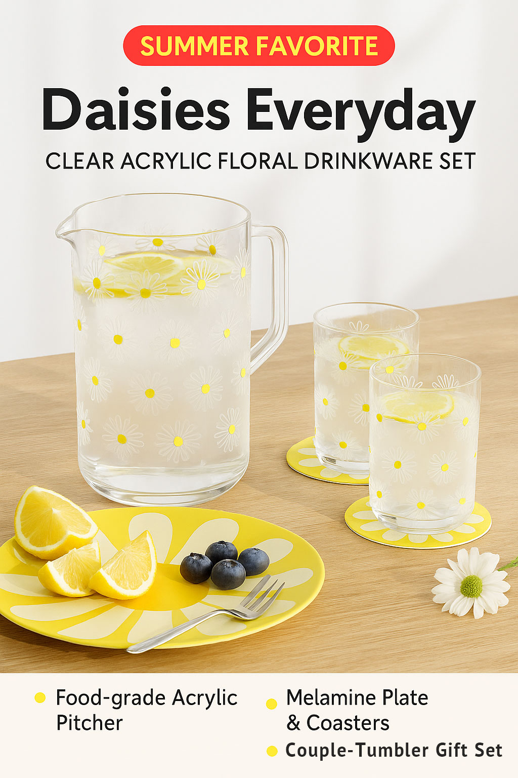 1. Design ConceptSymbolizing freshness and joy, daisies come to life in this collection through embossed floral patterns on acrylic pitchers and tumblers, creating a tactile and elegant 3D effect. Paired with vibrant yellow melamine plates and coasters, the set brings a lively, summer-inspired atmosphere to any table—blending nature’s charm with everyday function.