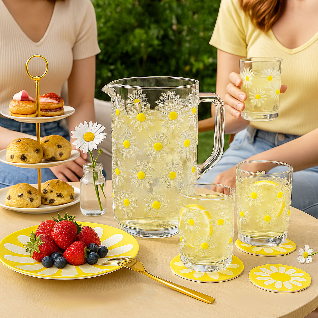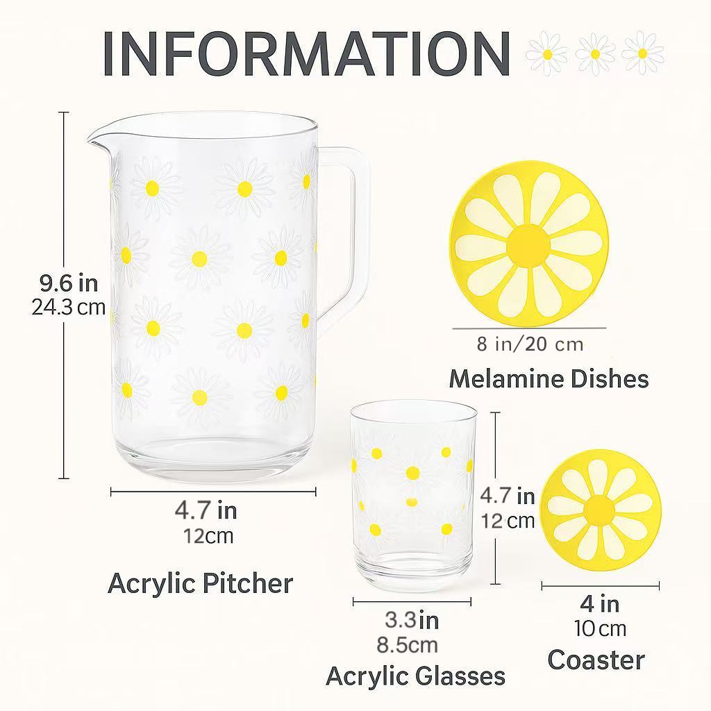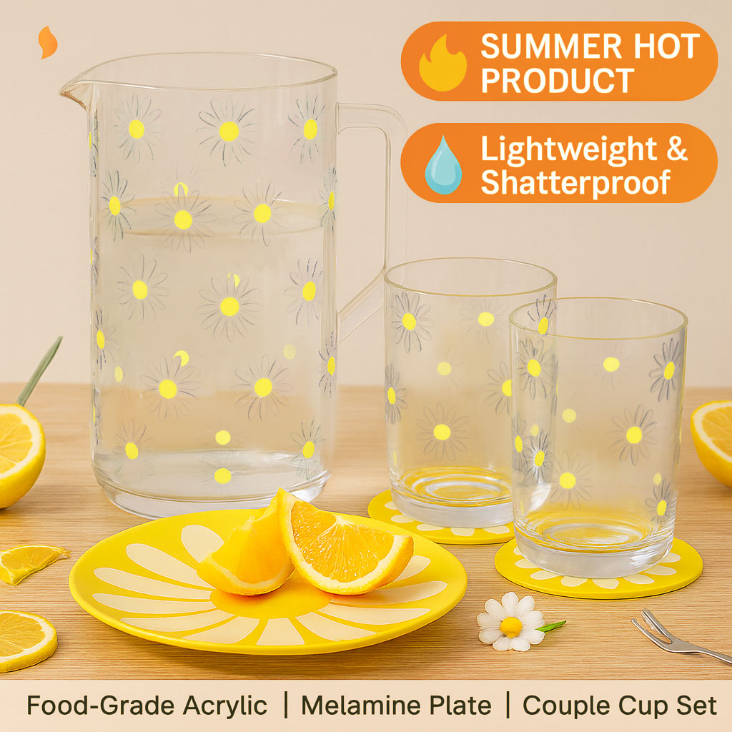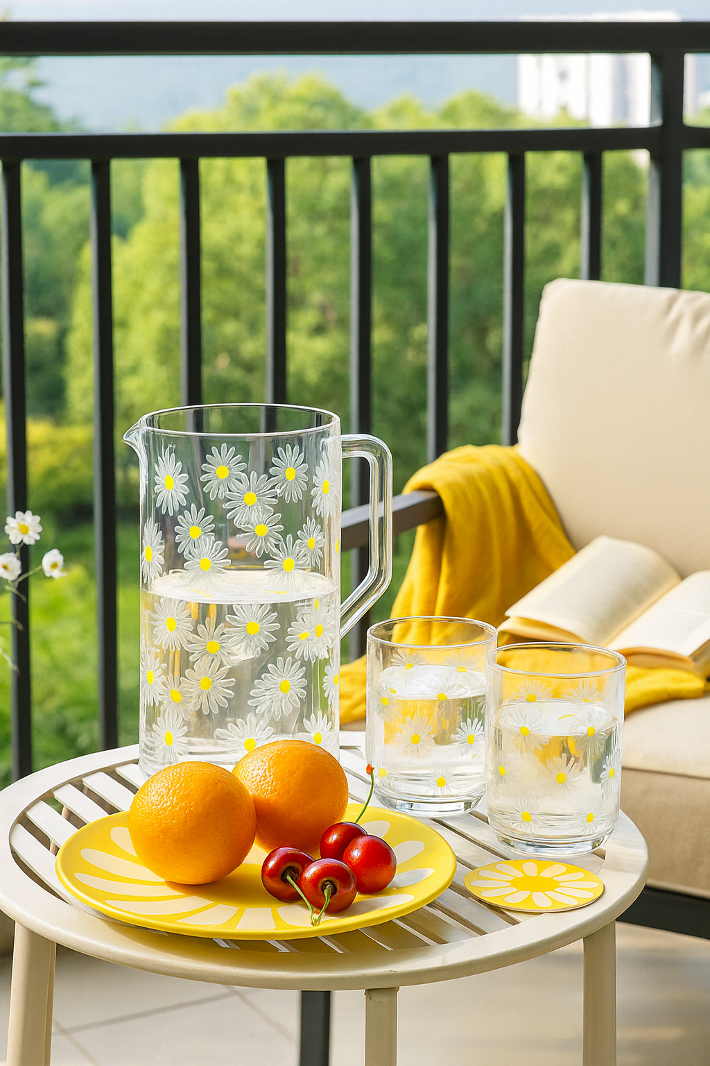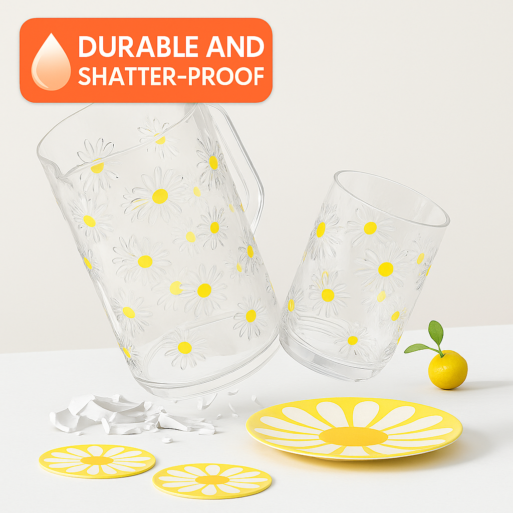1. Design ConceptSymbolizing freshness and joy, daisies come to life in this collection through embossed floral patterns on acrylic pitchers and tumblers, creating a tactile and elegant 3D effect. Paired with vibrant yellow melamine plates and coasters, the set brings a lively, summer-inspired atmosphere to any table—blending nature’s charm with everyday function.