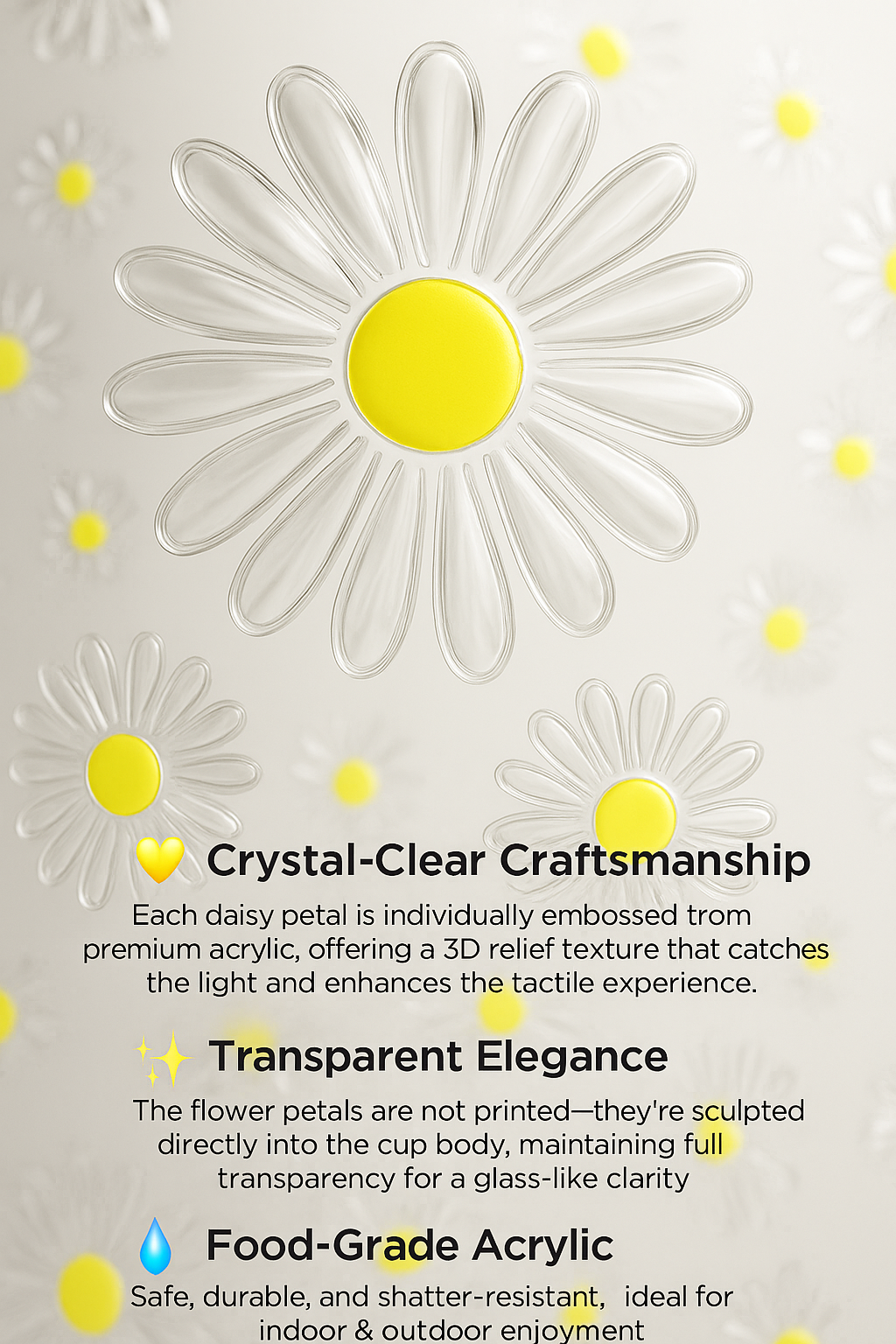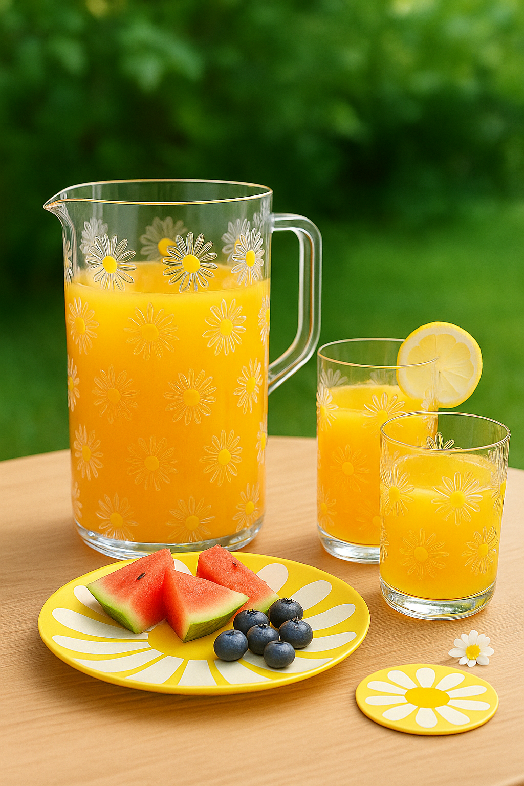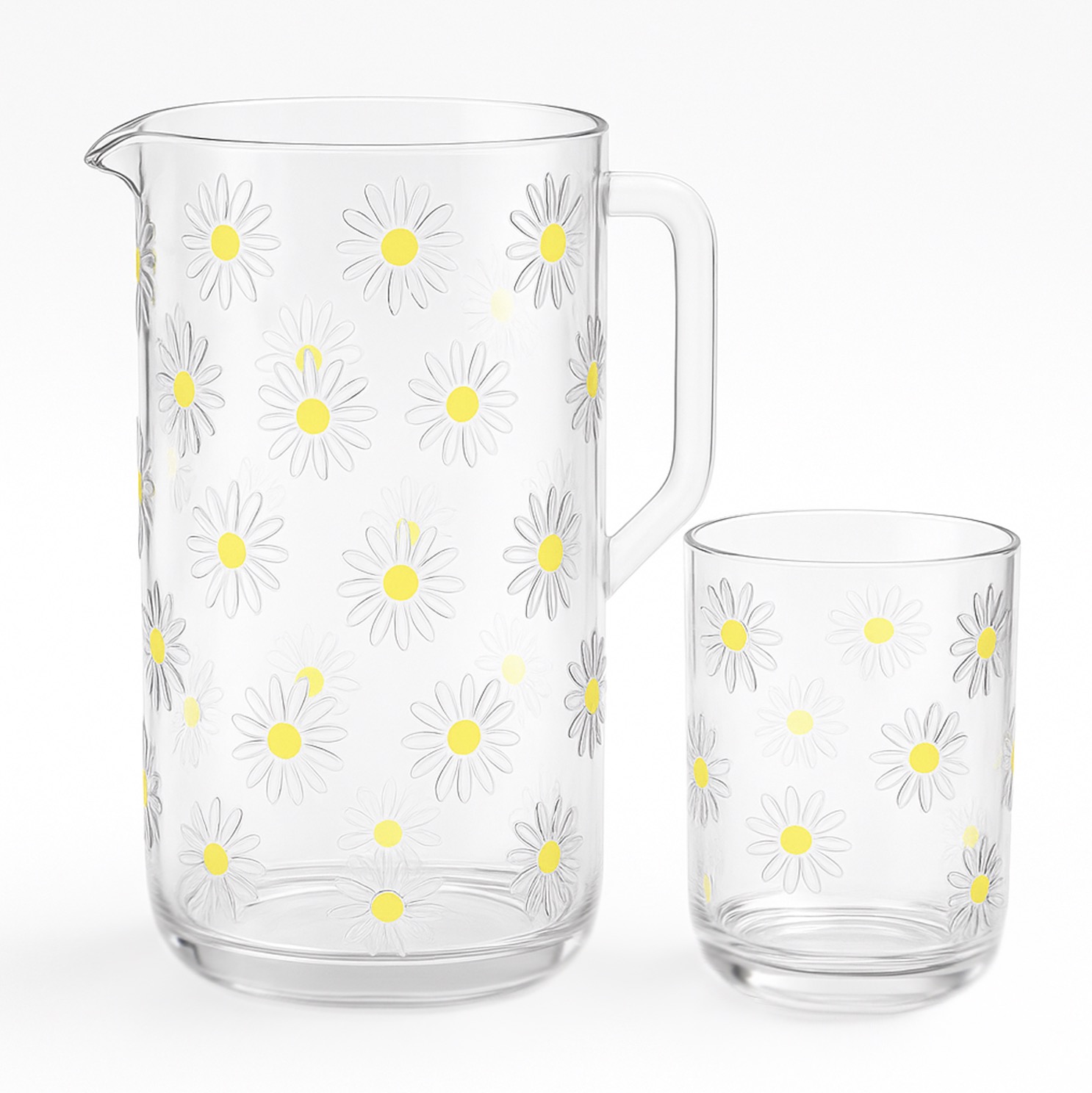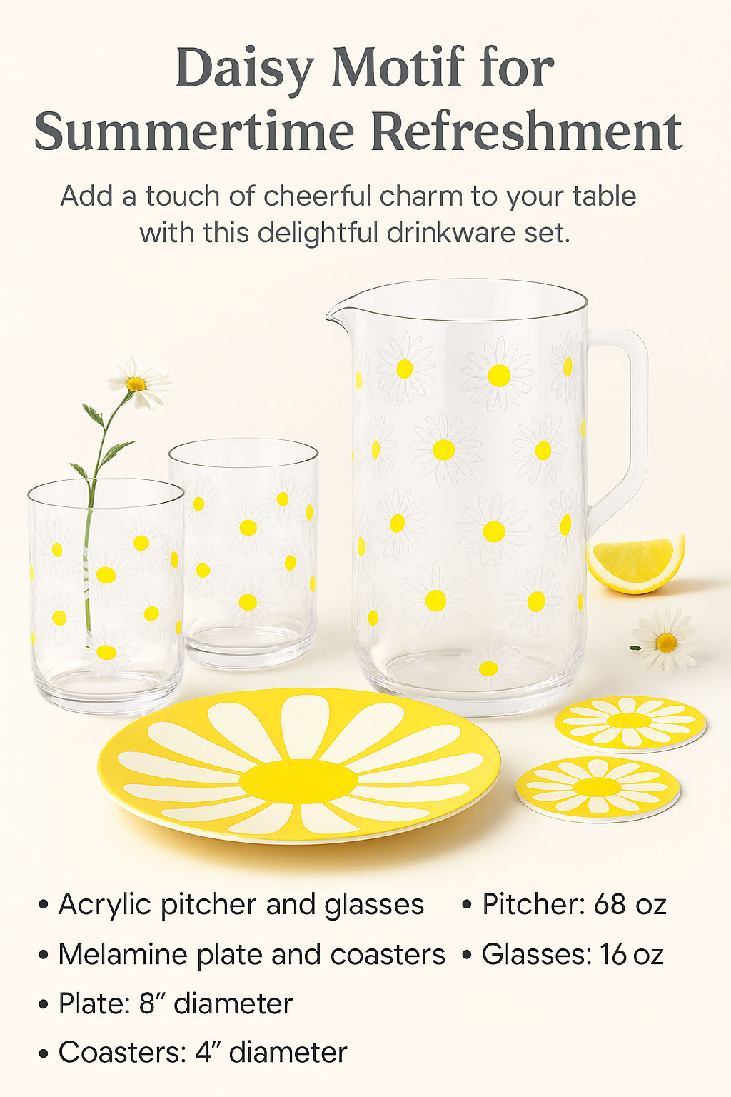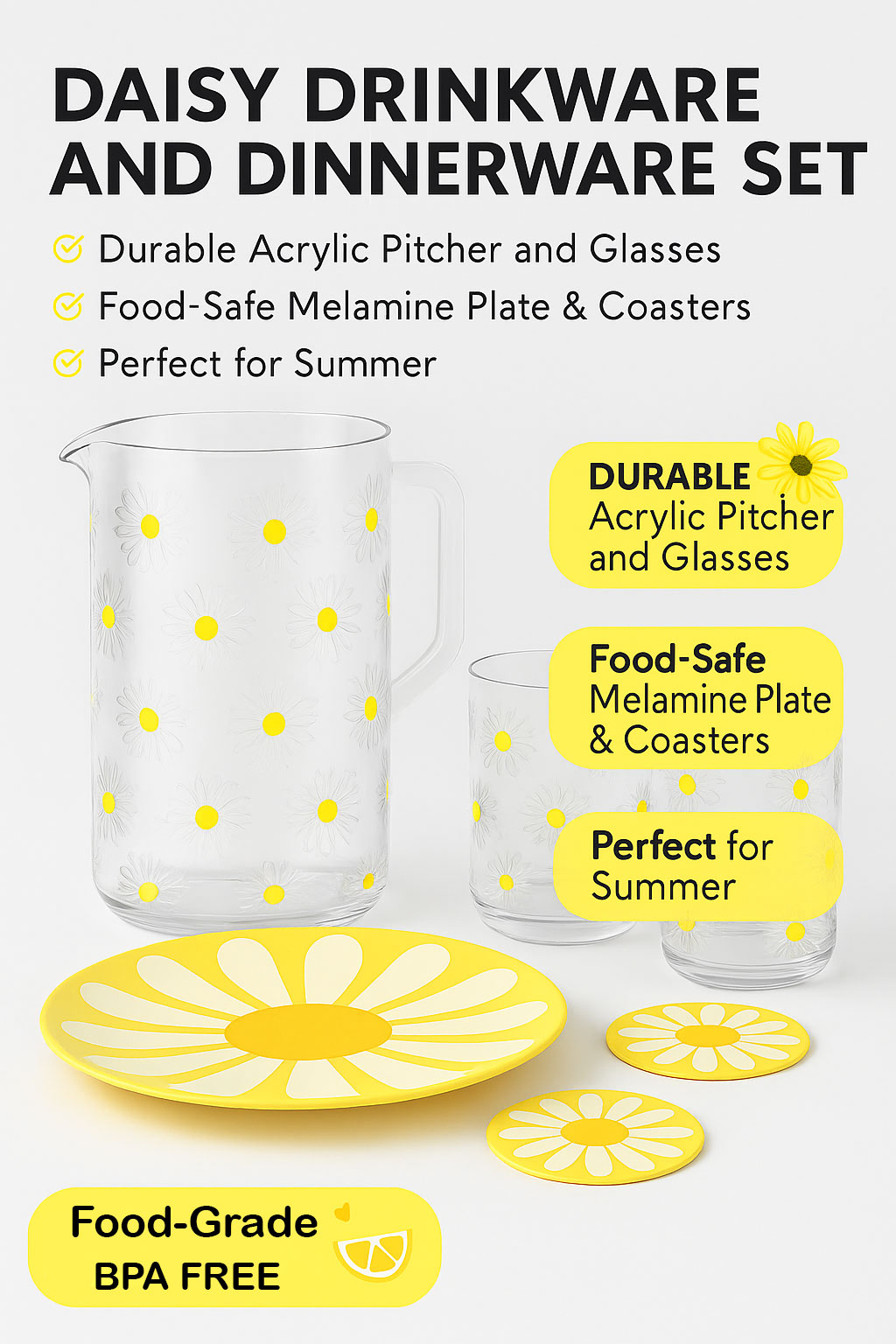 1. Design ConceptSymbolizing freshness and joy, daisies come to life in this collection through embossed floral patterns on acrylic pitchers and tumblers, creating a tactile and elegant 3D effect. Paired with vibrant yellow melamine plates and coasters, the set brings a lively, summer-inspired atmosphere to any table—blending nature’s charm with everyday function.