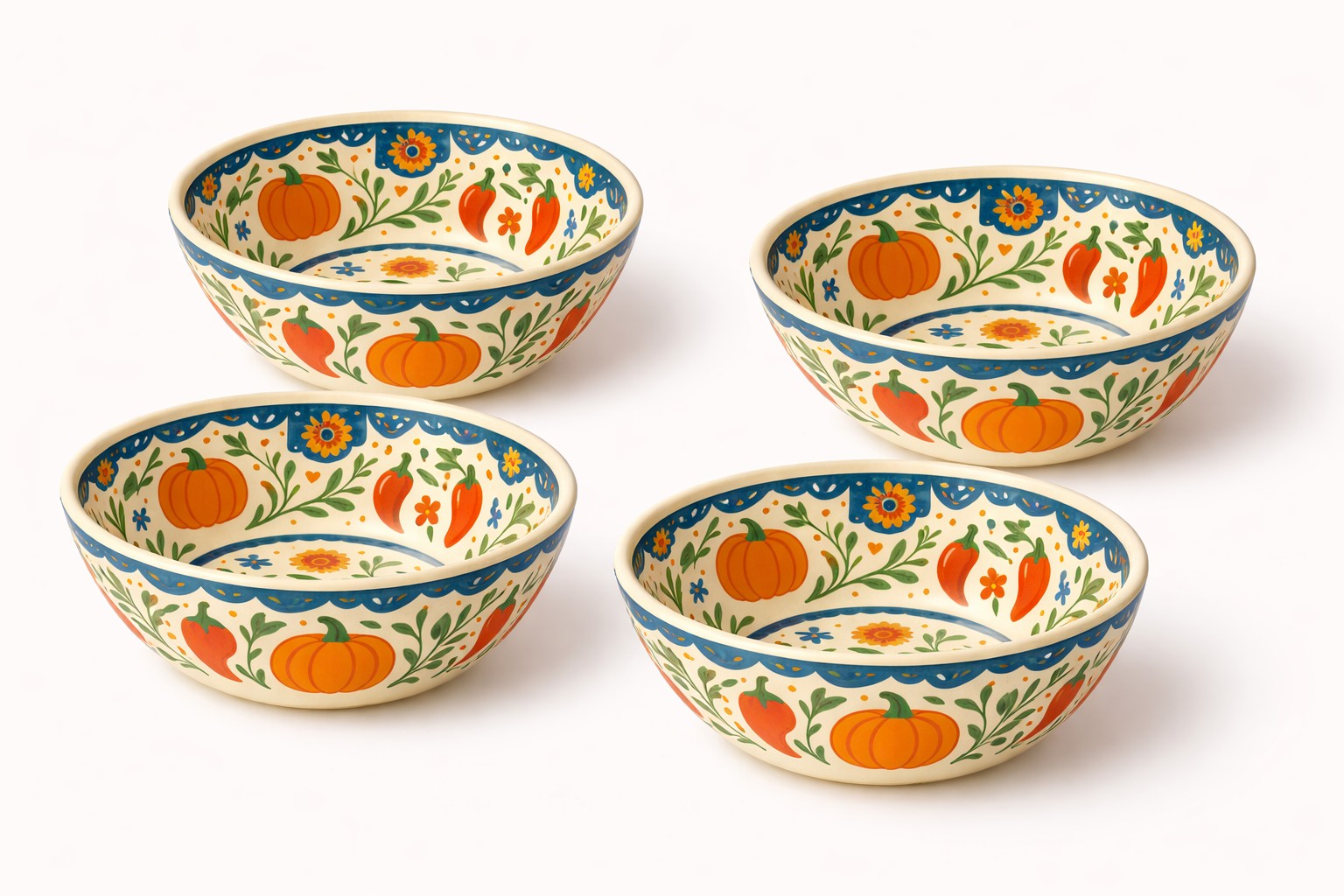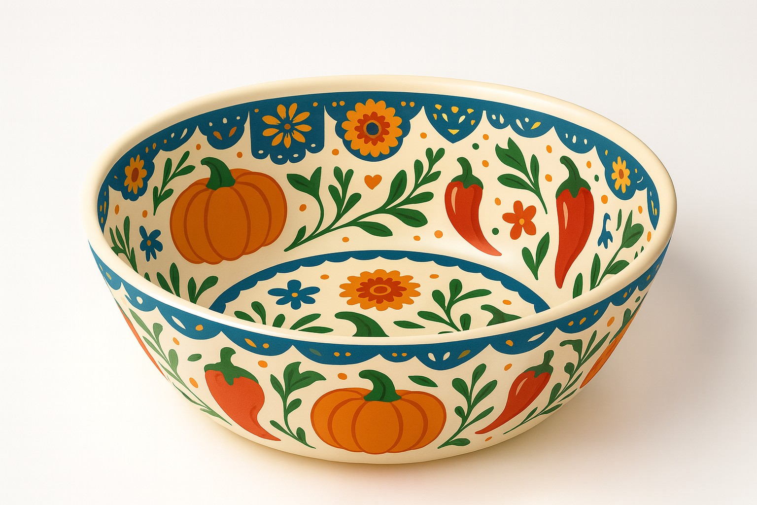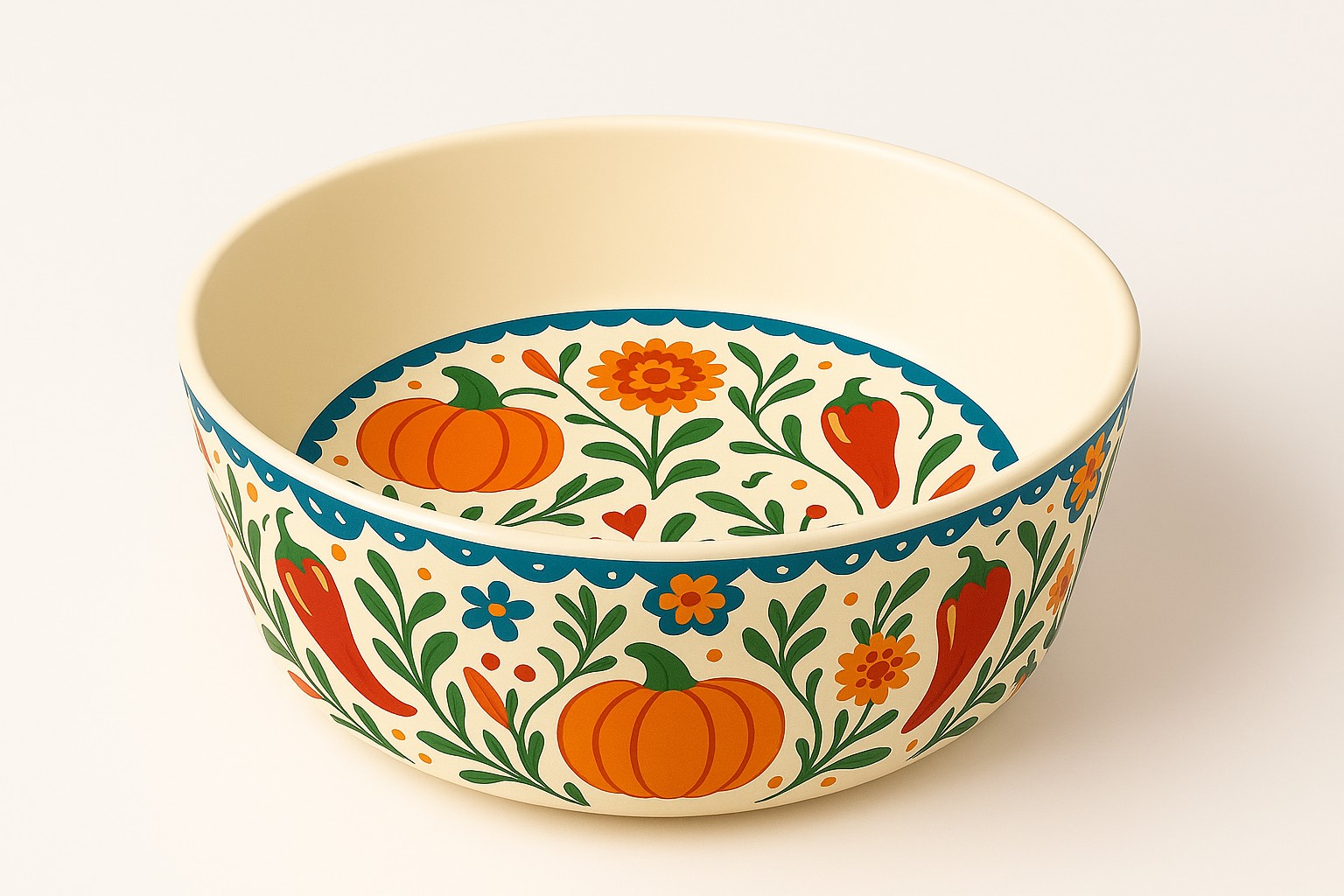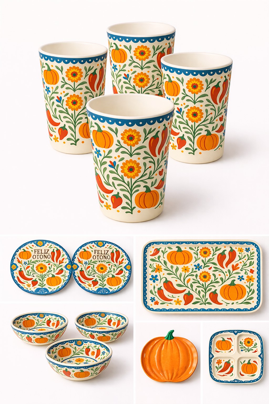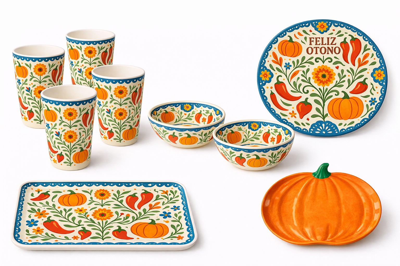 A distinctive Mexican harvest aesthetic featuring pumpkin, chili, and floral folk art motifs.