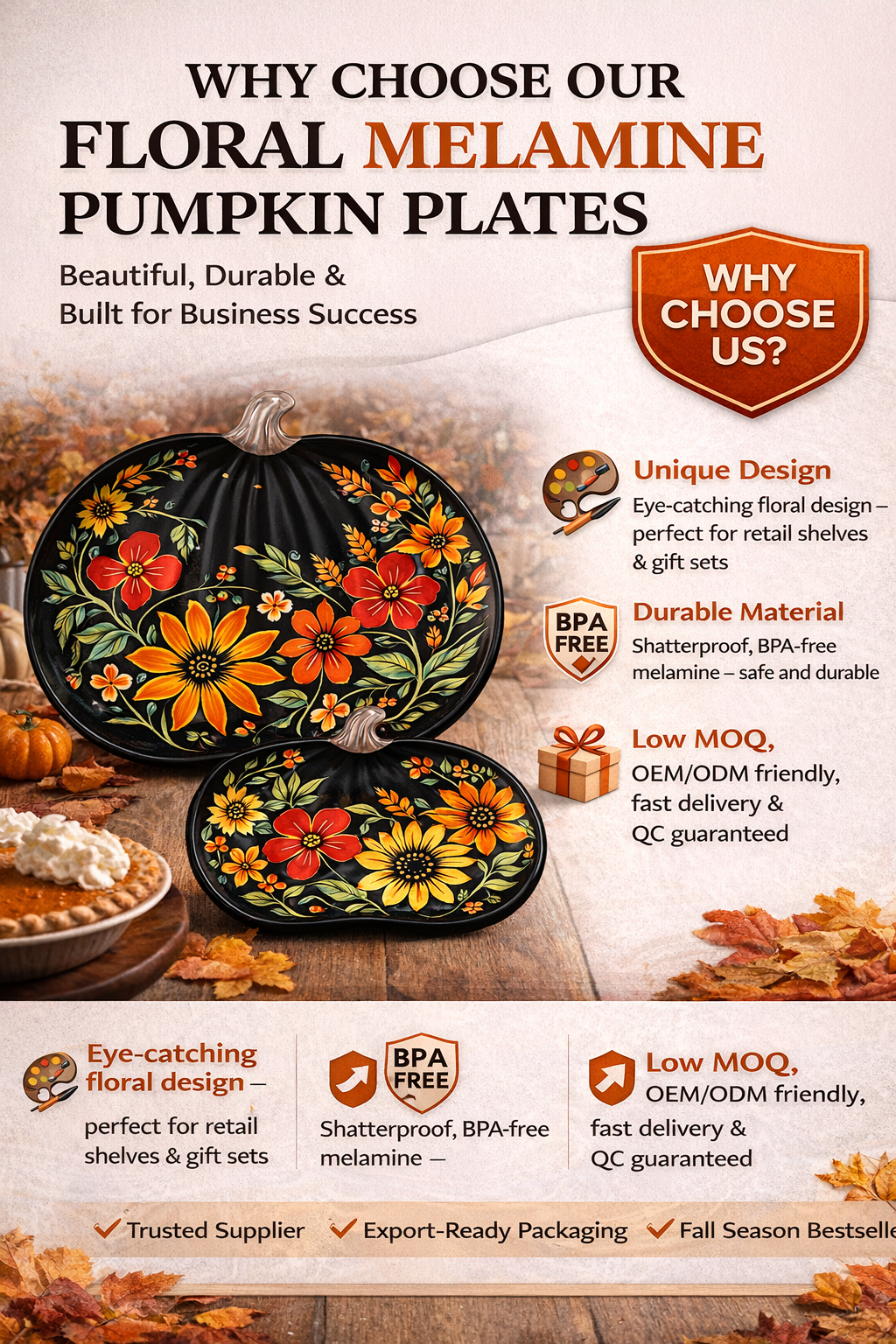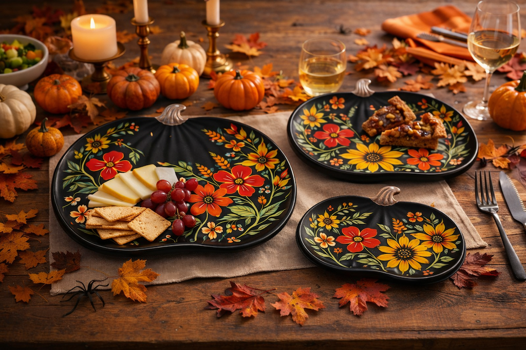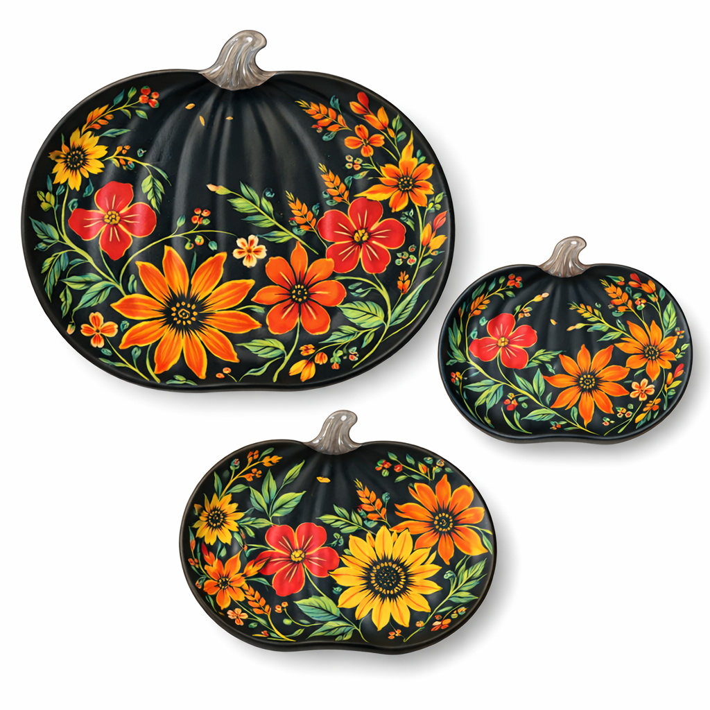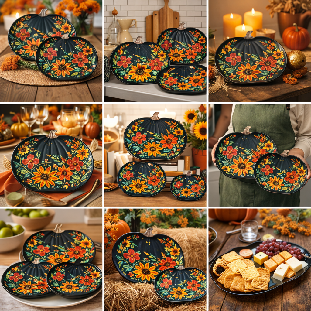 Pumpkin-shaped plates in Large, Medium, and Small sizes layer beautifully for a styled, balanced table.