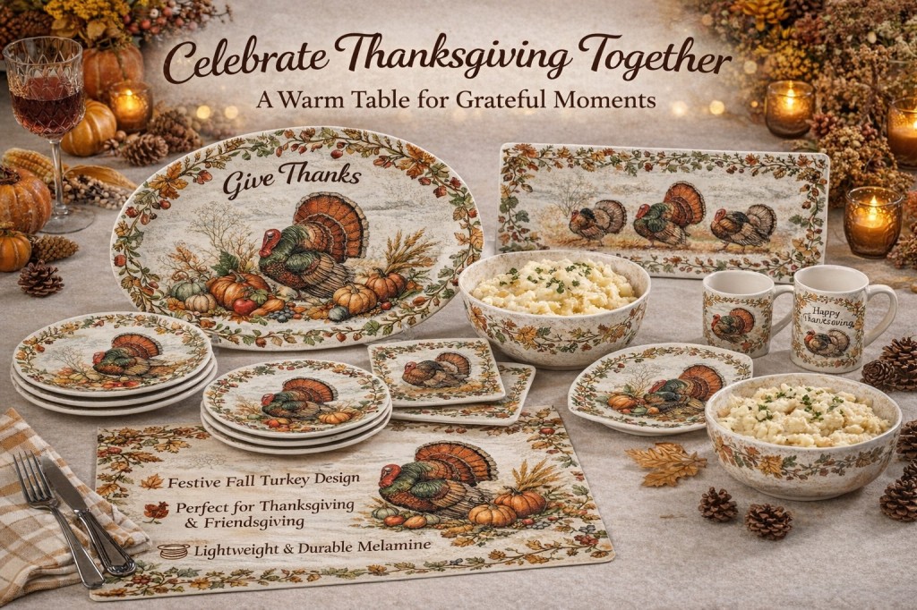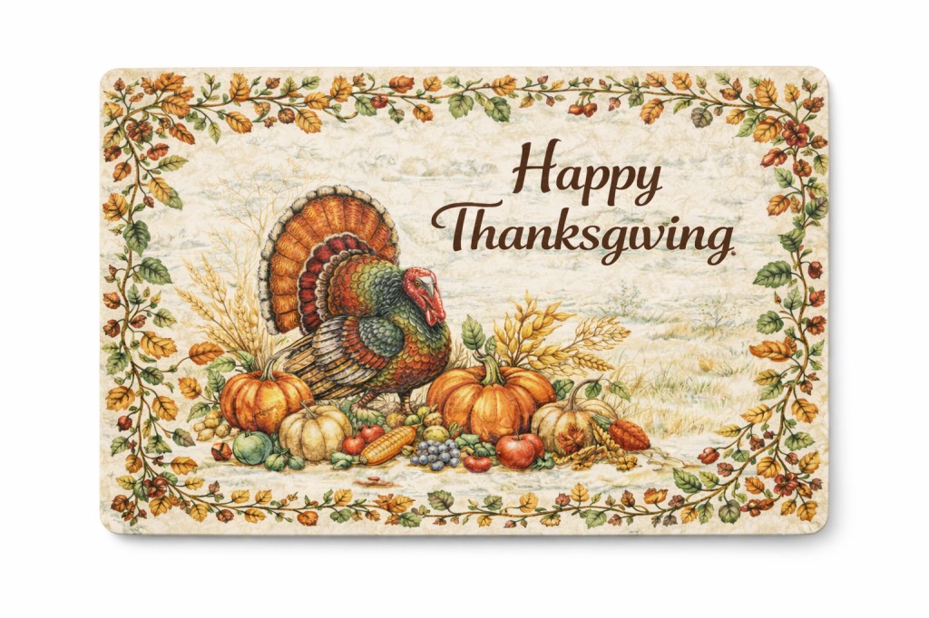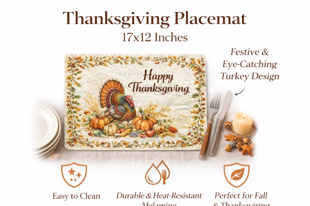 Commercial-grade Thanksgiving placemat designed for restaurants, catering companies, hotels and seasonal retail programs in the North American market. Festive turkey & fall design, ideal for high-volume holiday use.