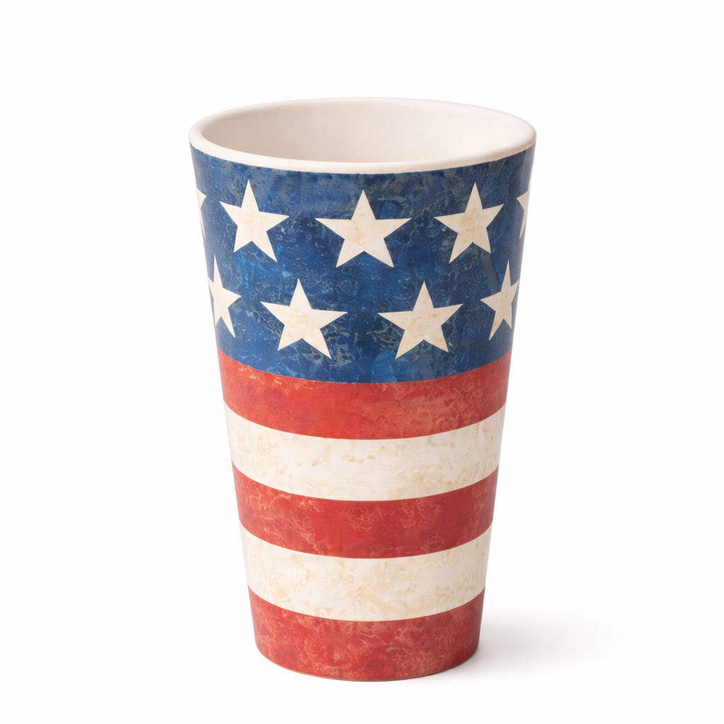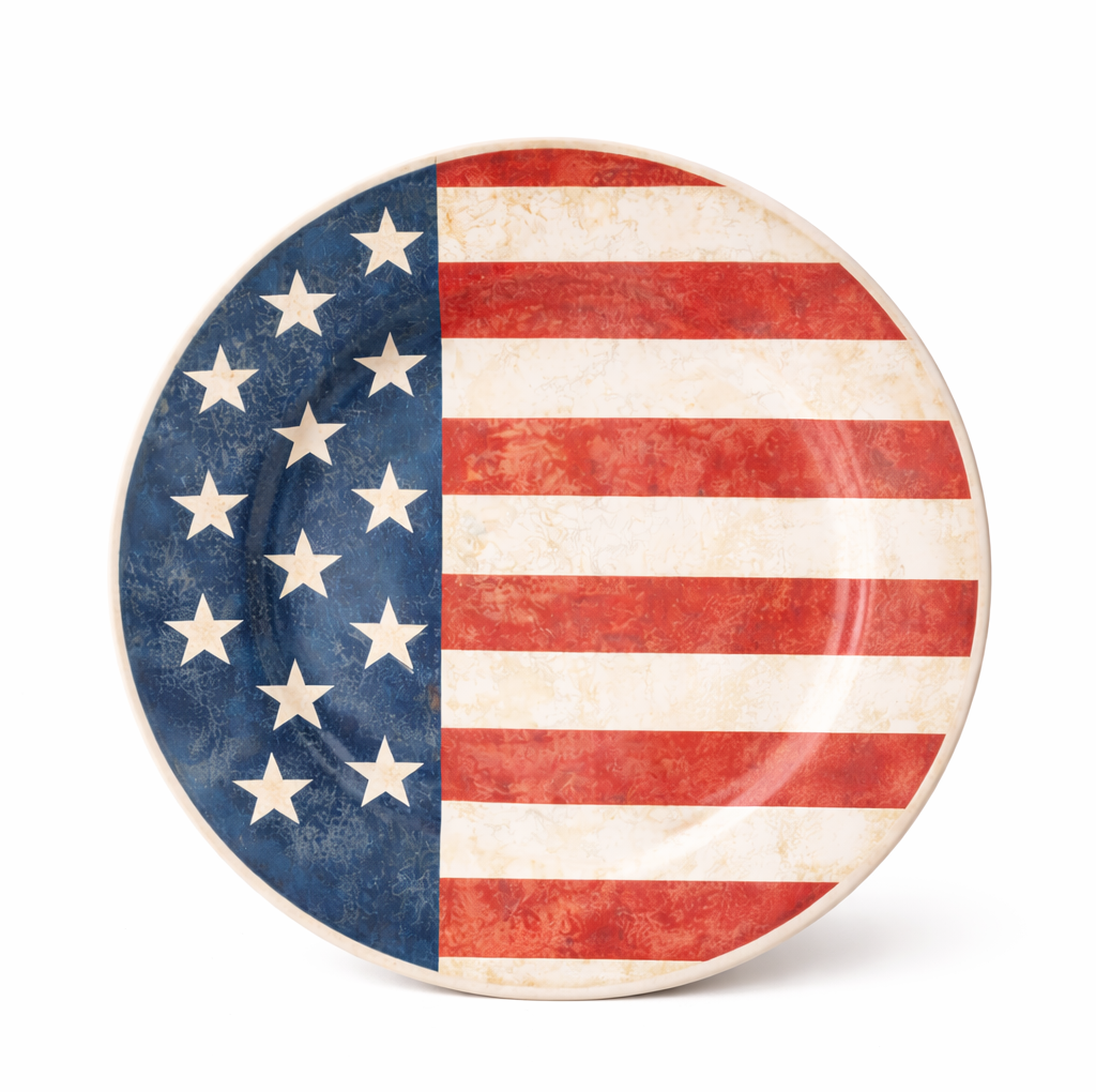 Features a bold USA flag layout with a vintage finish, well suited for patriotic, seasonal and themed tableware collections.