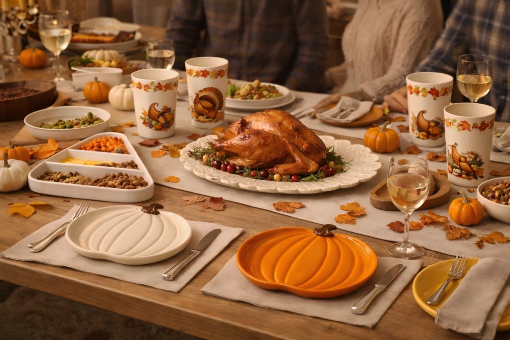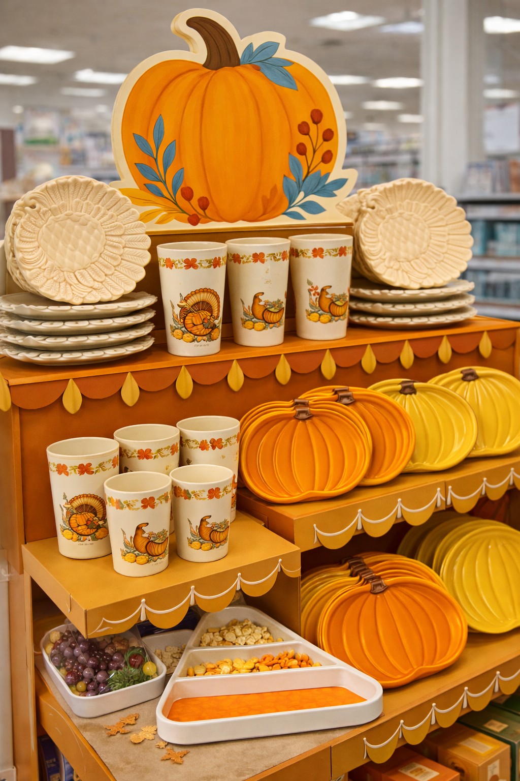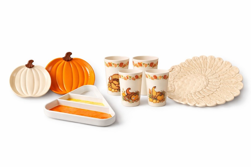 Includes turkey platter, pumpkin plates, corn candy tray & cups
