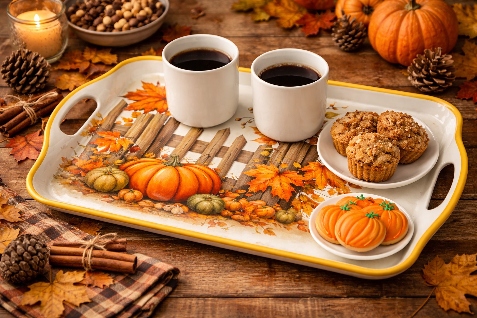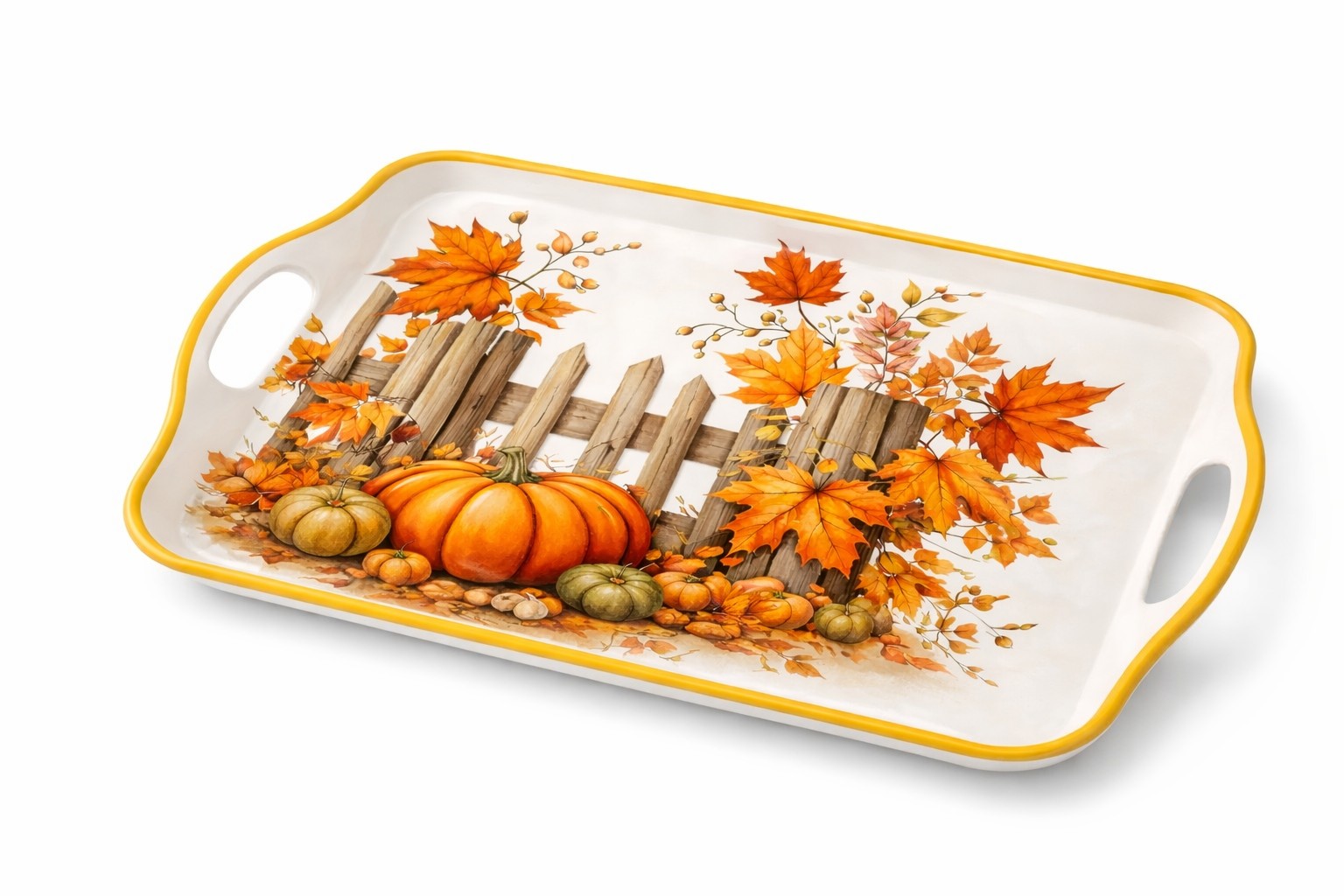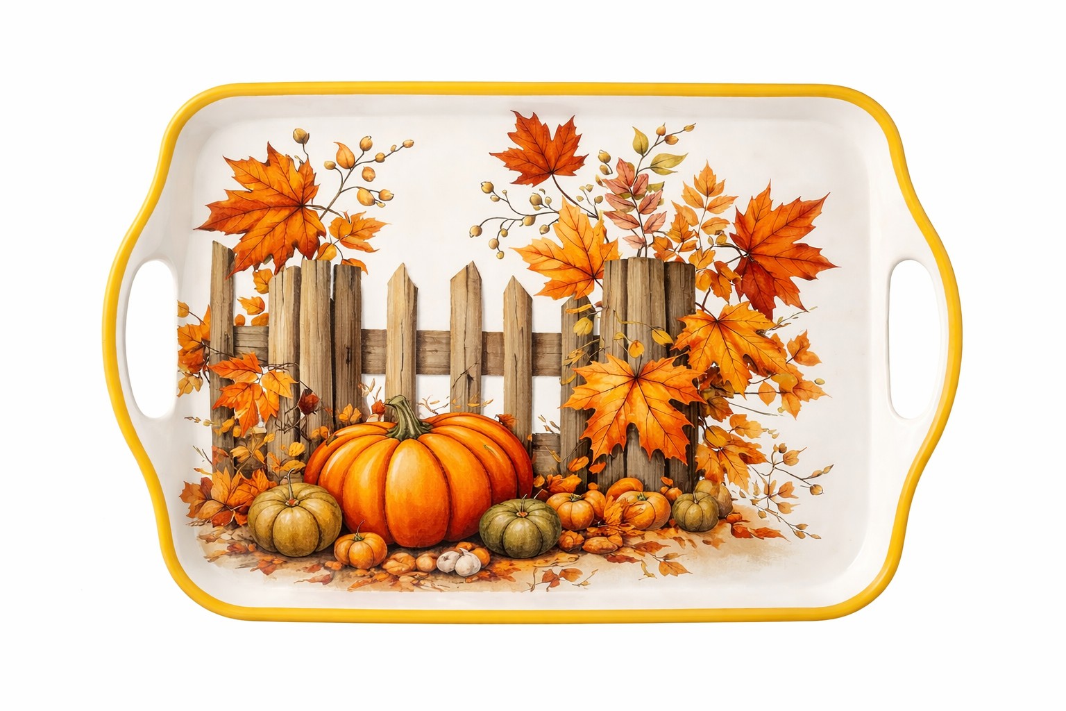 Fall Harvest Pumpkin Melamine Serving Tray featuring an autumn harvest pumpkin design. Made of durable and lightweight melamine, this melamine serving tray is suitable for fall and Thanksgiving seasonal dining, serving, and display.